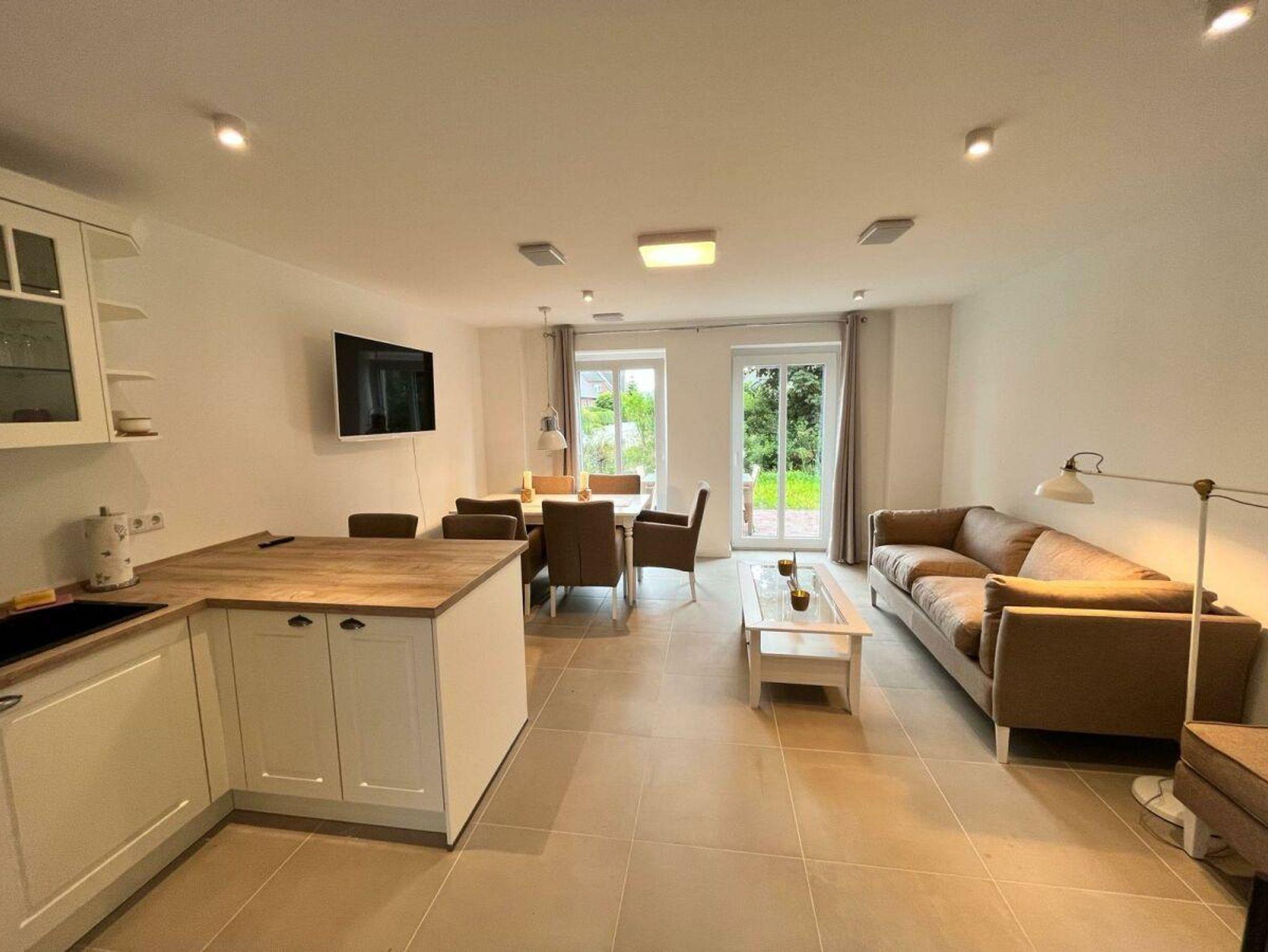 Traumhaftes Neubau - Friesenhaus, geschmackvoll und sonnig eingerichtet in weiß und beige Tönen. Hiermit können wir Ihnen das auf den Bildern mittlere Friesenhaus anbieten. Auf den Grundrissen ist es mit WE 3 bezeichnet. Die Terrasse ist nach Süden. ausgerichtet- . Moderne Gartenmöbel und ein Weber Grill stehen dort zur Verfügung .