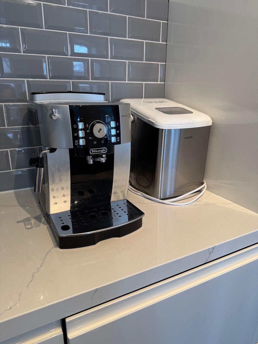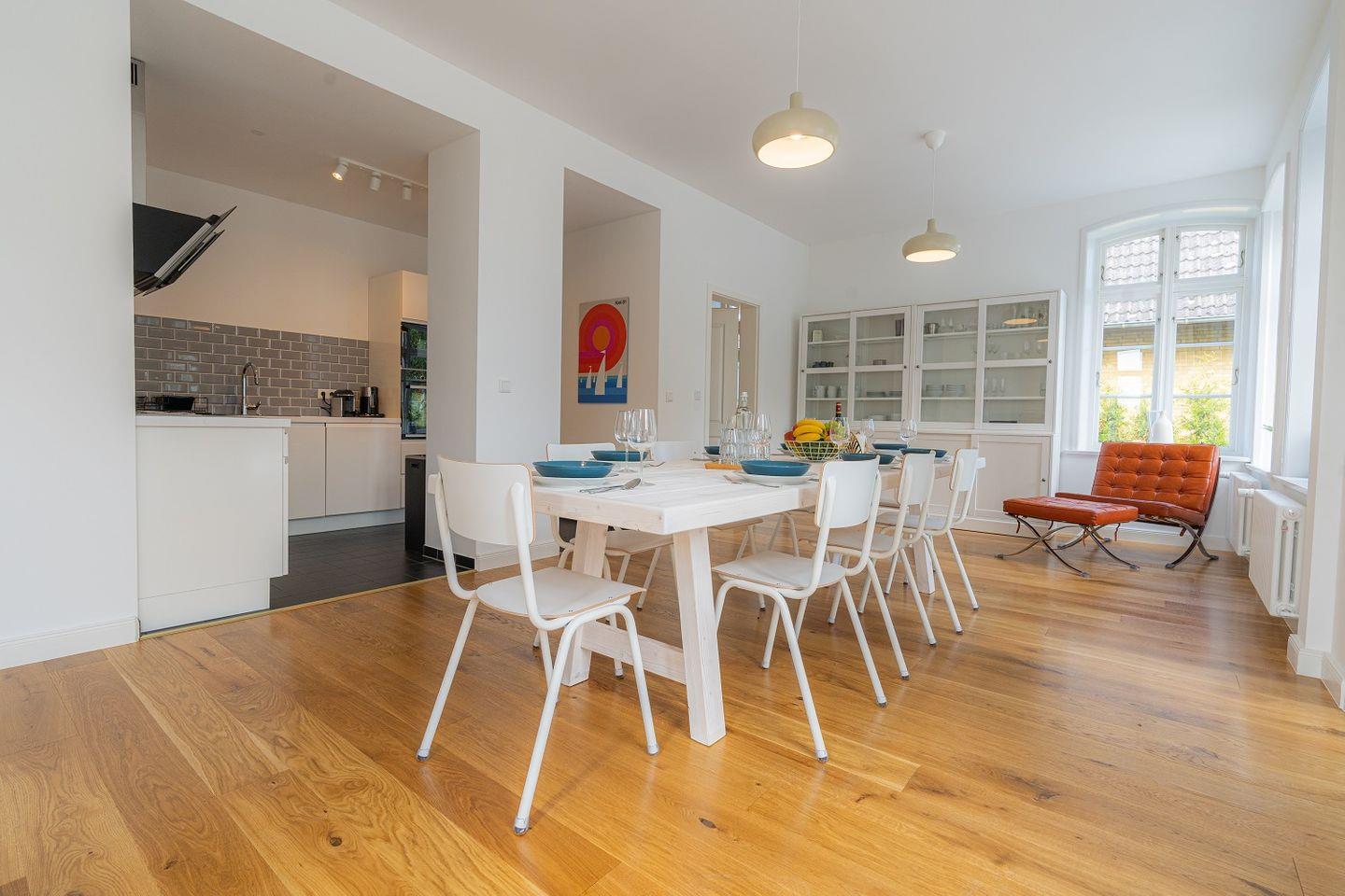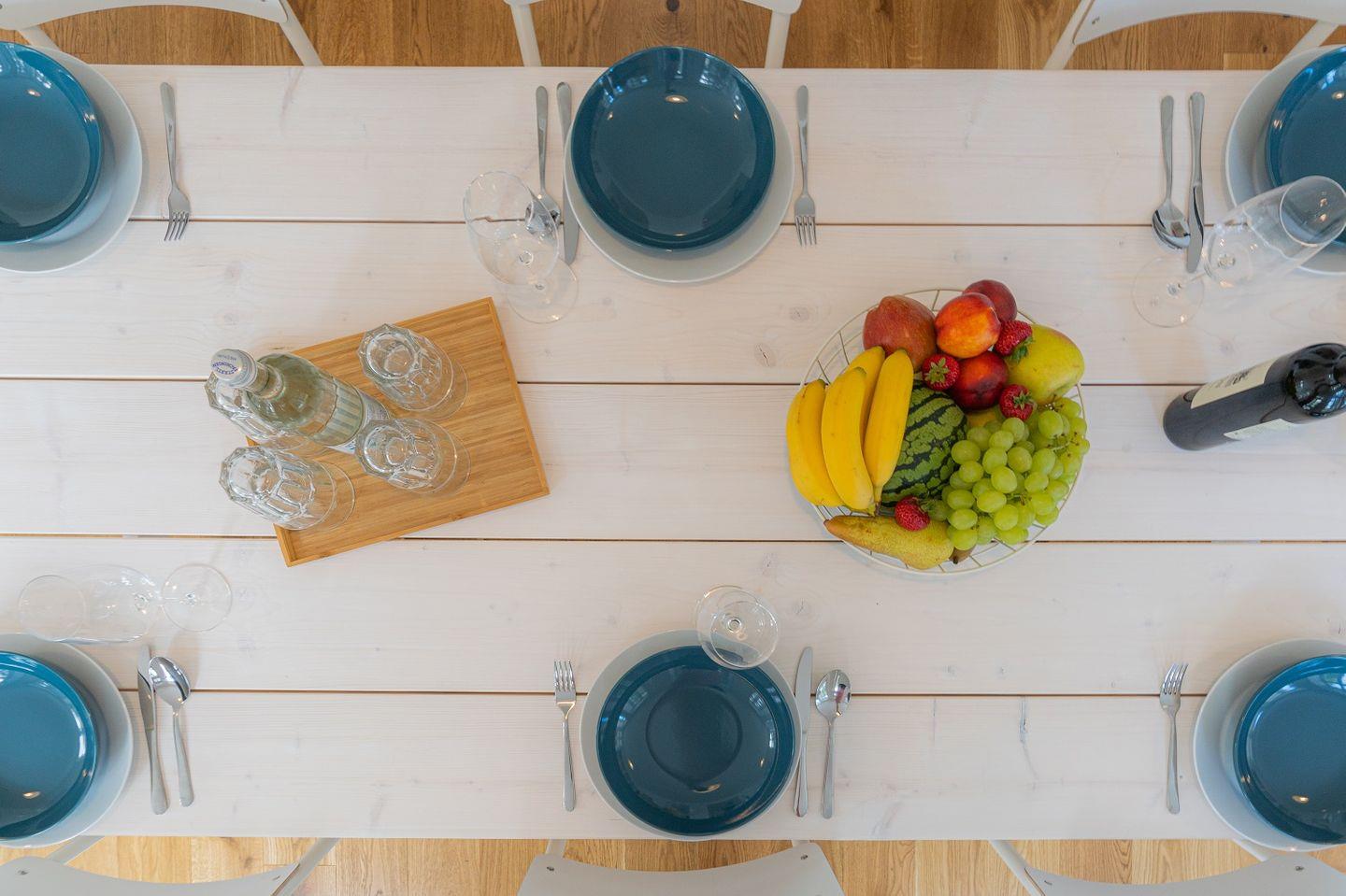 Große offene Essküche (40 qm): 3 m Esstisch, Küche mit Kühlgefrierkombi, Spülmaschine, Espressomaschine, Eiswürfelmaschine, Mikrowelle, Wasserkocher, Toaster und extra breitem Induktionskochfeld, Kindersitz.