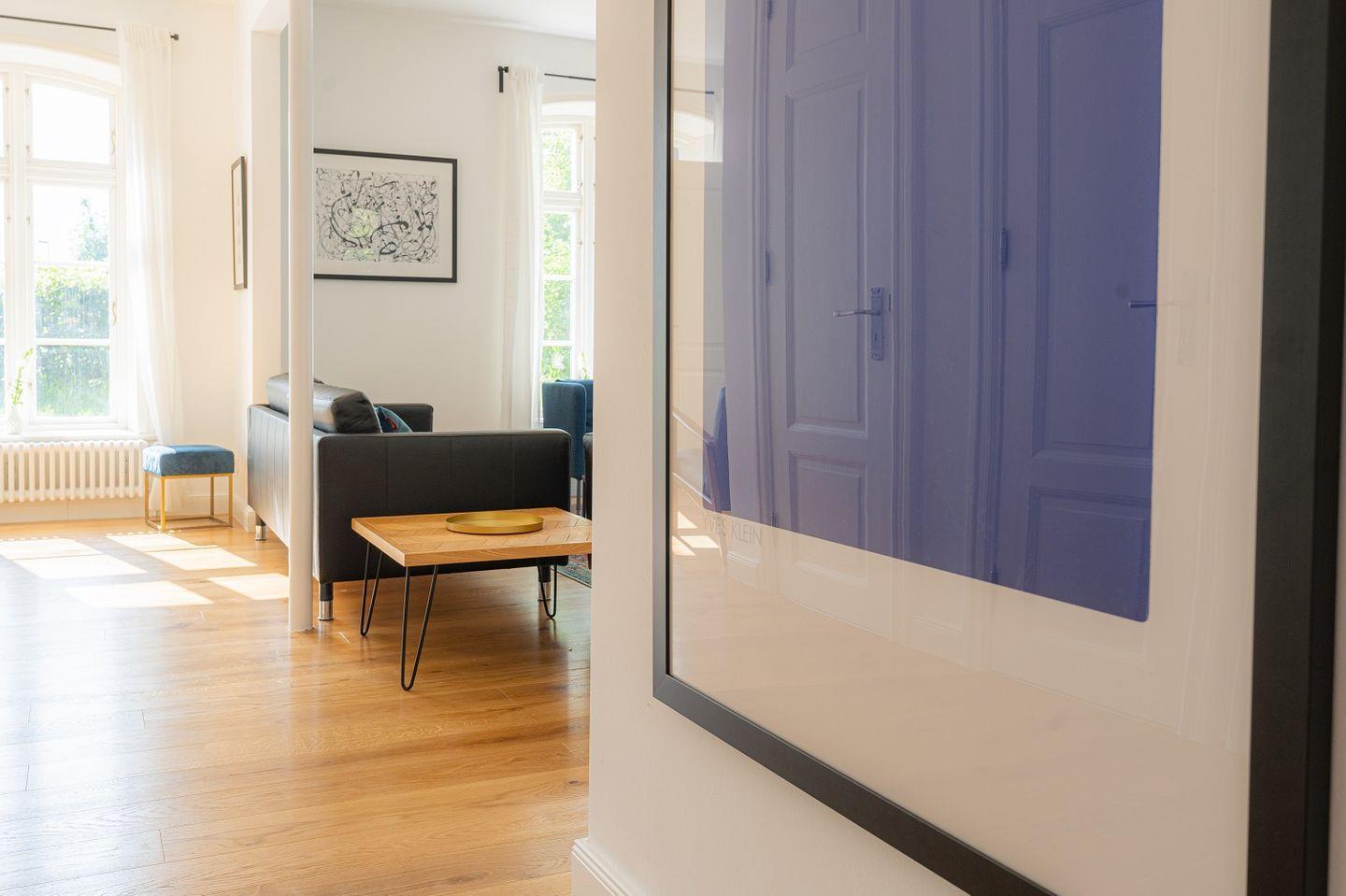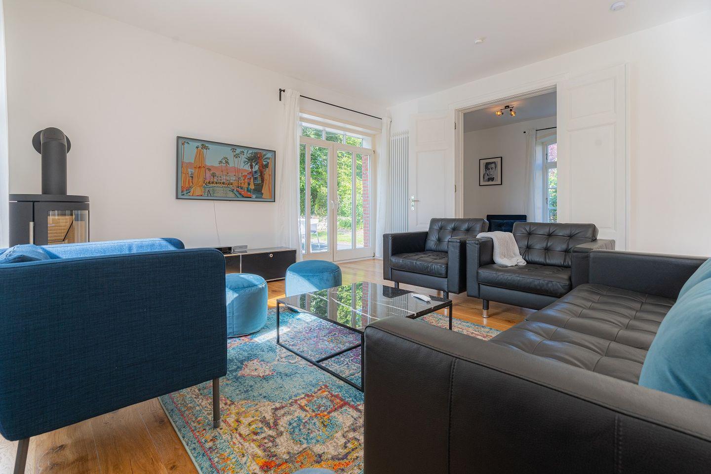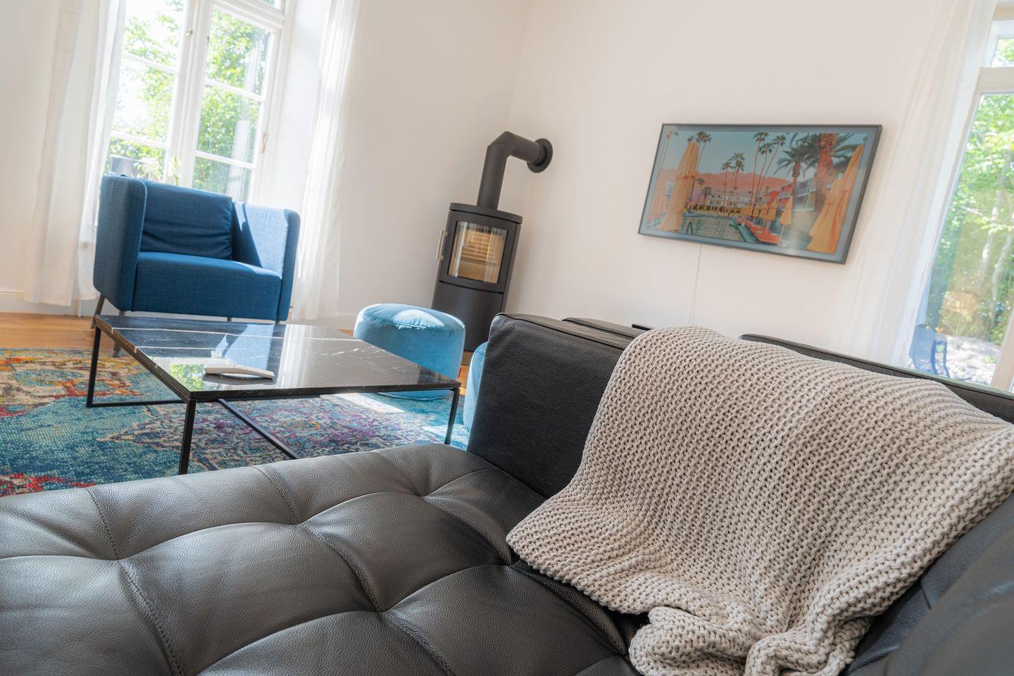 Großes Wohnzimmer (50 qm): Kaminofen, Smart-TV (inkl. Magenta-TV), Bose Bluetooth-Box, Leseecke.