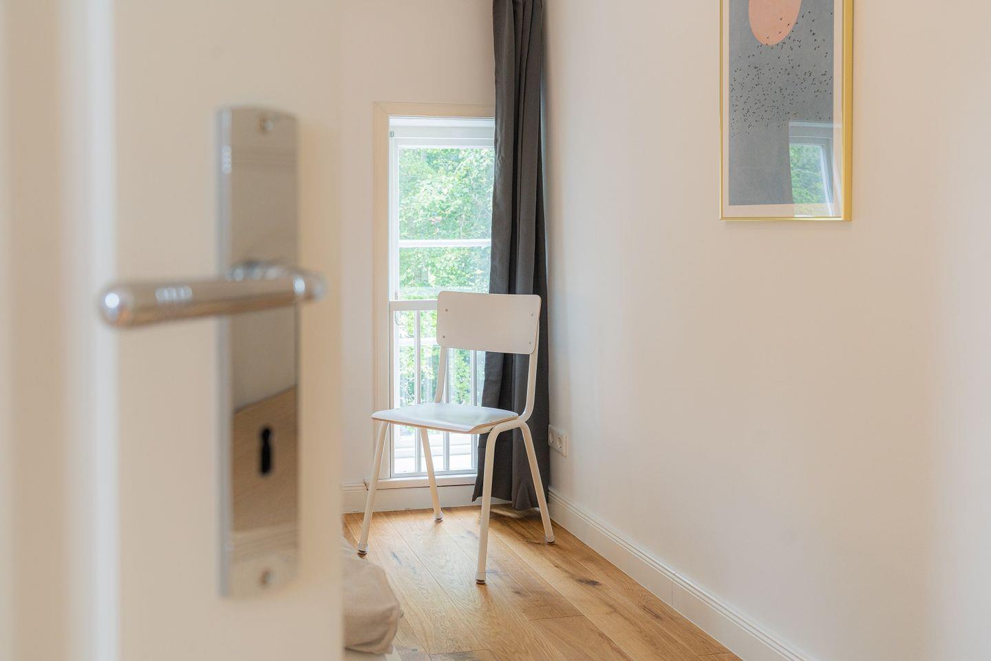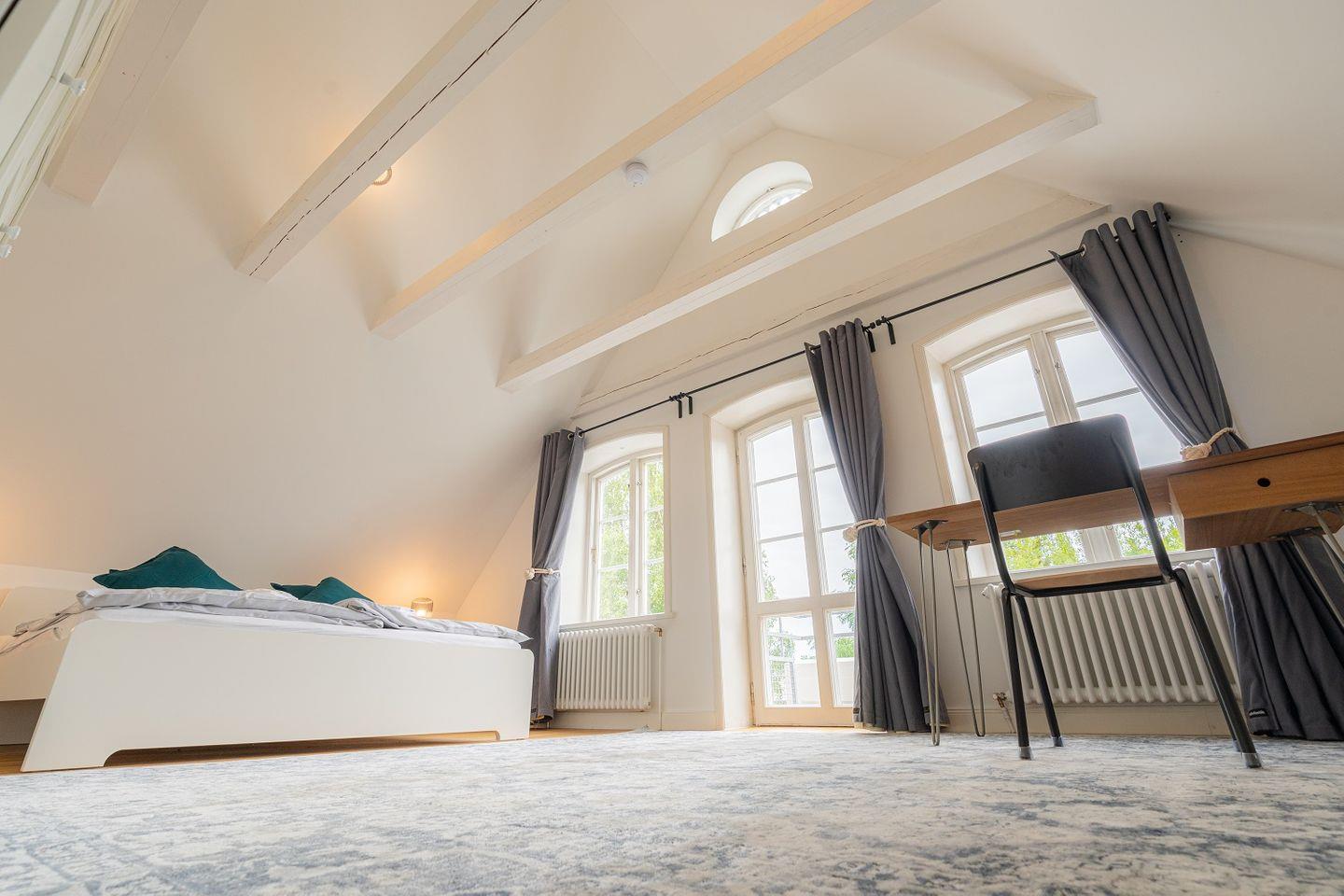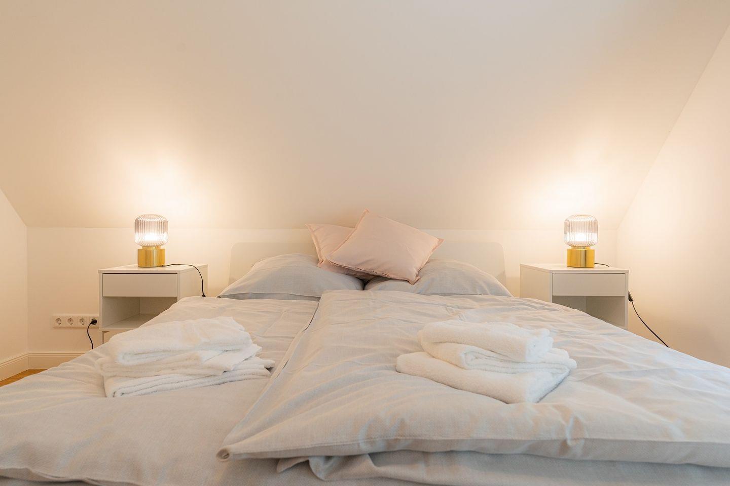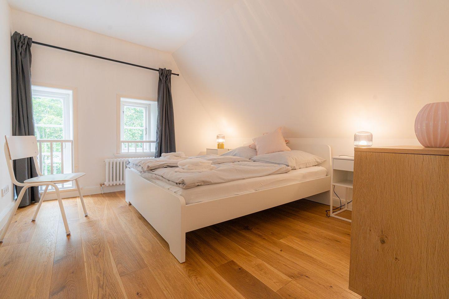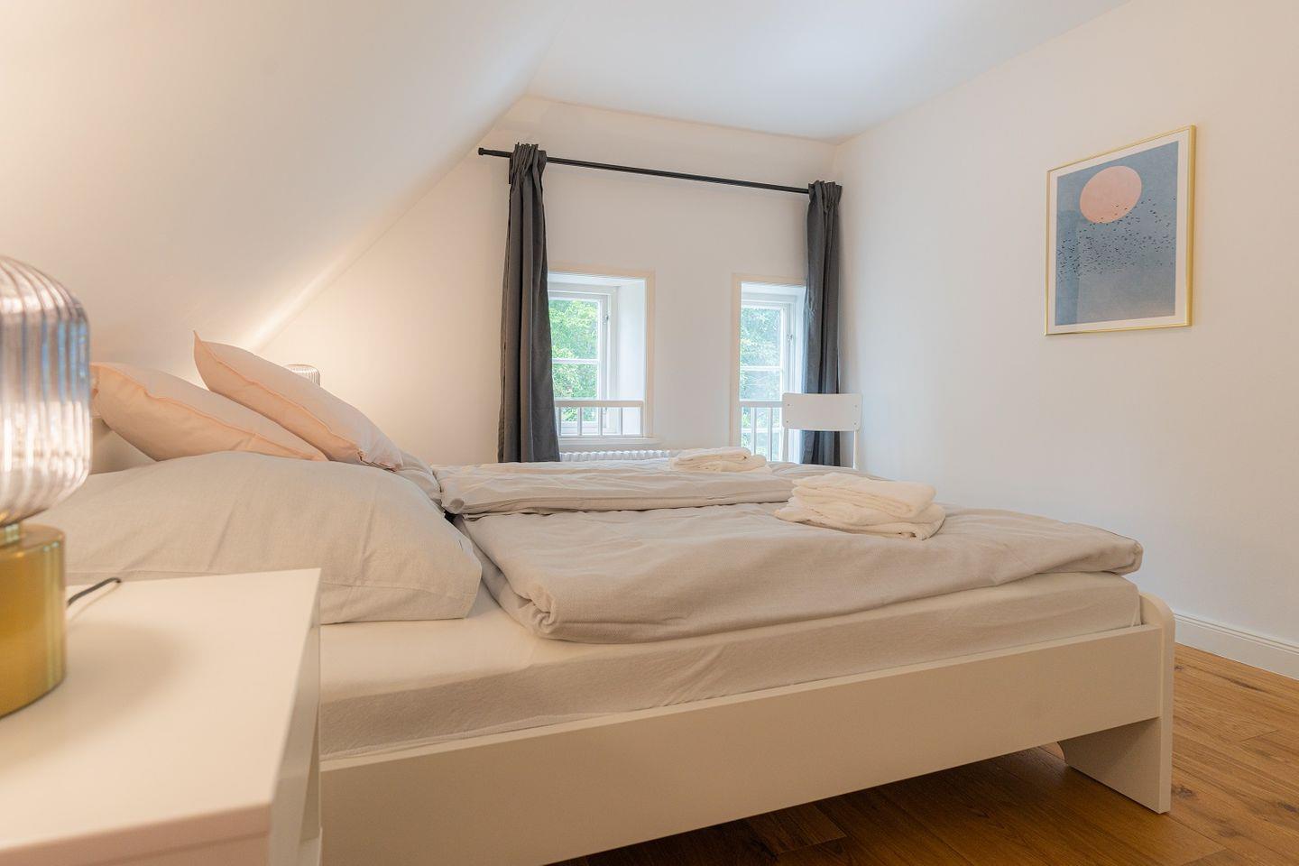Schlafzimmer (24 qm): 1,80 m Doppelbett (durchgehende Matratze), kleiner Balkon.