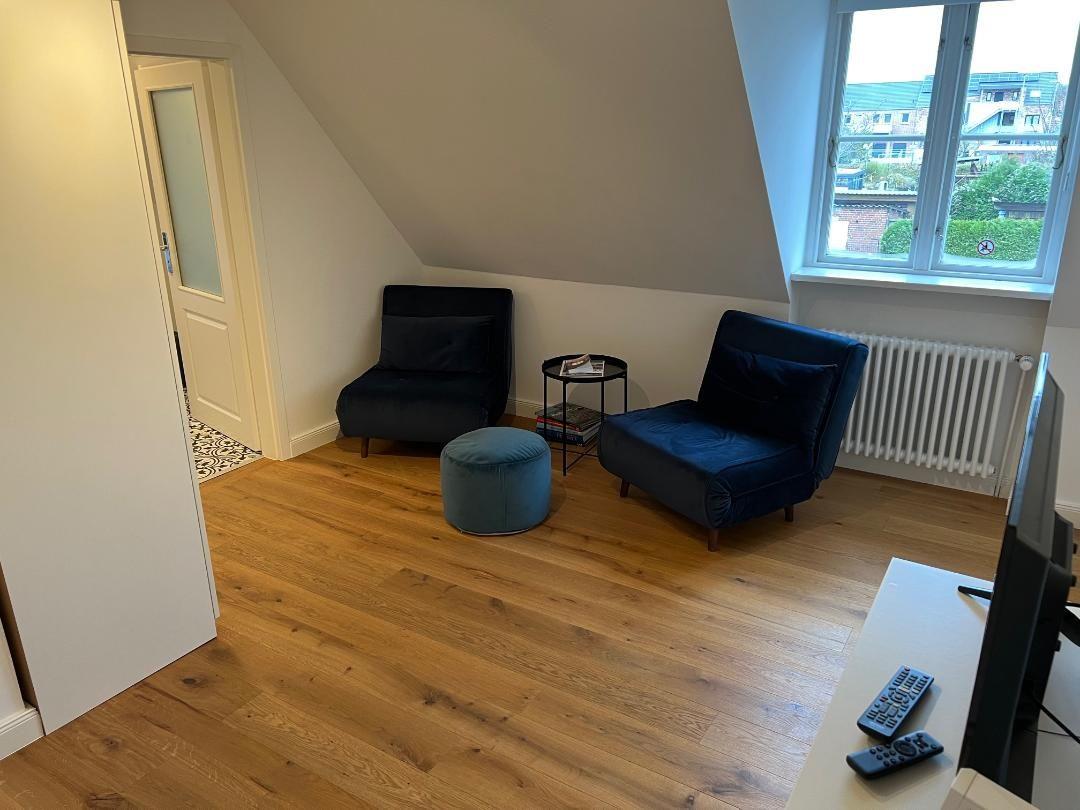 Schlafzimmer /Arbeitszimmer (13 qm, Verbindungstür zum Wohnzimmer): Schlafsofa (160 cm), Schreibtisch.