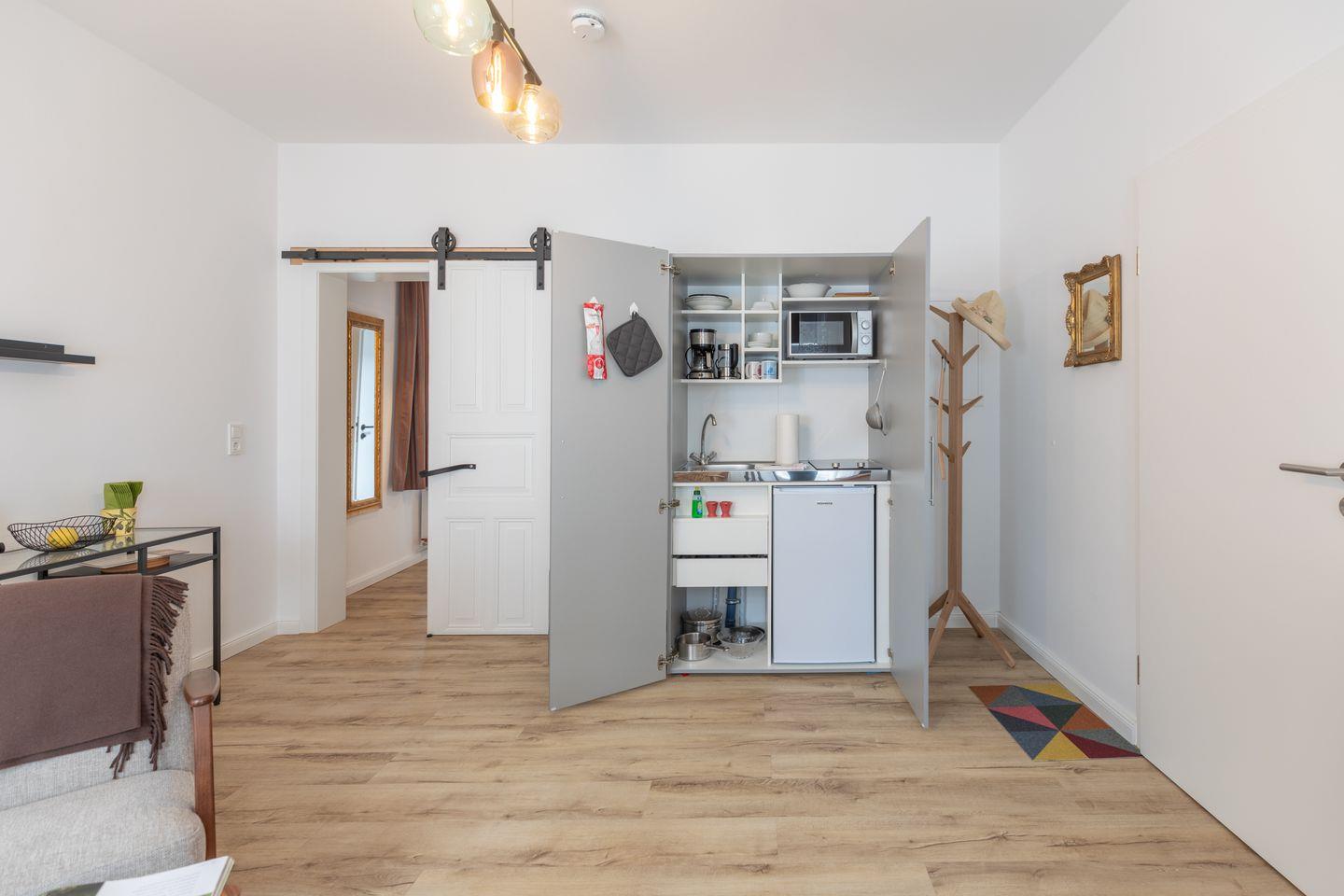 Das geschmackvolle Apartment ist ca. 45 qm groß und ideal für ein bis zwei Personen. Das Wohnzimmer ist gemütlich eingerichtet mit zwei komfortablen Sesseln und einem Flachbild-TV. Die Pantryküche bietet alles, was Sie für Ihre kleine Urlaubsküche benötigen: Kühlschrank mit Gefrierfach, Mikrowelle, Kaffeemaschine, Toaster, Wasserkocher und 2-Platten-Ceranfeld.