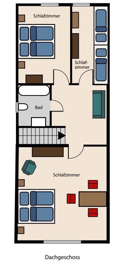Das Melkmanns ist gut 130qm groß und bietet auf 2 Etagen entspannt Platz für 5 - 6 Gäste. In den 3 unterschiedlich großen Schlafzimmern kann man es sich jederzeit gemütlich machen, wobei im größten Schlafzimmer auch ein Tisch zum Arbeiten – wenn es denn unbedingt sein muss – oder zum Spielen bereitsteht. Das kleinste Schlafzimmer ist mit zwei Einzelbetten ausgestattet. Und sollte man sich zwischendurch mal aufs Ohr hauen wollen, steht im großen Flur auch ein Schlafsofa parat. Im Vollbad kann man nach einem Strandtag nochmal gemütlich in der Wanne abtauchen und im Duschbad unten schnell unter die Brause springen. Ab Herbst entsteht hier auch eine Sauna – stay tuned! Zusätzlich gibt’s auch noch ein praktisches Gäste-WC. Für die kleinen Gäste stehen zwei Reisebetten und zwei Hochstühle bereit.