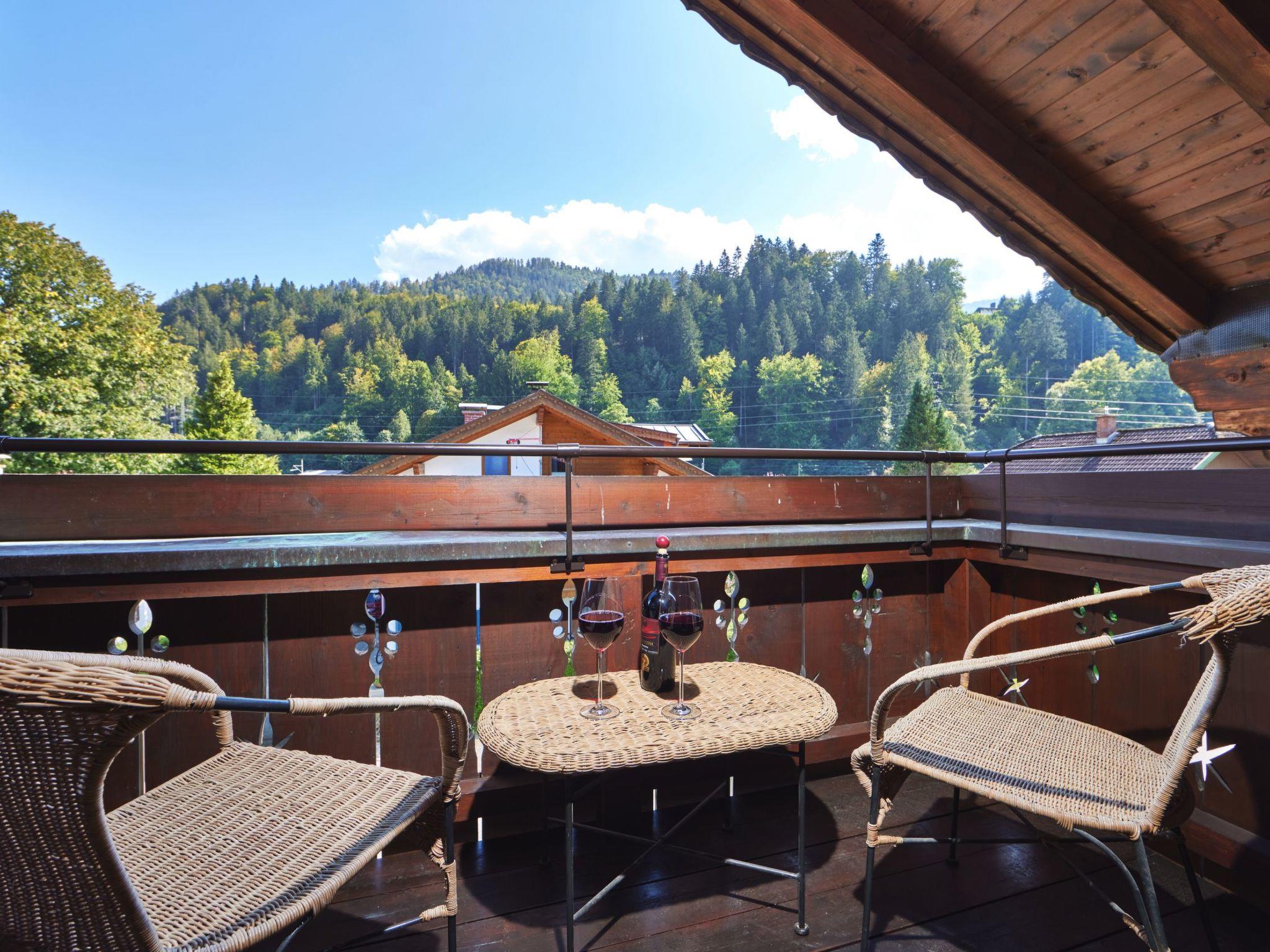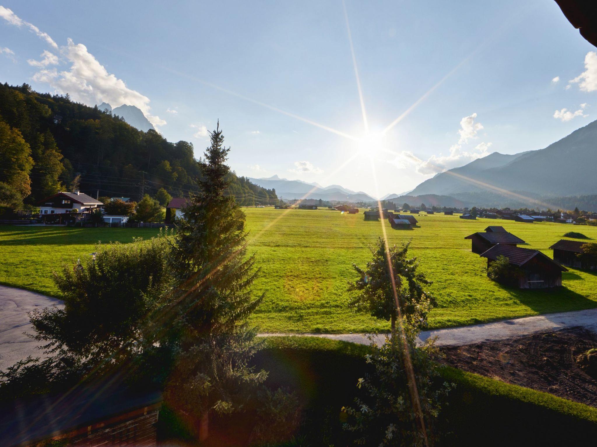 The fully covered, west-facing balcony, which is accessible from the living-dining area, offers a stunning and unobstructed view of the meadows on the southern outskirts and the Werdenfelser and Tyrolean mountains.