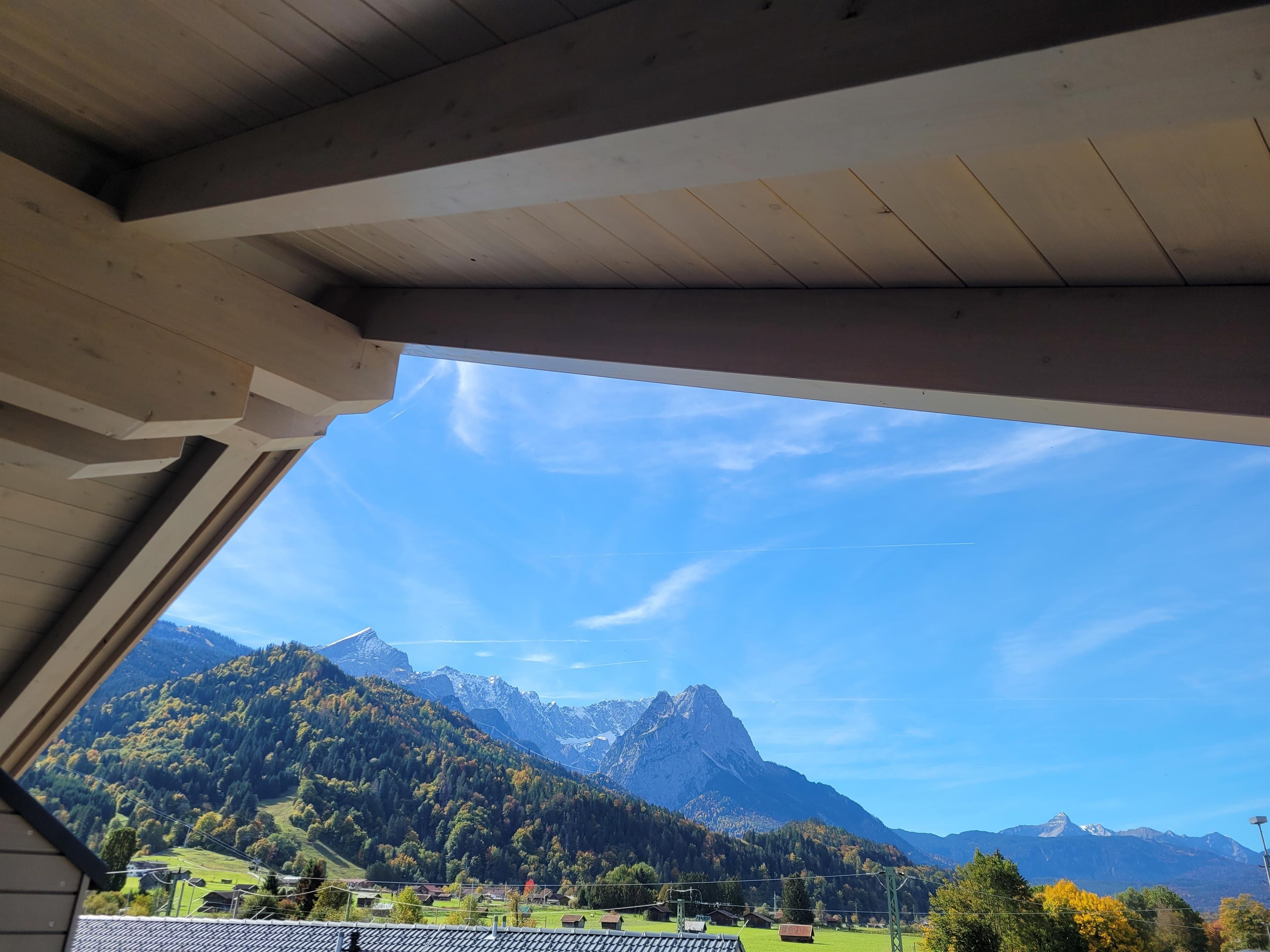 Die 2022 fertiggestellte Dachgeschosswohnung überzeugt durch eine durchdachte Raumaufteilung in 3 Zimmer und zusätzlich einer Loggia in Westausrichtung. Diese eröffnet einen herrlichen Blick auf auf das Wettersteinmassiv mit Alpspitze und Zugspitze.