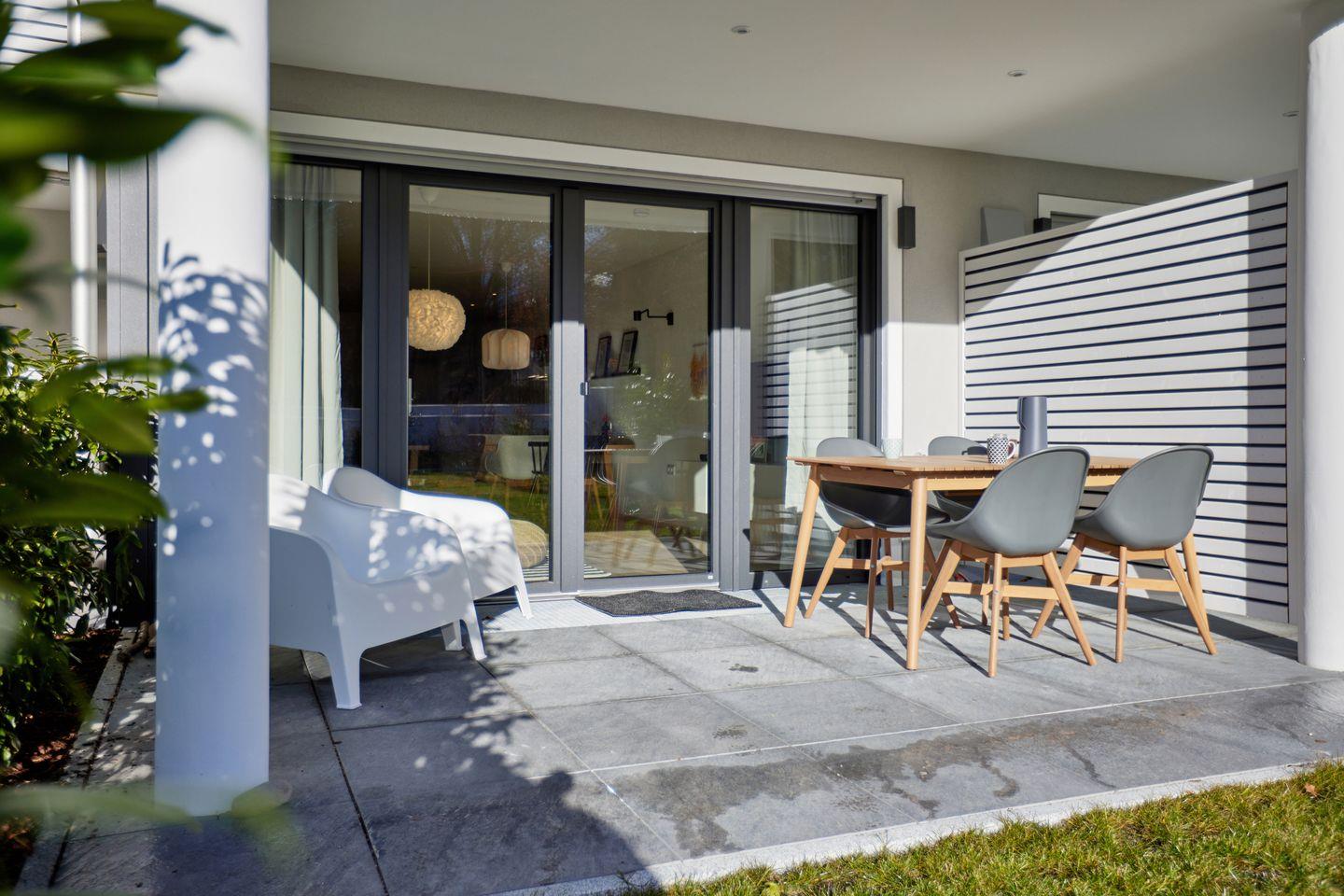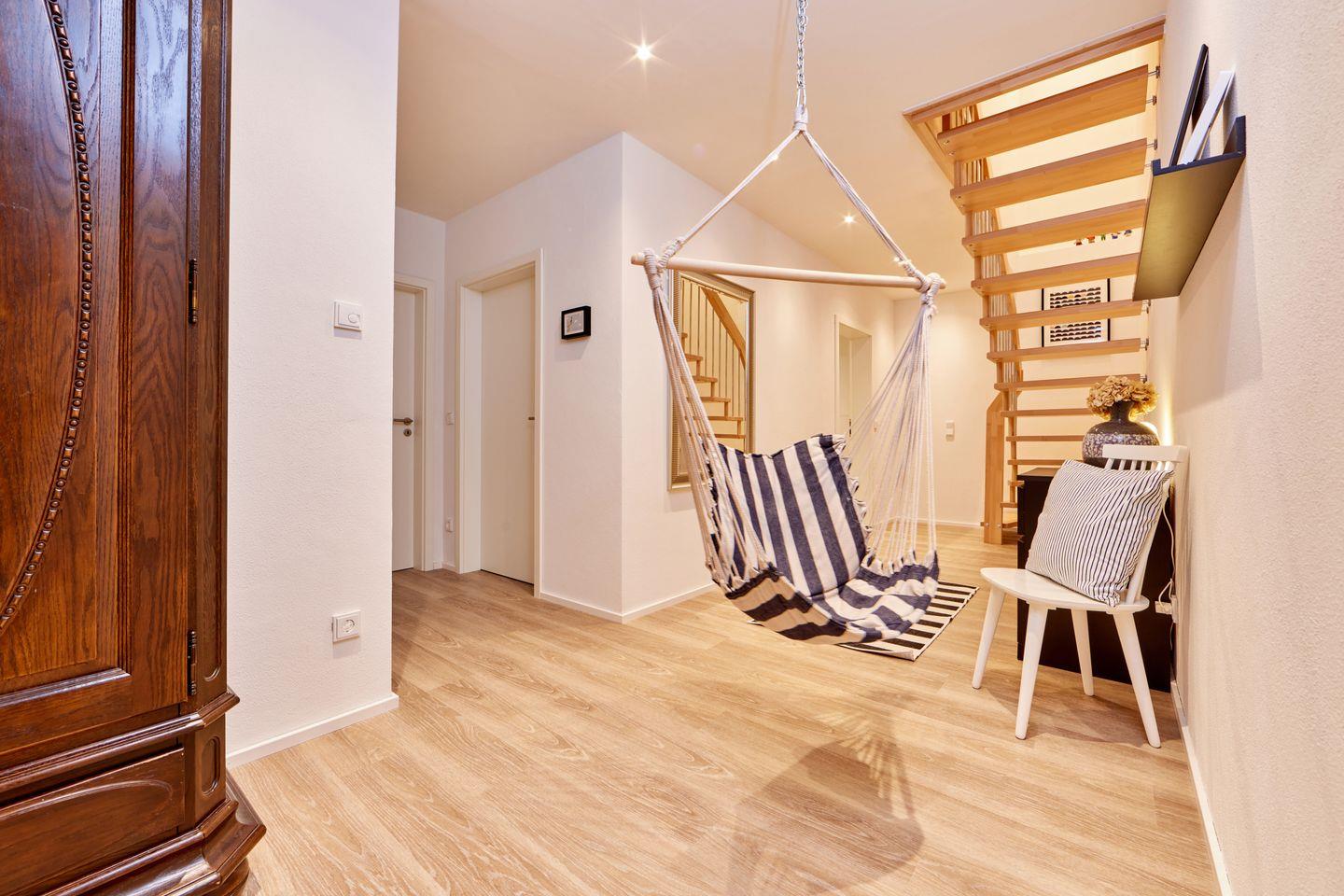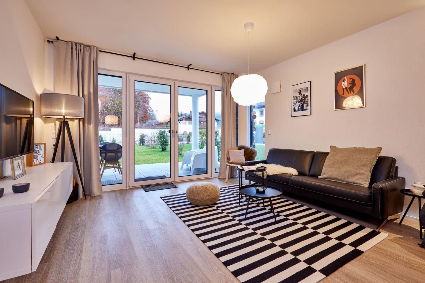 Auch die Zimmer im Untergeschoss verfügen über bodentiefe Fenstertüren und lassen so ausreichend Tageslicht in die Räume. Besonders im Sommer ist es hier angenehm kühl. Eine automatische Raumlüftung garantiert in der gesamten Wohnung gutes Raumklima und die Fußbodenheizung sorgt auch bei niedrigen Temperaturen für warme Füße.