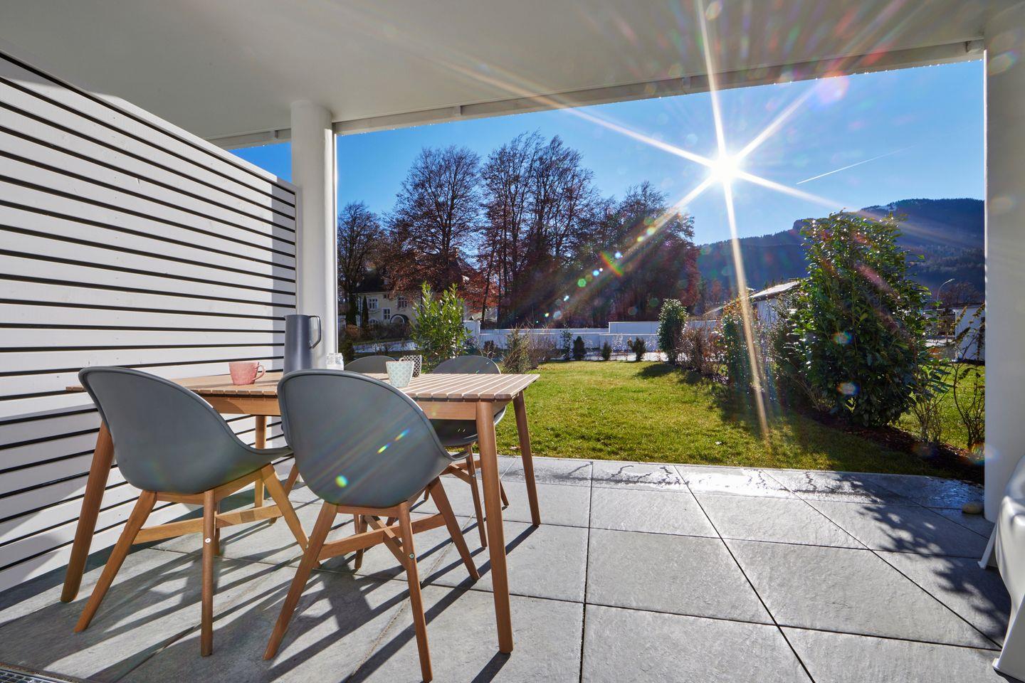 Die mit Terrassengarnitur und Liegestühlen ausgestattete Terrasse ist komplett überdacht und bietet Ihnen zusammen mit der angrenzenden Gartenfläche einen gemütlichen Platz an der frischen Luft, viel Sonne und einen wunderbaren Ausblick auf die Alpspitze.