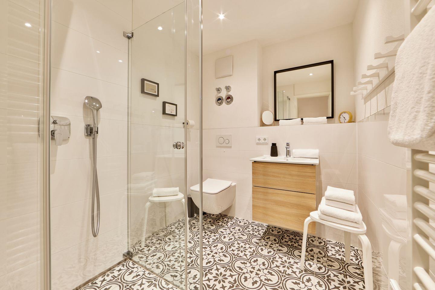 Im Erdgeschoss befindet sich außerdem eines der beiden Bäder mit Dusche, sowie eines der Schlafzimmer. Diese sind jeweils mit gemütlichem Boxspring-Doppelbett, geräumigem Kleiderschrank und eigenem Flachbild-Fernseher ausgestattet.