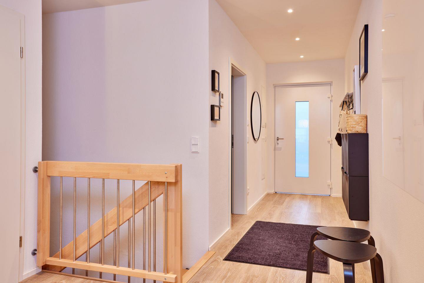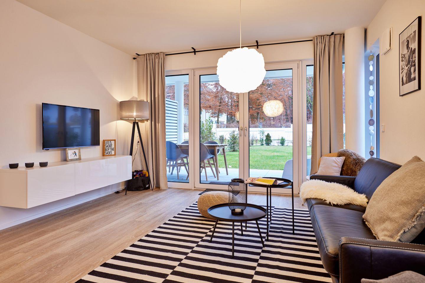 Im Erdgeschoss befindet sich als Herzstück der Wohnung ein großer Wohn- und Essbereich mit offener Küche. Bodentiefe Fenster lassen viel Licht in die Wohnung und lassen ins Grüne blicken. Am großen Esstisch kommt mühelos die ganze Familie zusammen.
