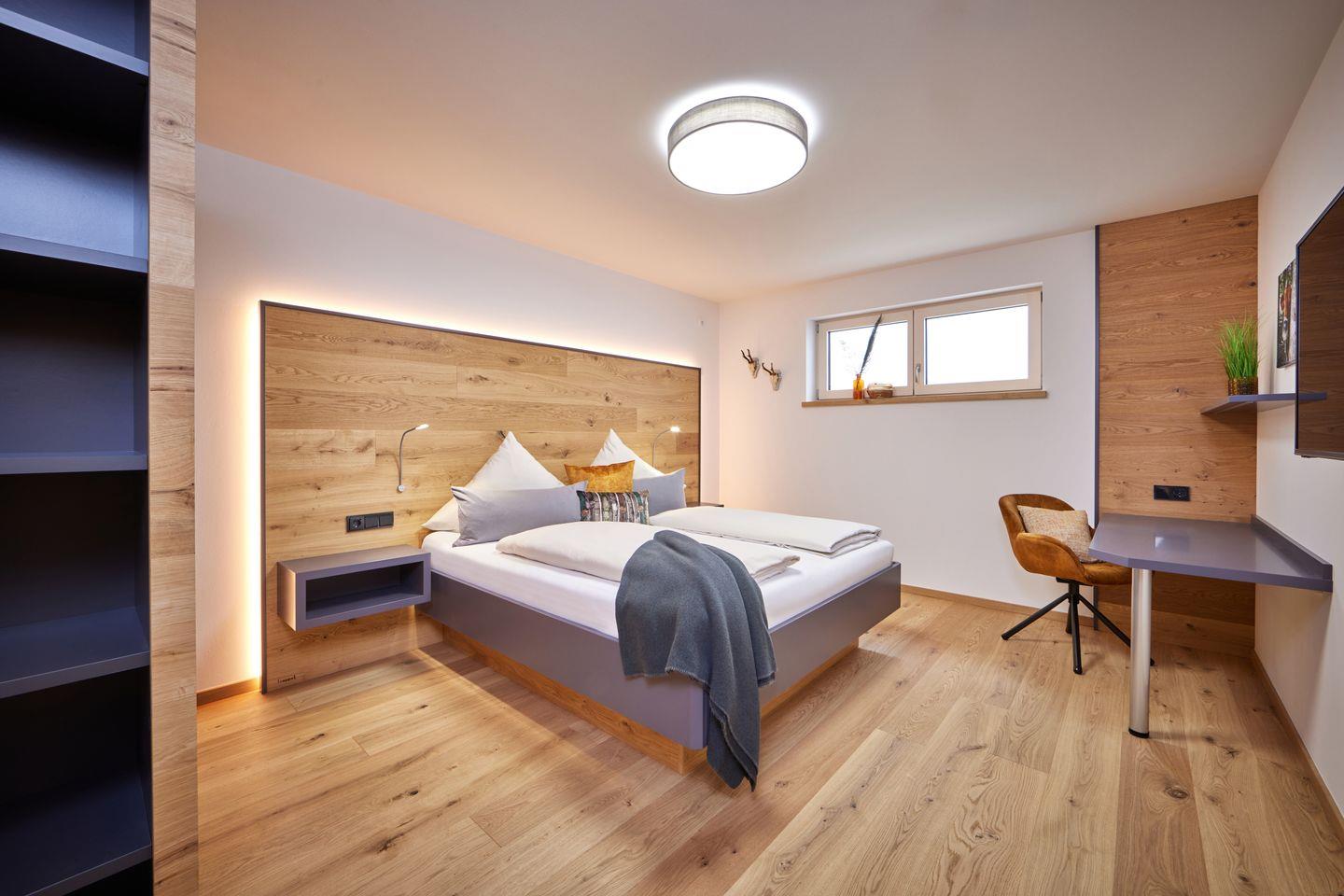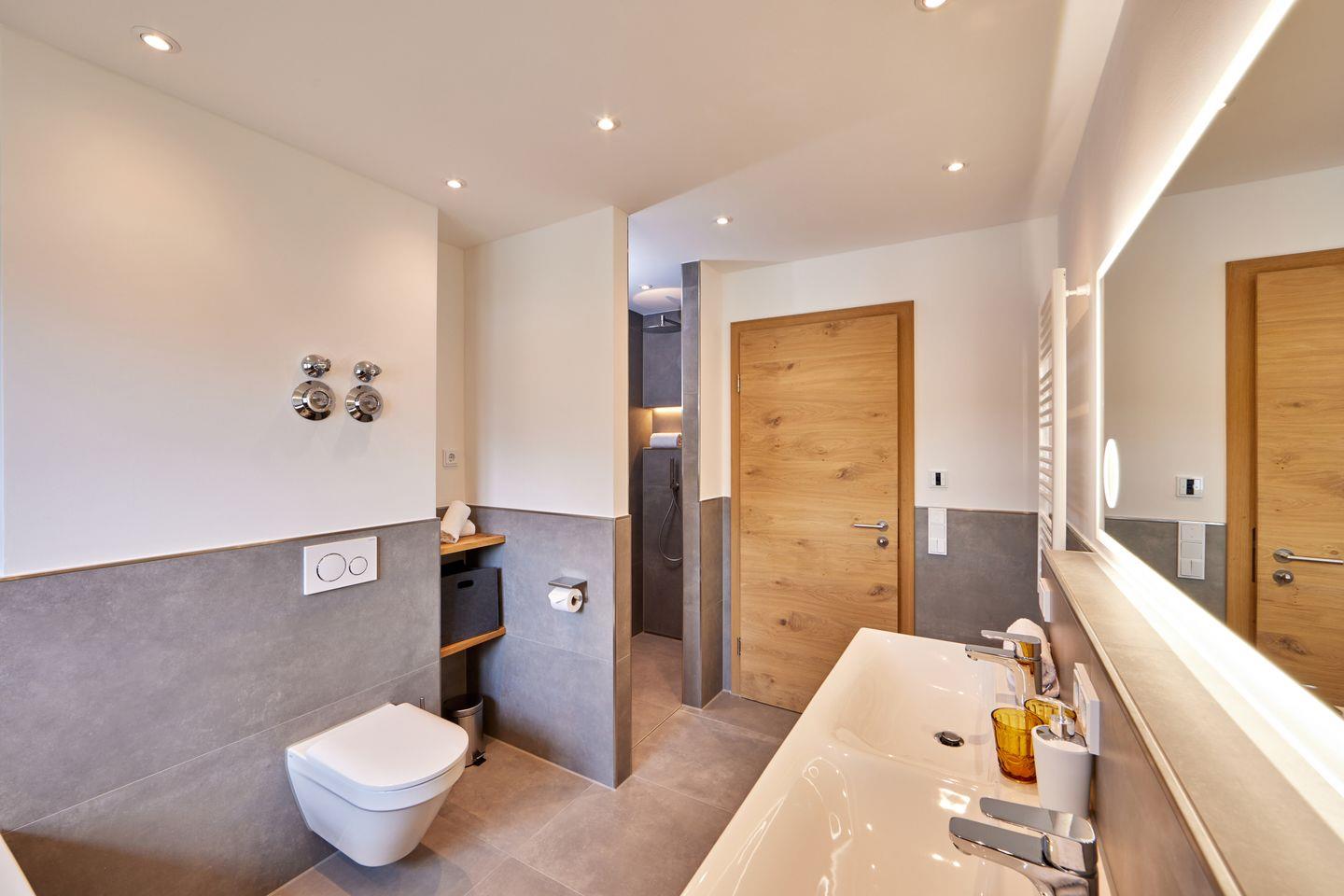 Alle Schlafzimmer sind jeweils mit bequemen Doppelbetten, großzügigen Kleiderschränken für Ihr Gepäck und eigenen Fernsehern ausgestattet. Zudem verfügen 3 der Schlafzimmer auch über praktische Schreibtische. 3 Schlafzimmer befinden sich im Obergeschoss, zusammen mit einem großen Badezimmer, in dem Sie neben einer ebenerdigen Dusche mit Regenbrause auch eine entspannende Badewanne finden. 2 der Schlafzimmer haben jeweils einen Zugang zum großen Balkon, auf dem sich bei schönem Bergblick herrlich die Abendsonne genießen lässt. Das andere Schlafzimmer verfügt über einen eigenen, kleineren Balkon.