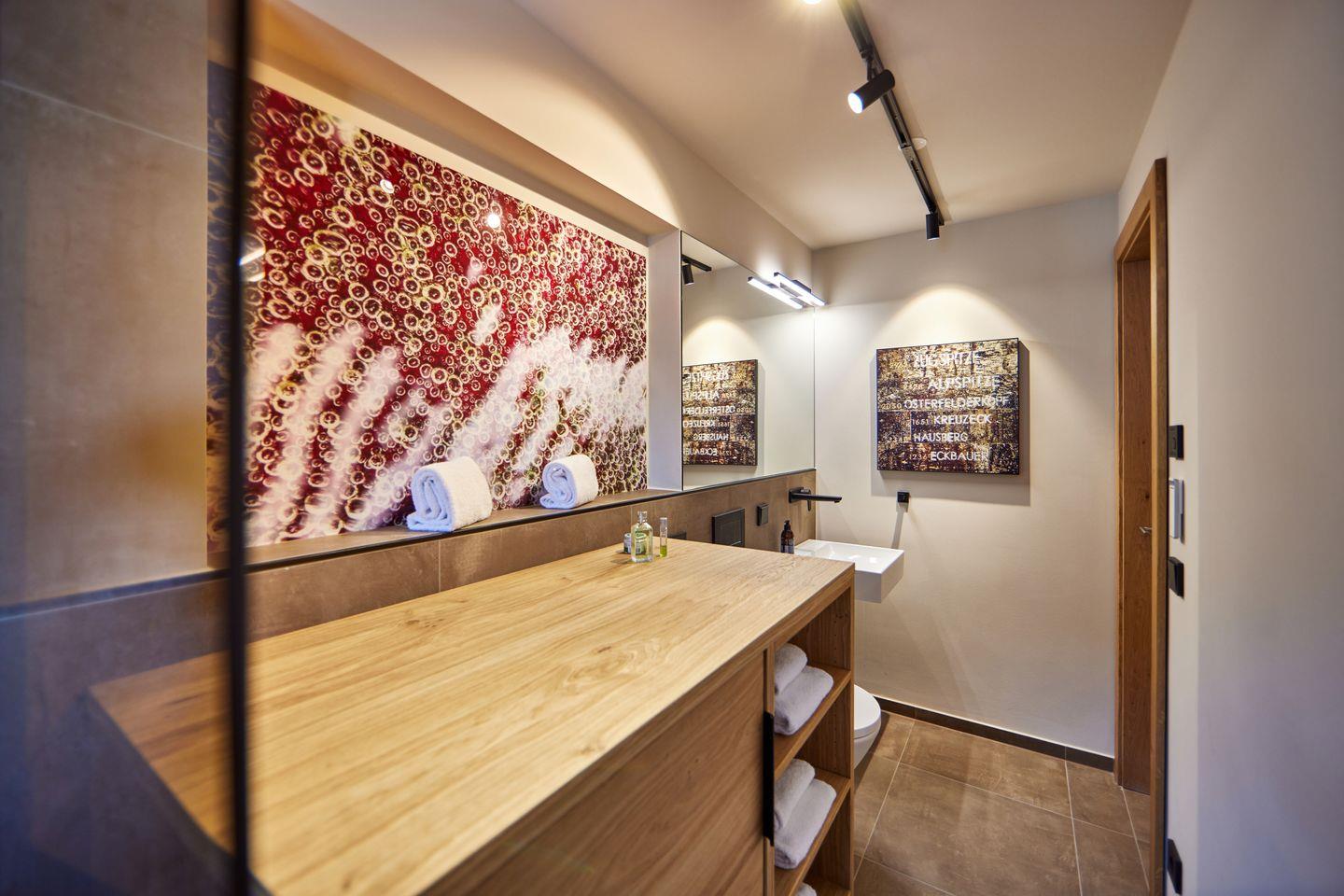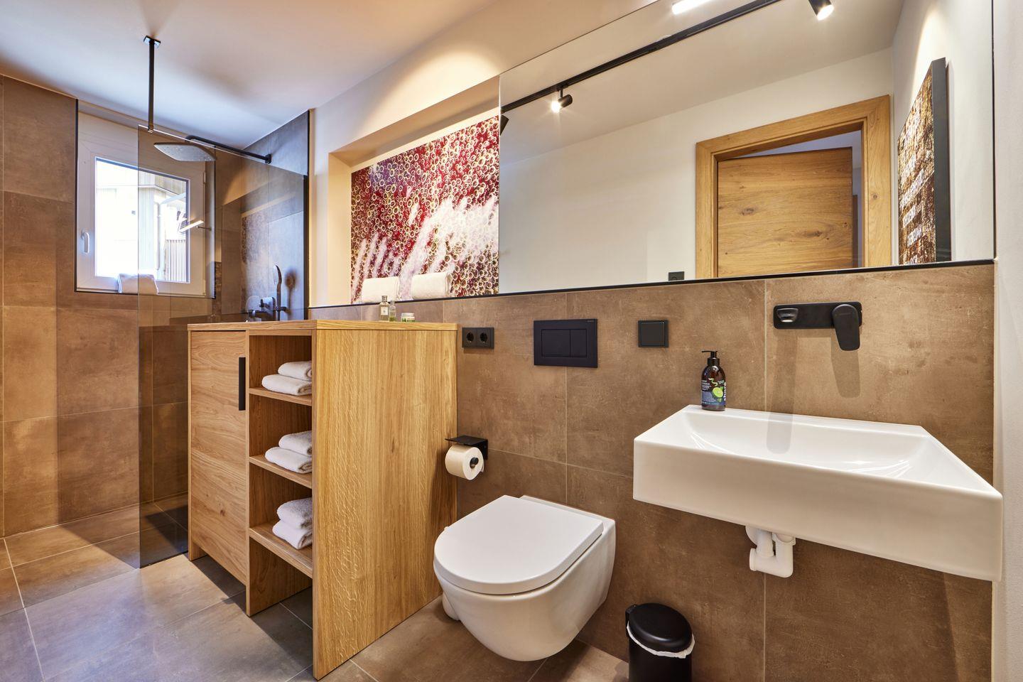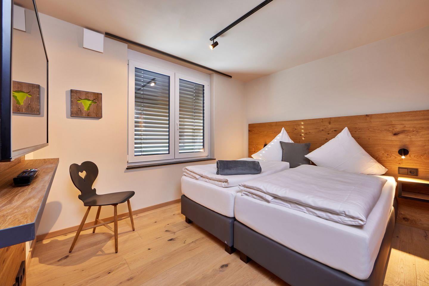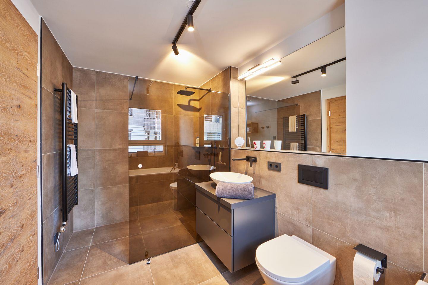 2 Schlafzimmer laden zur Nachruhe ein, jedes mit bequemem Boxspringdoppelbett und kuscheligem Bettzeug, geräumigen Kleiderschränken und Fernseher ausgestattet. Eines der Schlafzimmer hat außerdem Zugang zum zweiten, eigenen Badezimmer, welches neben einer weiteren ebenerdigen Dusche mit Regenbrause auch mit einer einladenden Badewanne aufwartet, in der Sie nach einem langen Tag in den Bergen Entspannung finden.