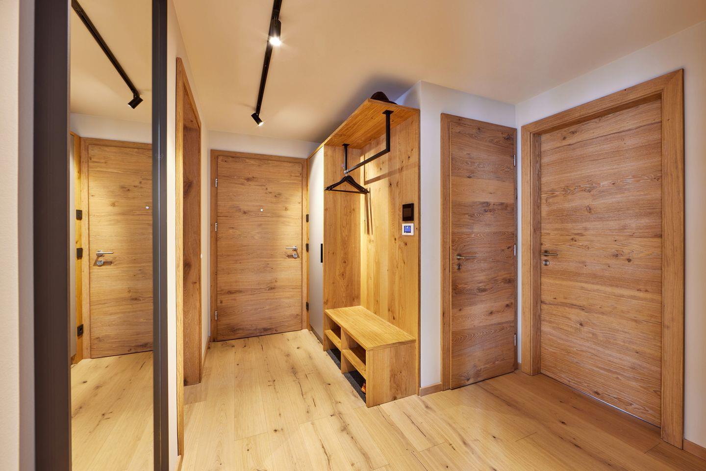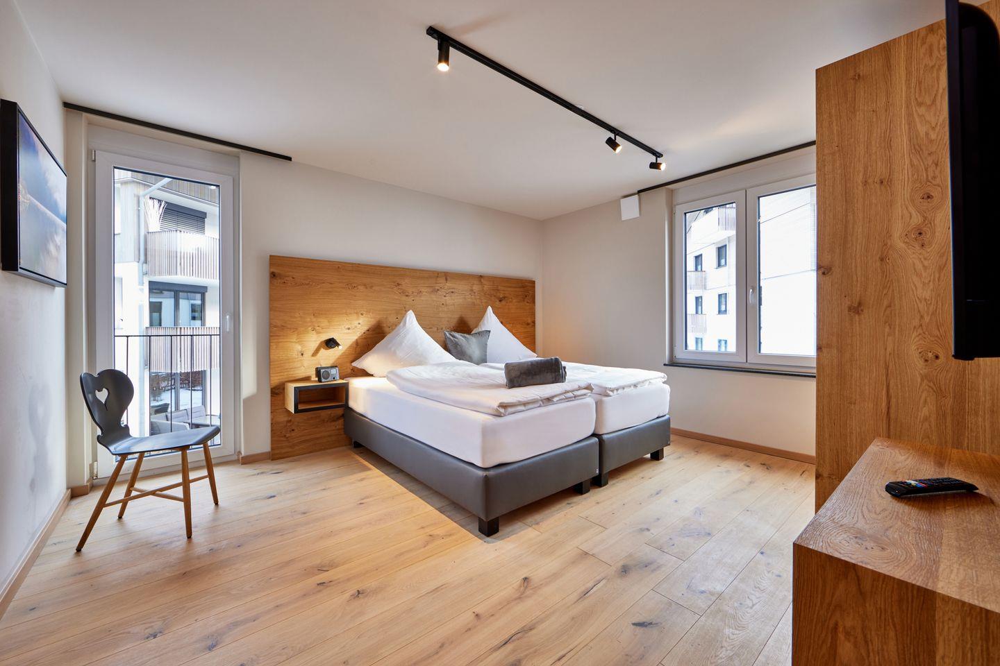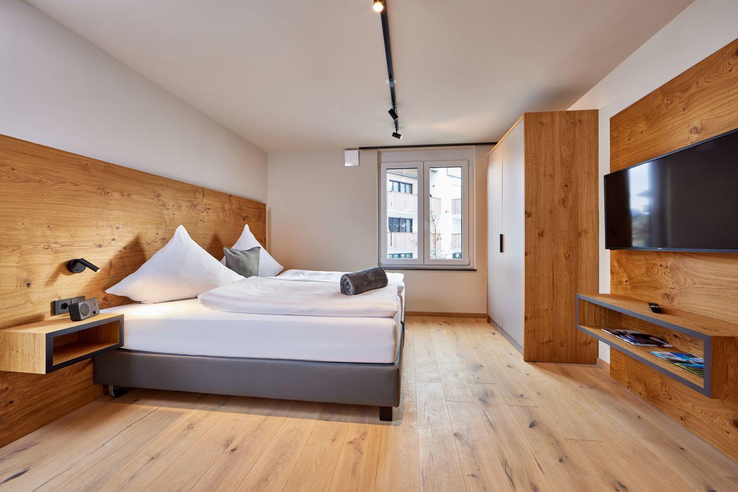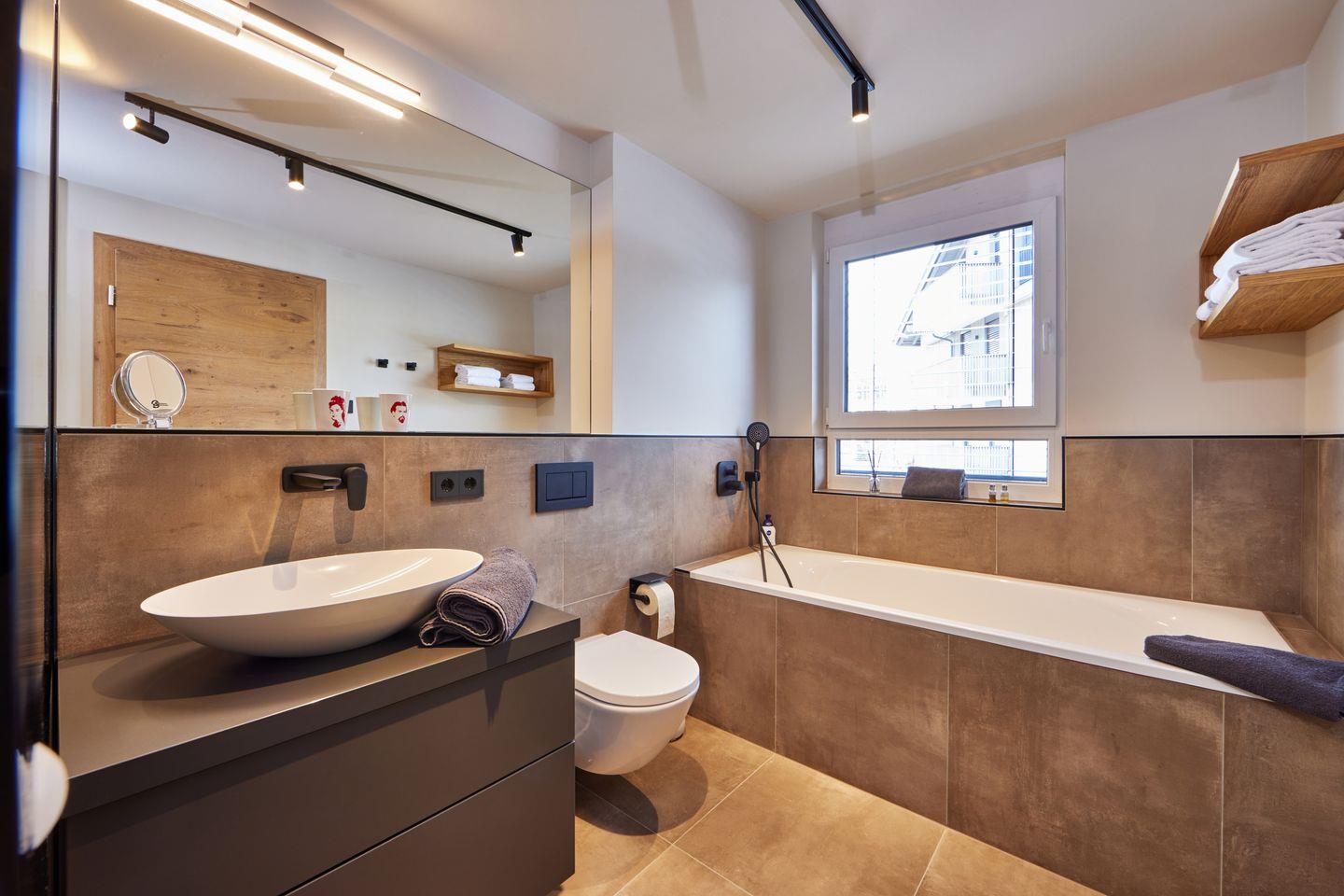 2 Schlafzimmer laden zur Nachruhe ein, jedes mit bequemem Boxspringdoppelbett und kuscheligem Bettzeug, geräumigen Kleiderschränken und Fernseher ausgestattet. Eines der Schlafzimmer hat außerdem Zugang zum zweiten, eigenen Badezimmer, welches neben einer weiteren ebenerdigen Dusche mit Regenbrause auch mit einer einladenden Badewanne aufwartet, in der Sie nach einem langen Tag in den Bergen Entspannung finden.