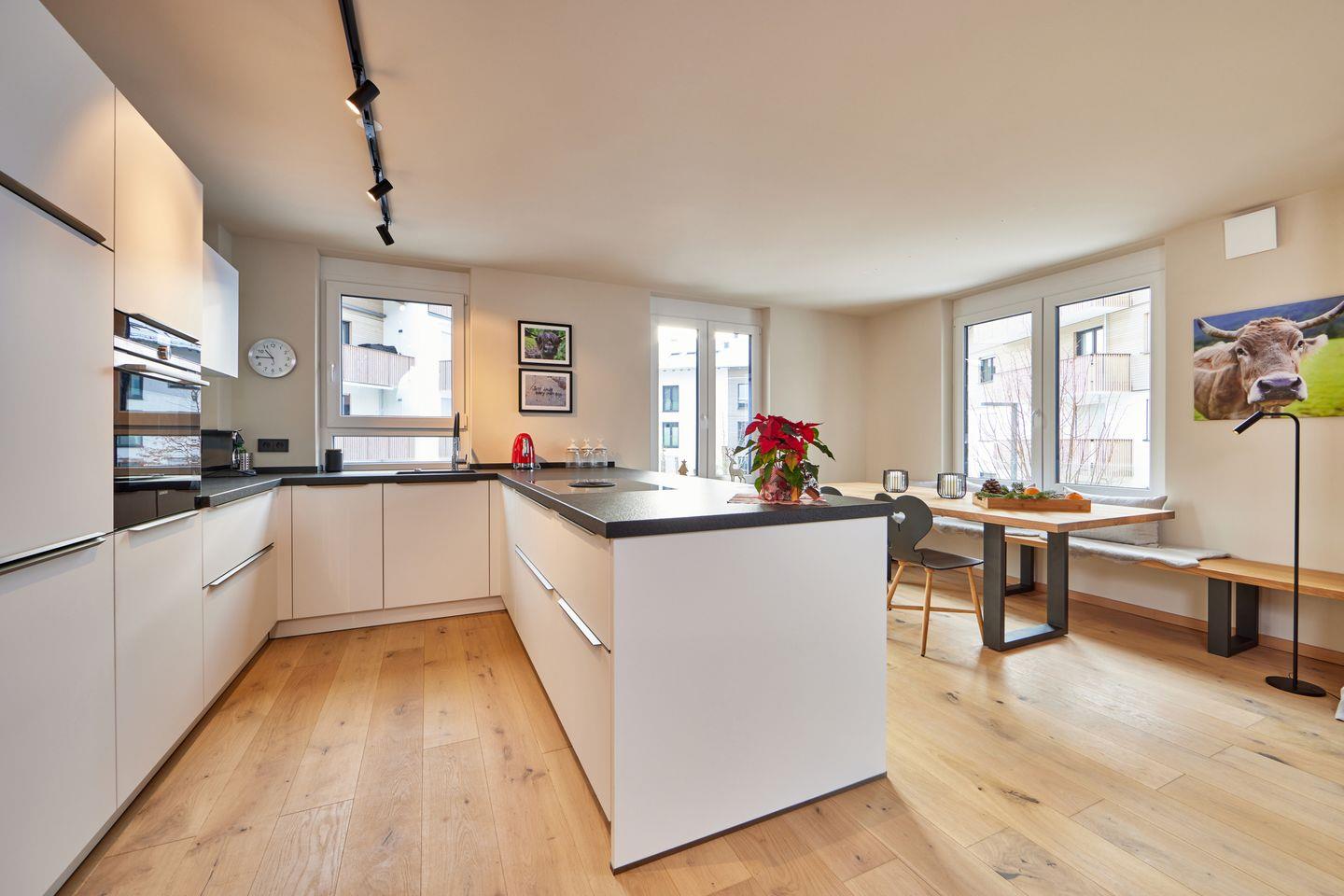 Die moderne Küche ist vollständig und hochwertig ausgestattet und verfügt über alle wichtigen Küchengeräte, wie einen Kühlschrank mit Gefrierfach, Herd und Backofen. Eine Nespresso-Kaffeemaschine ist ebenfalls vorhanden.