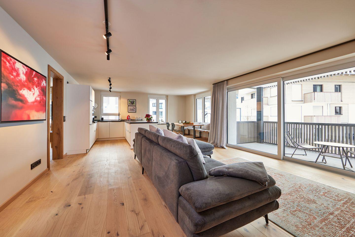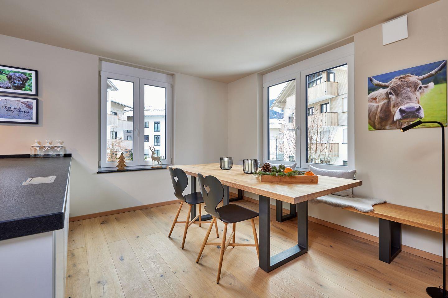 Ein großer, offener Wohnraum mit großzügiger Kücheninsel und dem einladendem Esstisch bildet das Herzstück der Wohnung. Von der bequemen Sitzgruppe blickt man durch bodentiefe Fenster auf die beeindruckenden Namensgeber der Wohnung: Der große und kleine Waxenstein dominieren imposant das Bergpanorama, dahinter kommt auch die Zugspitze lockend zum Vorschein. Wer sich vom Bergblick abwenden kann, wird auch von dem großen Flachbild-Fernseher begeistert sein, der hier für Unterhaltung sorgt.