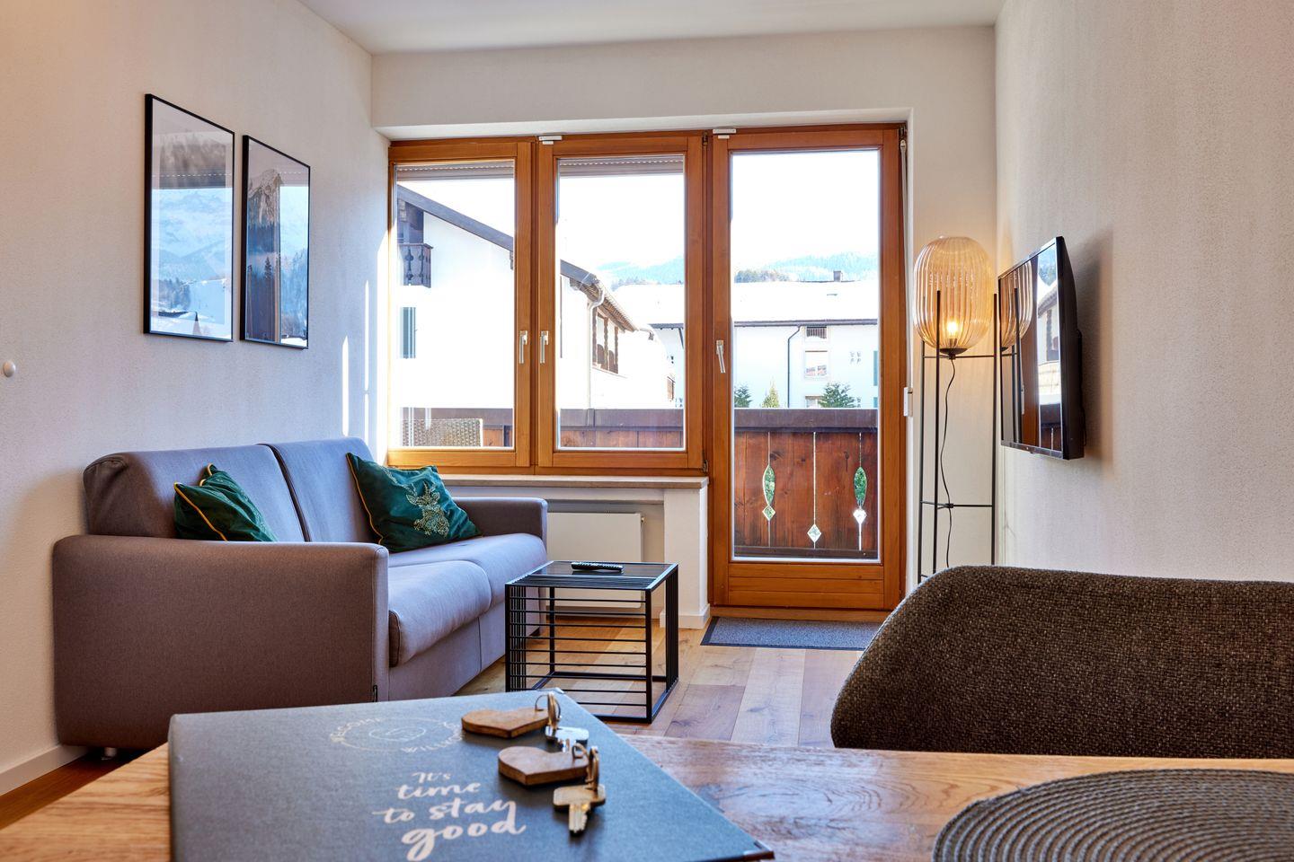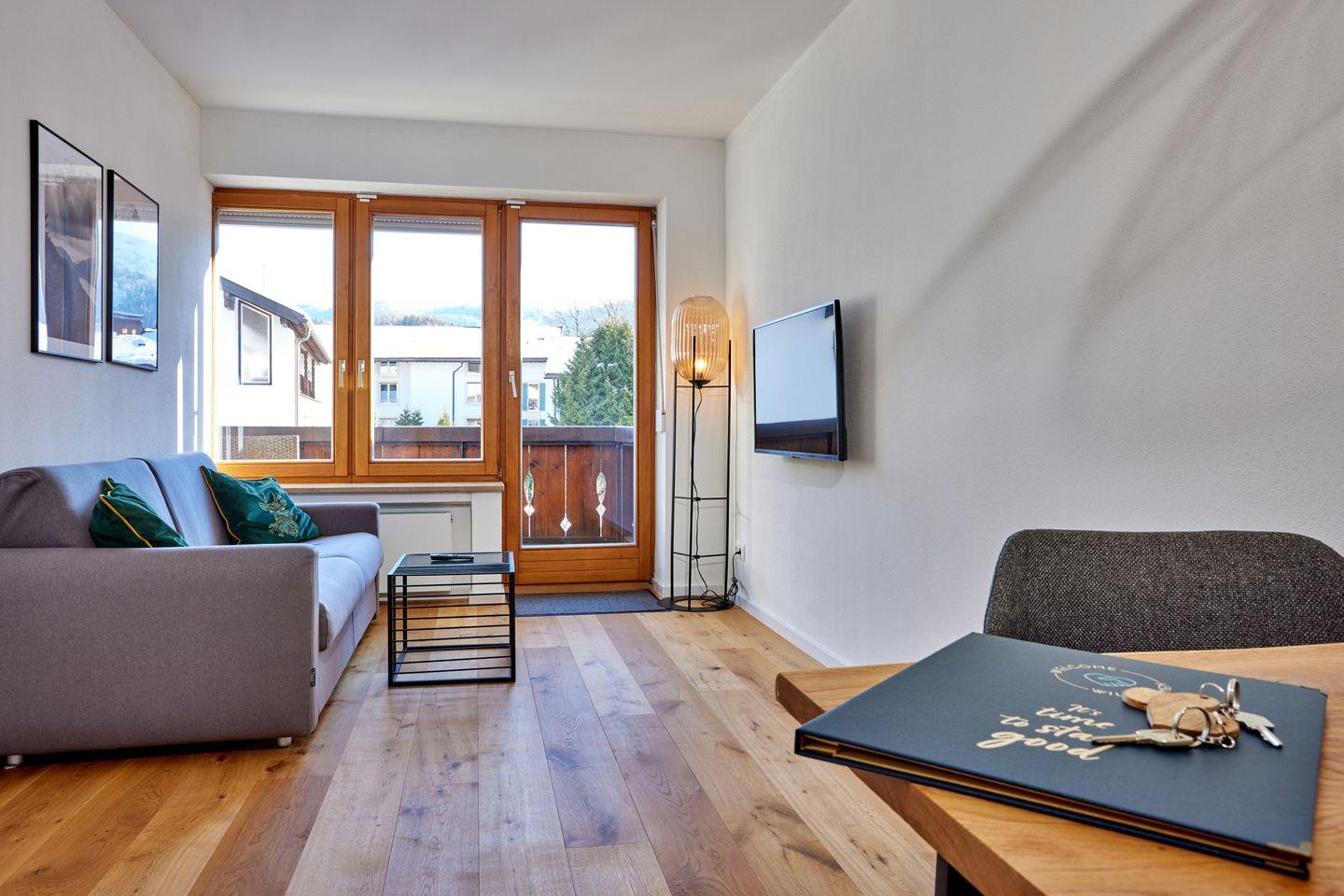 Die Alpenkate ist mit viel Liebe zum Detail eingerichtet, um Ihnen den perfekten Rückzugsort zu bieten. Das helle und einladende Wohnzimmer lädt zum Entspannen ein. Genießen Sie den Panoramablick auf die umliegenden Berge und Wälder von Ihrem eigenen Balkon aus.