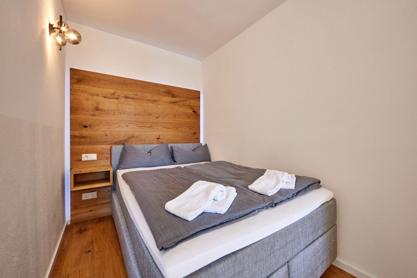 Das Schlafzimmer ist mit einem komfortablen Doppelbett ausgestattet und bietet ausreichend Platz für Ruhe und Erholung.