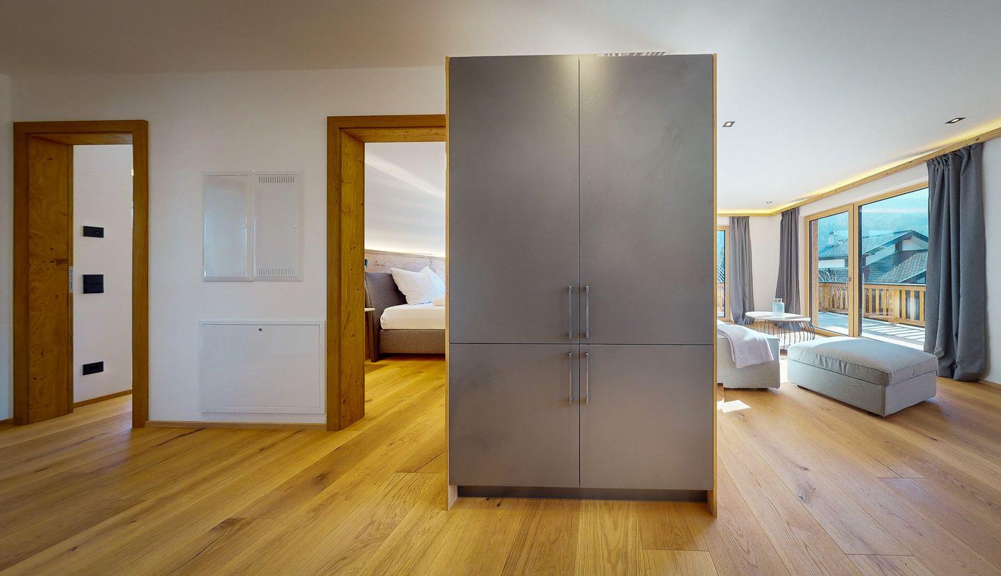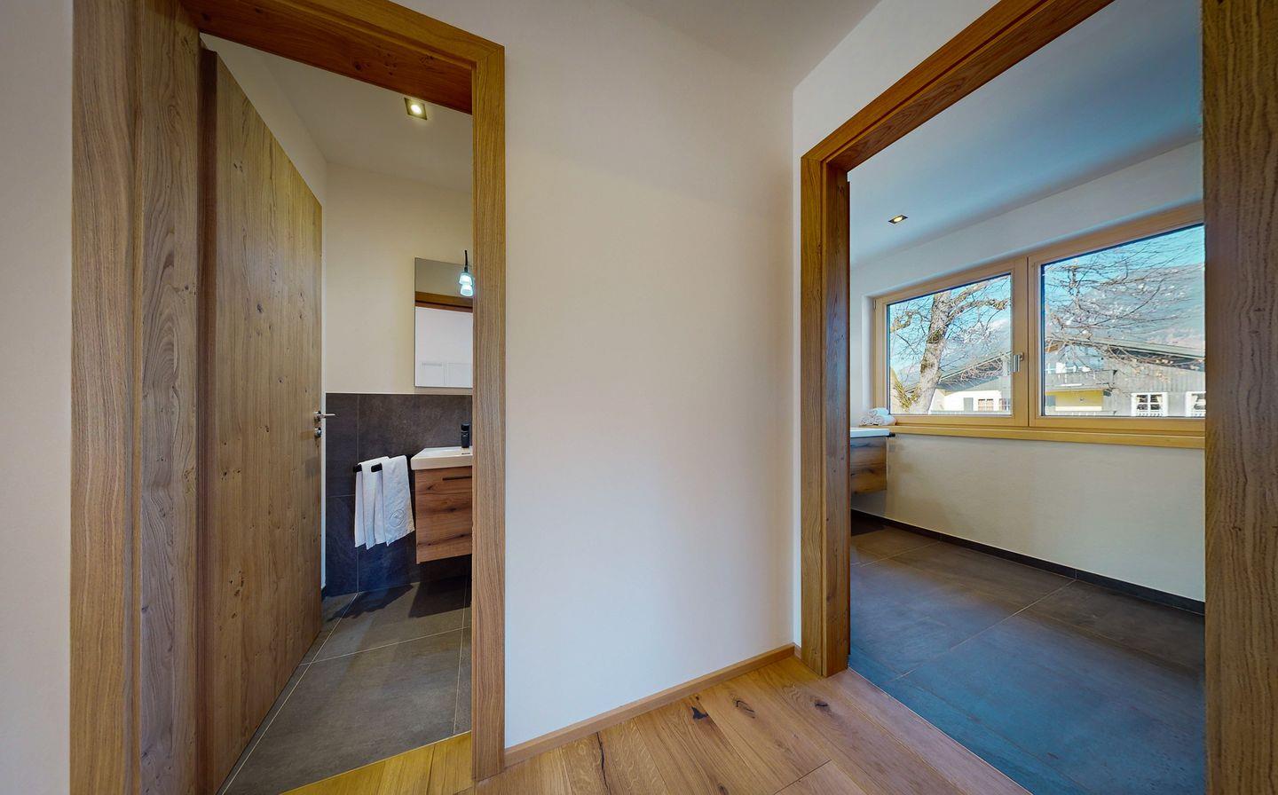 Einer der Höhepunkte dieser Wohnung ist zweifelsohne der große, umlaufende, nach Süden und Westen ausgerichtete Balkon, zu dem sowohl der Wohnraum, als auch die zwei Schlafzimmer Zugang bieten. Von hier aus eröffnet sich ein Bergblick, der den perfekten Rahmen für intime Momente oder zum geselligen Beisammensein an der frischen Luft bietet.