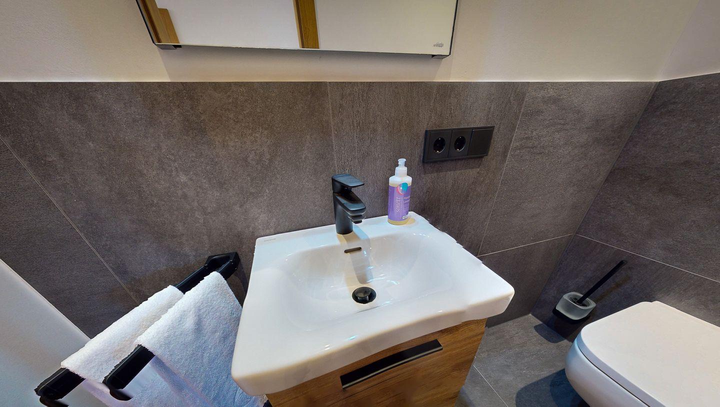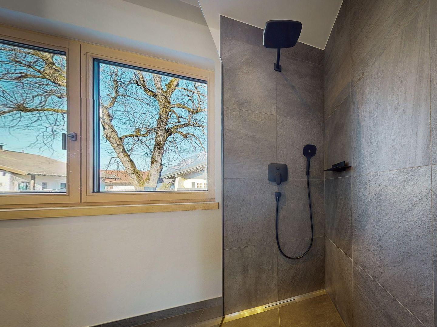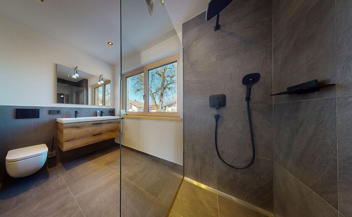 Das mit einer ebenerdigen Regendusche ausgestattete Badezimmer sorgt mit viel Tageslicht für einen erfrischenden Start in den Tag, während ein zusätzliches Gäste-WC die Wohnung praktisch ergänzt.