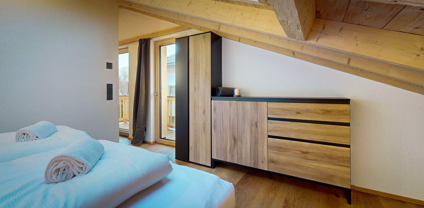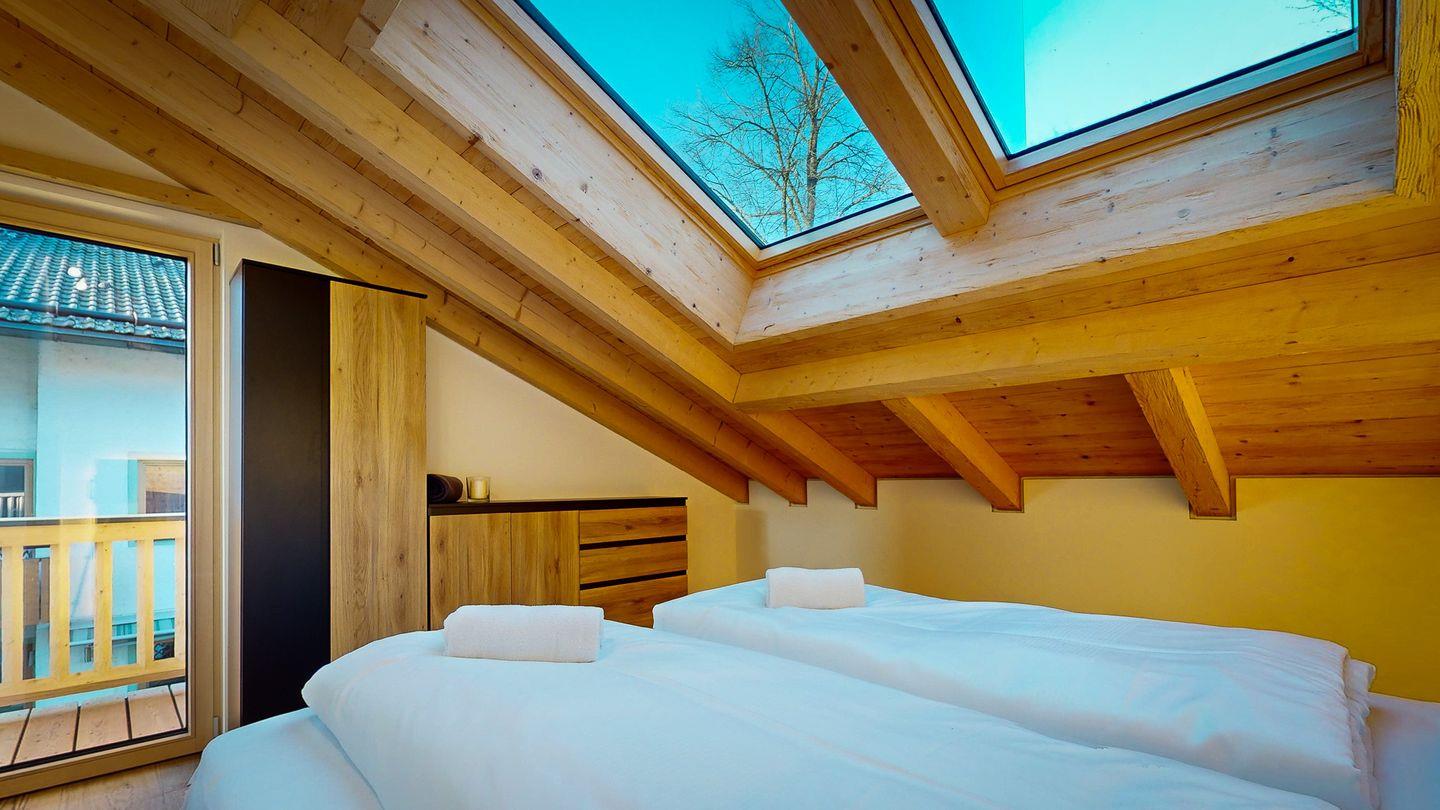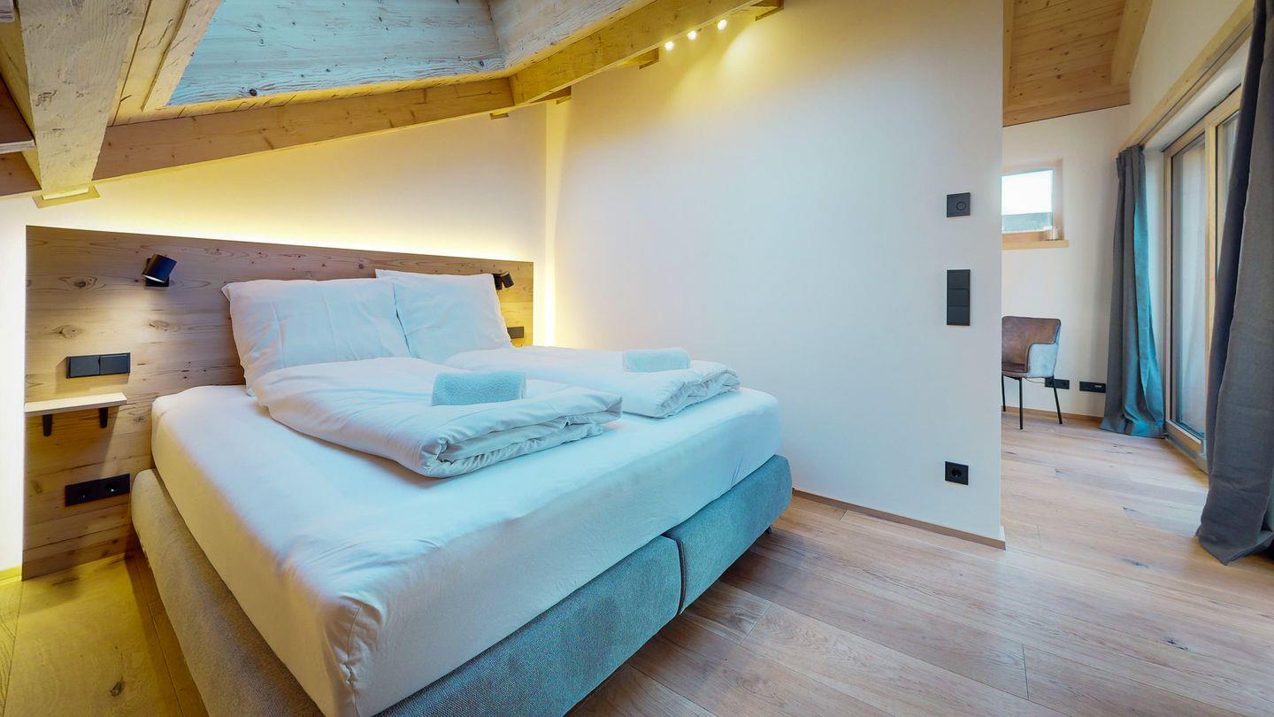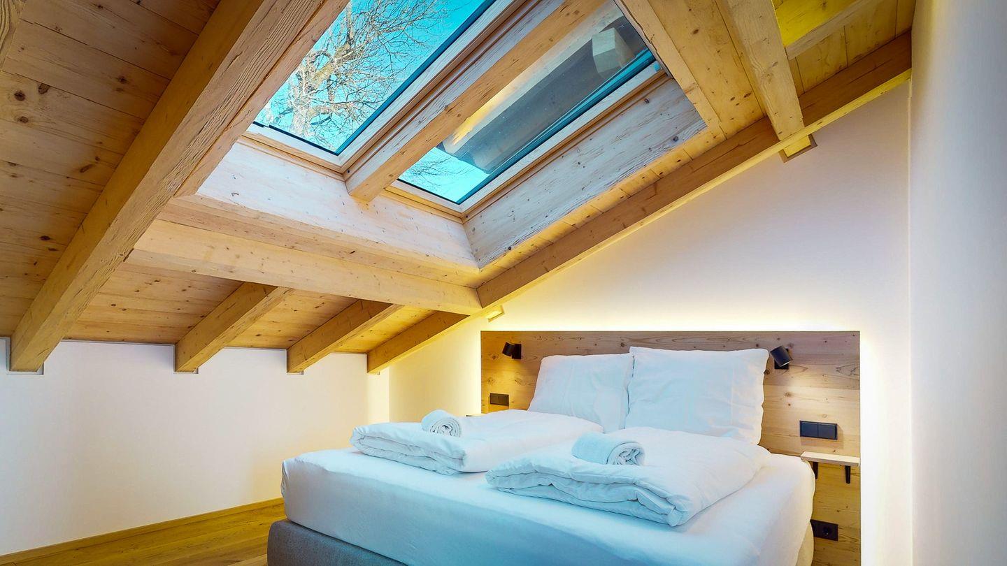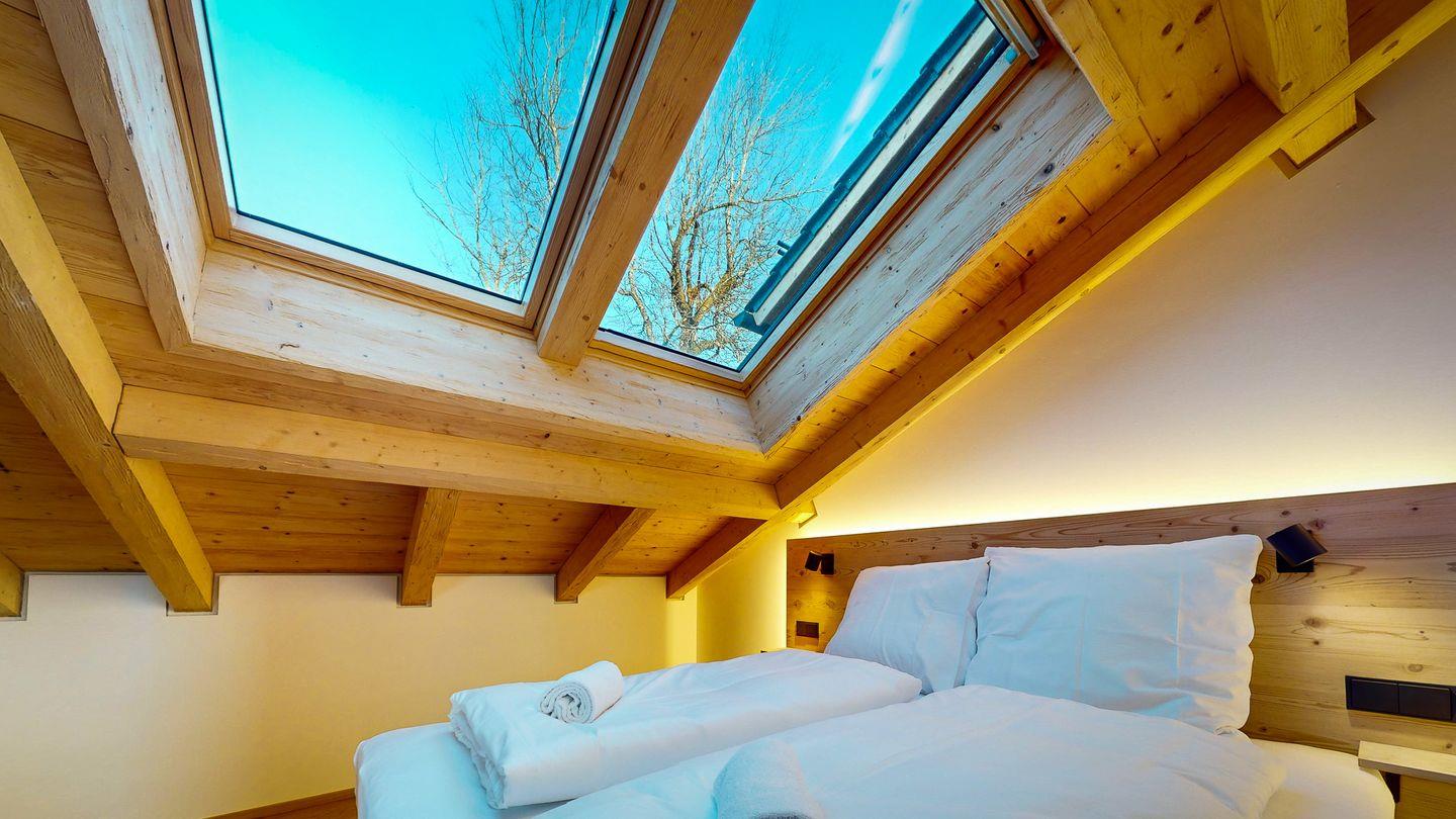 Der Schlafbereich ist durch eine Wand vom Rest der Wohnung abgetrennt und bietet einen kuscheligen Rückzugsort nach einem spannenden Tag auf den nahe gelegenen Pisten und Wanderwegen. Eine Garderobe bietet Platz für Ihr Reisegepäck. Im gemütlichen Doppelbett können Sie unter großen Dachfenstern den Sternenhimmel beobachten und sich von der Morgensonne sanft wecken lassen.