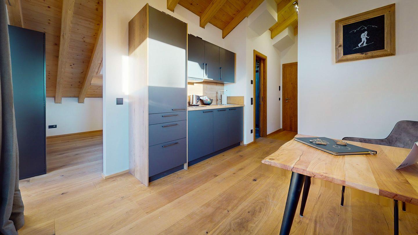 Das Apartment "Geroldsee" bietet eine harmonische Mischung aus rustikalem Charme und modernem Komfort für zwei Personen. Beim Betreten öffnet sich Ihnen direkt das Herzstück der Wohnung. Ein offen gestalteter Wohnraum mit bequemer Sofaecke und Fernseher. Daran schließt sich nahtlos die gut ausgestattete Küche und der Essbereich mit kleinem Esstisch an. So bietet Ihnen die Wohnung "Geroldsee" für Ihren Aufenthalt einen Raum, der sowohl funktional als auch ästhetisch ansprechend ist und zum gemütlichen Zusammensein einlädt.