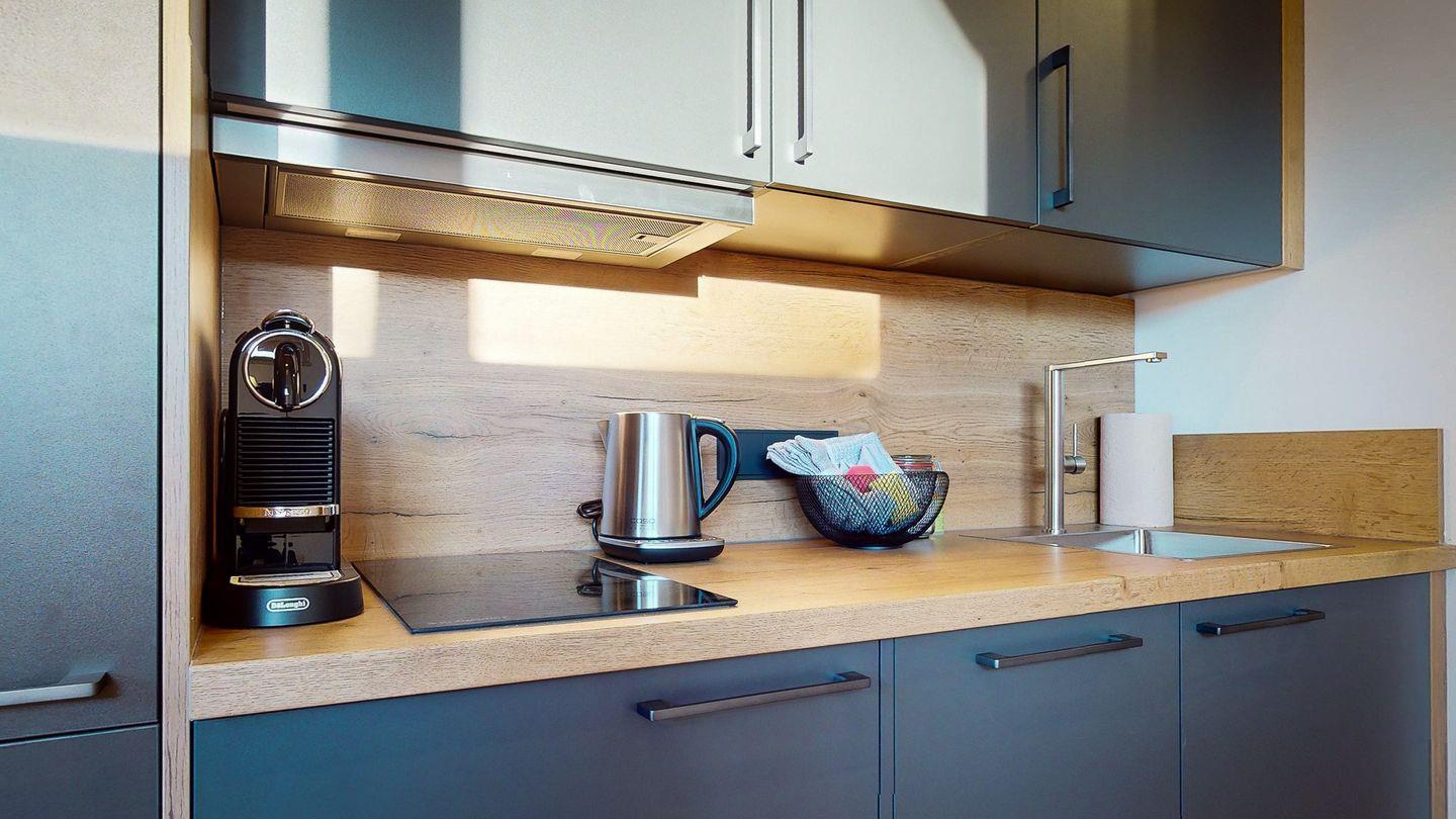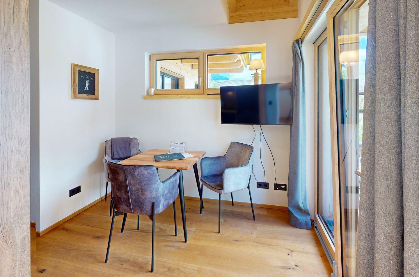 Vom Wohnbereich aus haben Sie außerdem Zugang zum nördlich ausgerichteten Balkon, von dem aus Sie den Blick in die Berge oder einen erholsamen Moment an der frischen Luft genießen können.