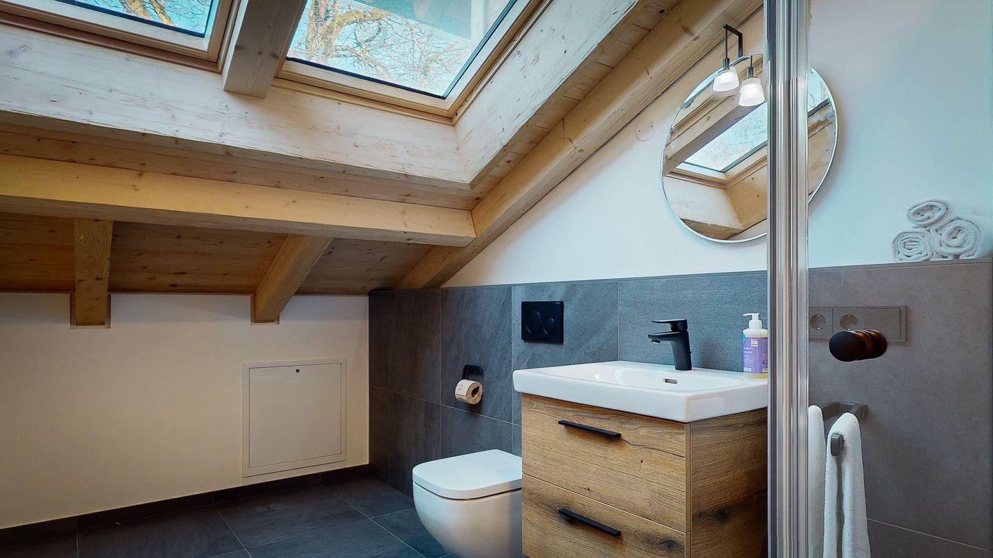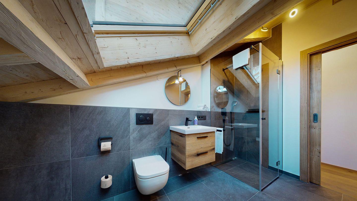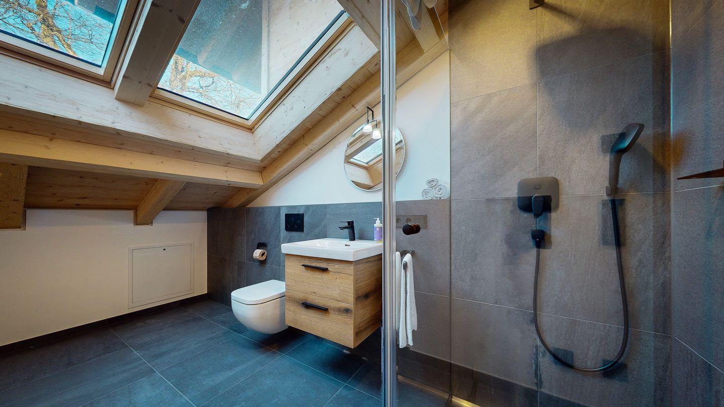 Das mit einer ebenerdigen Regendusche ausgestattete Badezimmer sorgt mit großen Dachfenstern und viel Tageslicht für einen erfrischenden Start in den Tag.