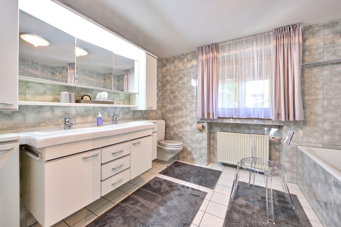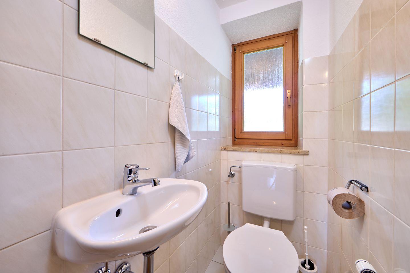 Ein stilvolles Badezimmer und ein zusätzliches Gäste-WC sorgen für angenehmen Komfort. Praktisch ist auch die separate Wäschekammer, in der Ihnen Waschmaschine und Trockner zur Verfügung stehen. Ihr Auto parken Sie bequem auf dem Stellplatz direkt vor dem Haus.