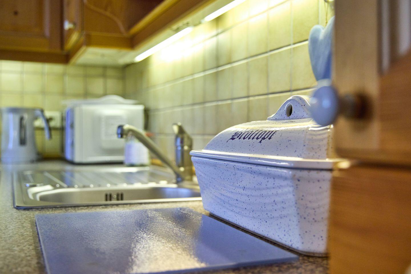 Die voll ausgestattete Küche mit Esstisch bietet alles, was Sie für die Zubereitung herzhafter Mahlzeiten und zum gemütlichen Zusammensitzen benötigen.