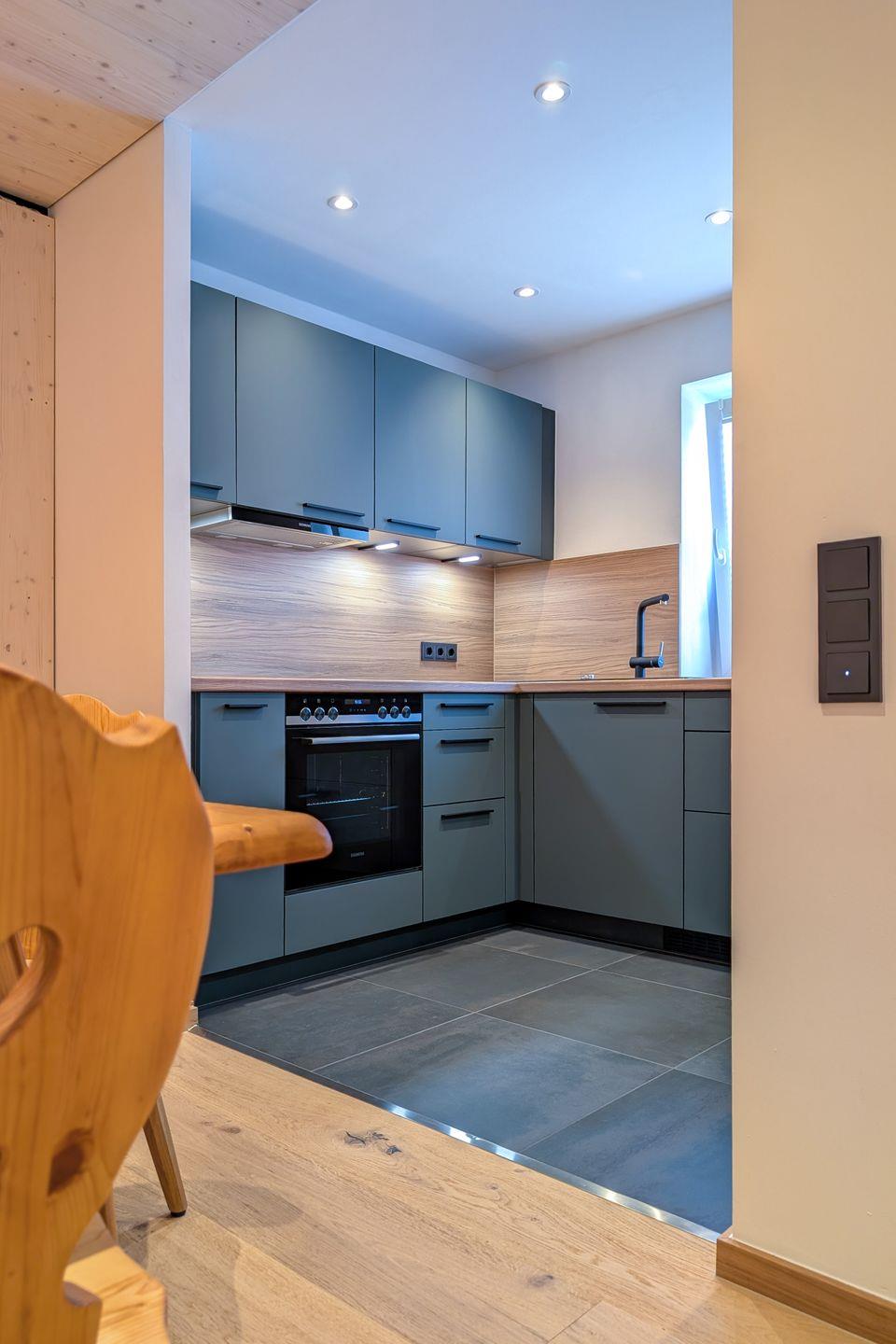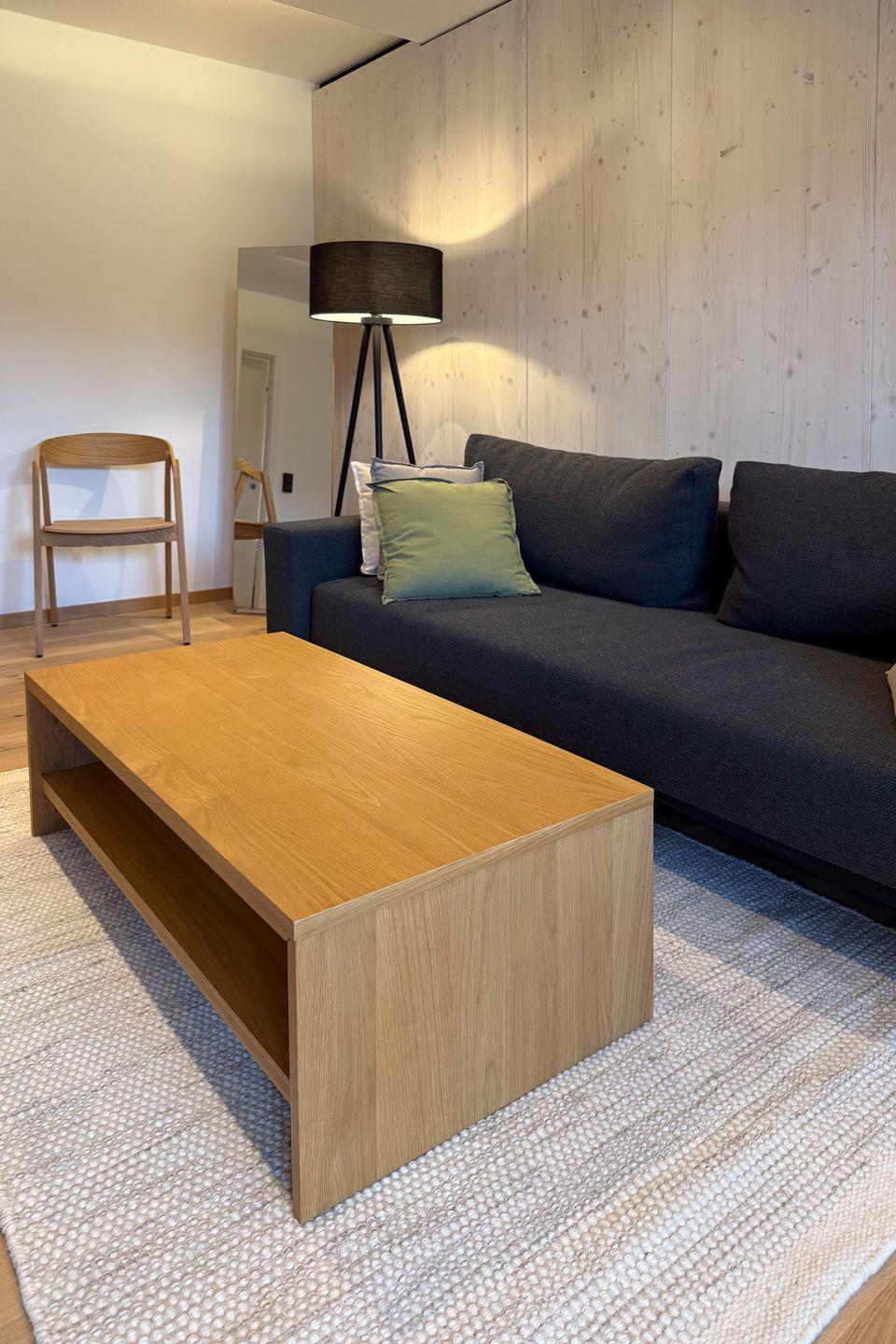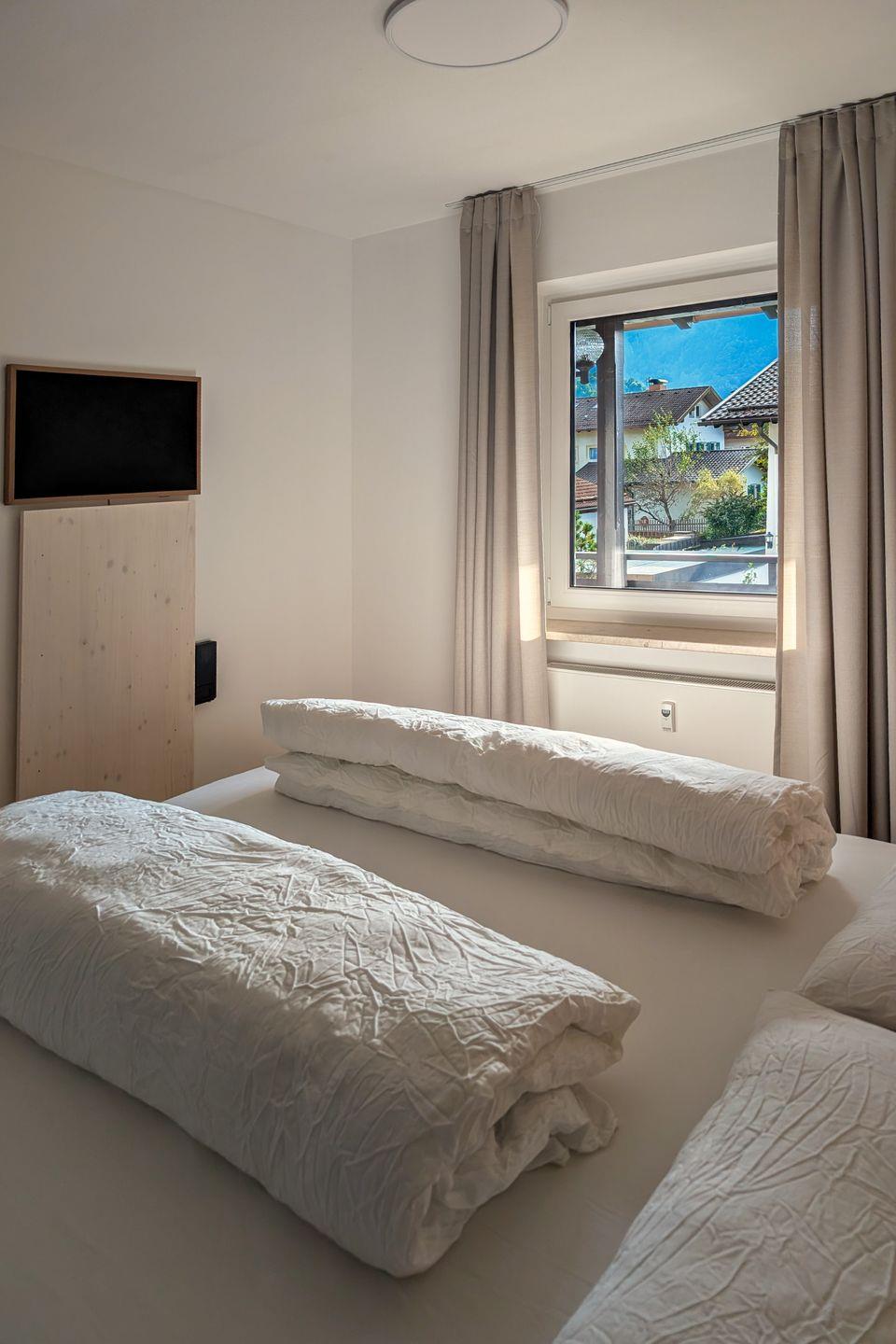 Innen überzeugt die Wohnung mit einem zeitgemäßen, modernen Stil: klare Linien und schlichte, hochwertige Einrichtung sorgen für Leichtigkeit, während viel Holz für Wärme und alpine Gemütlichkeit sorgt. Große Fenster lassen viel Tageslicht herein und holen den Bergblick direkt in den Wohnraum. Das gemütliche Wohnzimmer bietet ein bequemes Sofa, Fernseher und einen Schreibtisch am Fenster – perfekt, um zwischendurch in Ruhe zu arbeiten oder zum Lesen mit Aussicht. Aussicht genießen Sie auch auf dem gemütlichen Süd-Westbalkon, der nahezu ganztägig Sonnenstunden an der frischen Luft bietet. Im Schlafzimmer schlafen Sie erholsam im Doppelbett und ein Kleiderschrank bietet Stauraum für Gepäck. Der Essbereich mit traditioneller Eckbank-Garnitur, verleiht der Wohnung einen charmanten, alpenländischen Akzent und lädt zum Beisammensitzen ein. Gleich daneben liegt die separate, voll ausgestattete Küche, in der Sie flexibel vom Frühstück bis zum Abendessen alles zubereiten können.