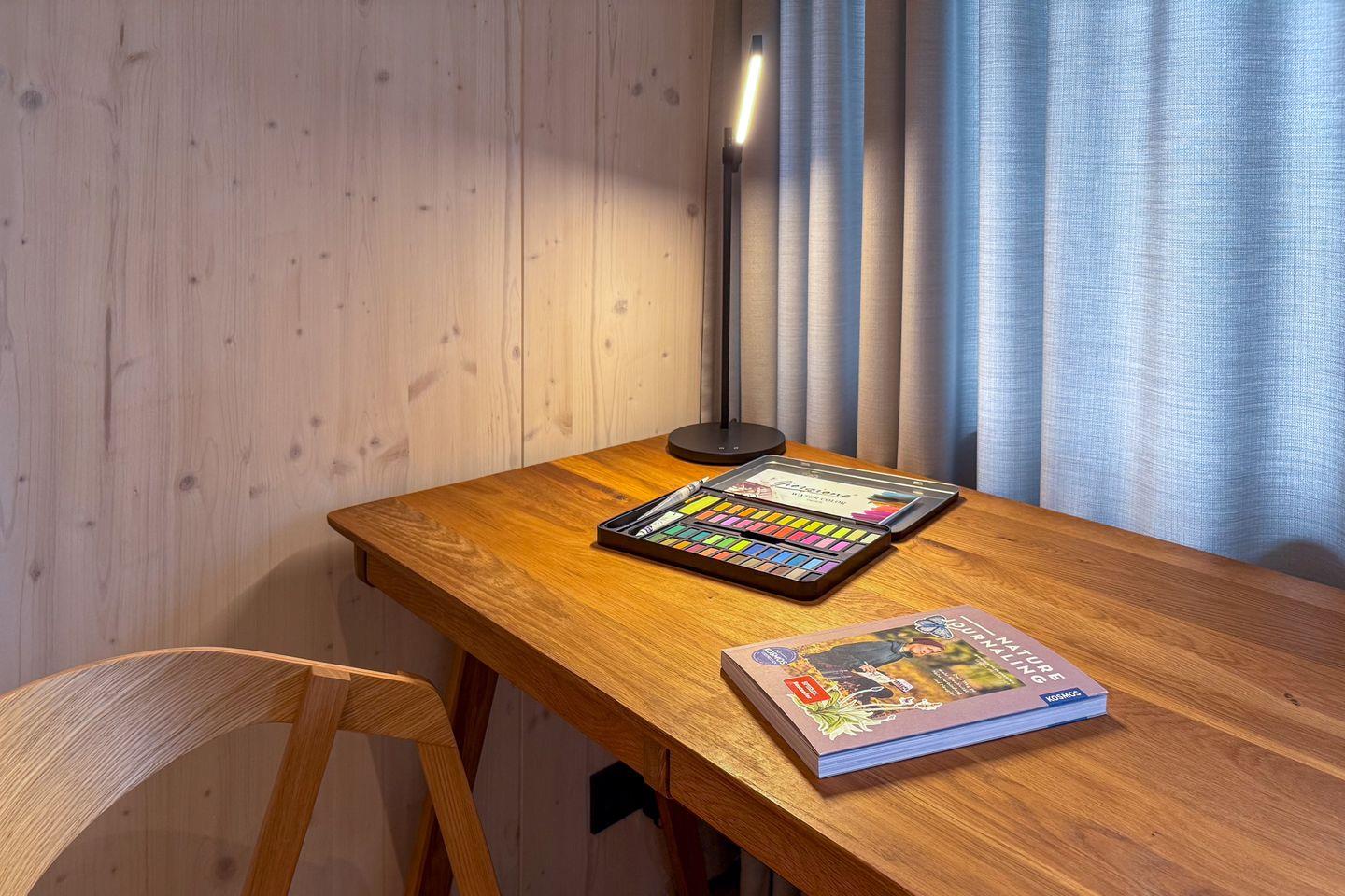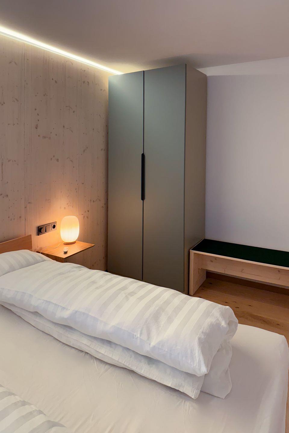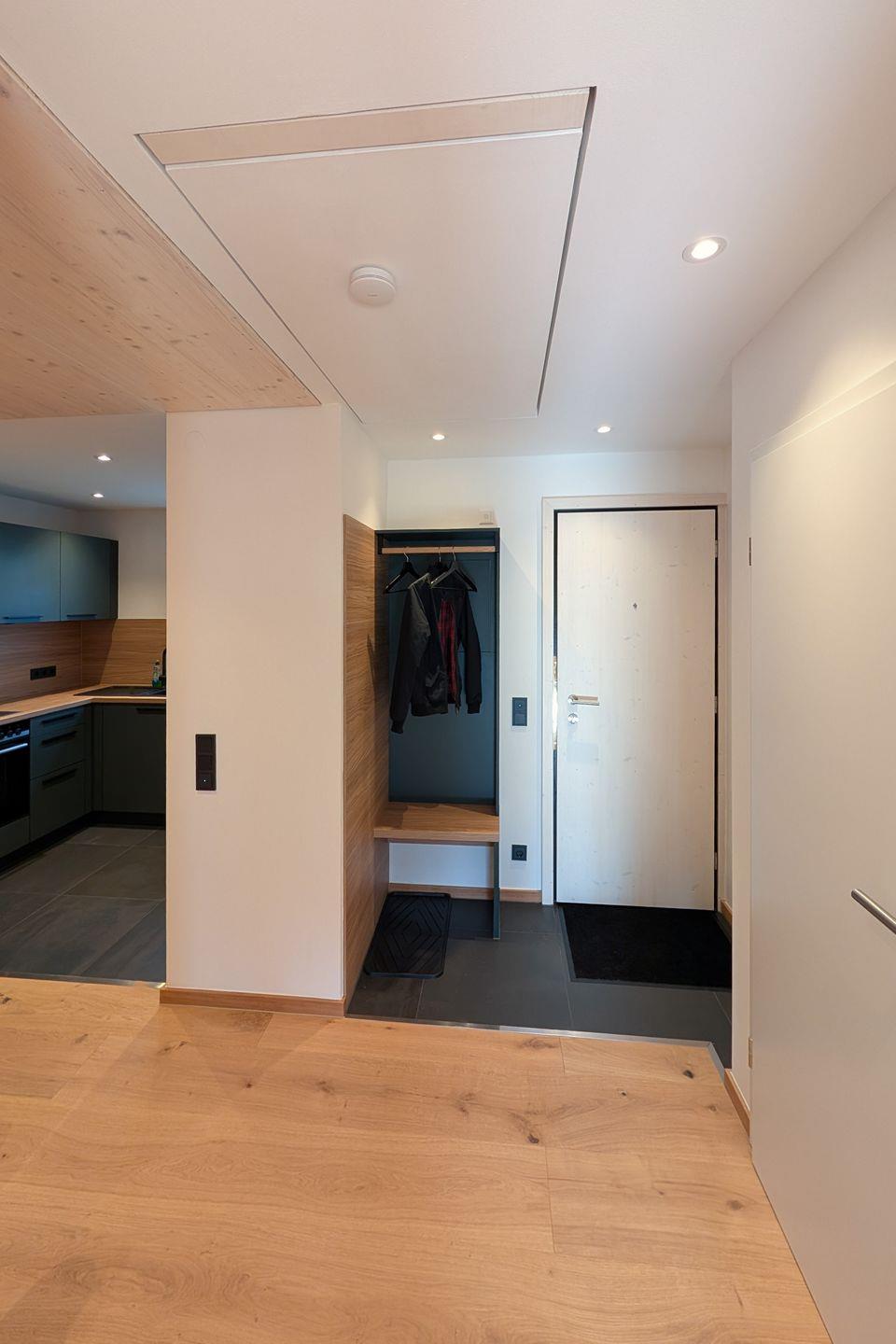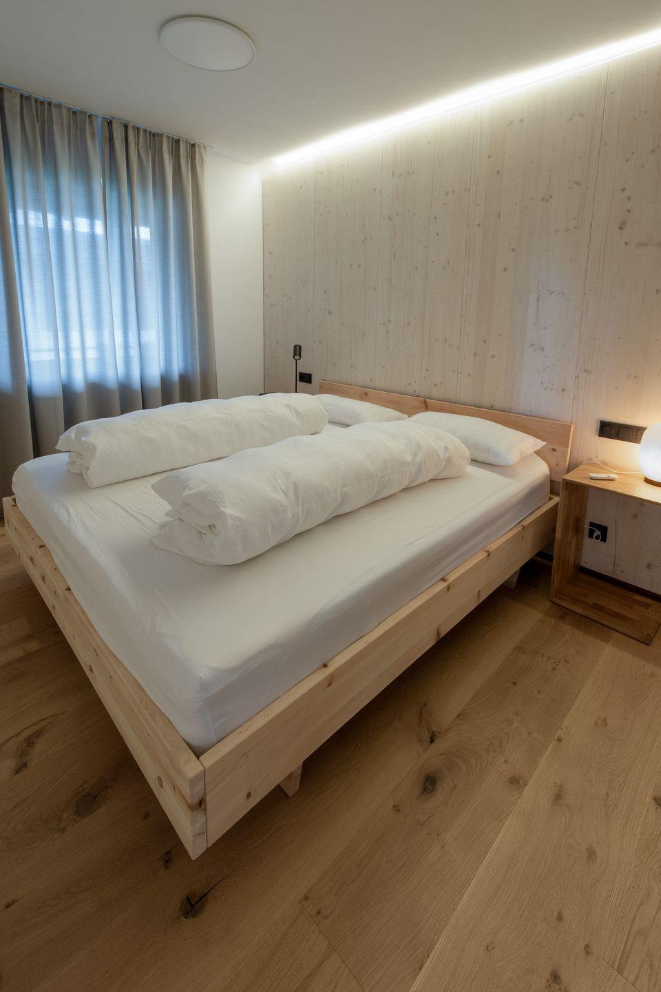 Innen überzeugt die Wohnung mit einem zeitgemäßen, modernen Stil: klare Linien und schlichte, hochwertige Einrichtung sorgen für Leichtigkeit, während viel Holz für Wärme und alpine Gemütlichkeit sorgt. Große Fenster lassen viel Tageslicht herein und holen den Bergblick direkt in den Wohnraum. Das gemütliche Wohnzimmer bietet ein bequemes Sofa, Fernseher und einen Schreibtisch am Fenster – perfekt, um zwischendurch in Ruhe zu arbeiten oder zum Lesen mit Aussicht. Aussicht genießen Sie auch auf dem gemütlichen Süd-Westbalkon, der nahezu ganztägig Sonnenstunden an der frischen Luft bietet. Im Schlafzimmer schlafen Sie erholsam im Doppelbett und ein Kleiderschrank bietet Stauraum für Gepäck. Der Essbereich mit traditioneller Eckbank-Garnitur, verleiht der Wohnung einen charmanten, alpenländischen Akzent und lädt zum Beisammensitzen ein. Gleich daneben liegt die separate, voll ausgestattete Küche, in der Sie flexibel vom Frühstück bis zum Abendessen alles zubereiten können.