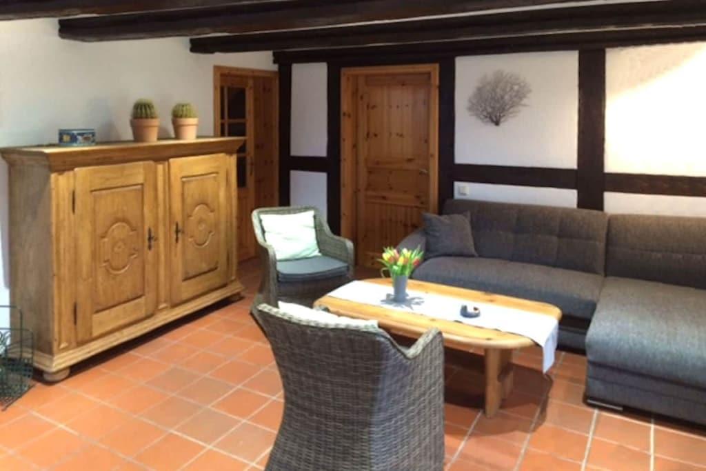 Ferielejlighed nr. 1 i "Landhaus zur Wiek" på Rügen tilbyder plads, komfort og afslapning for maksimalt 6 personer + 1 lille barn. Navnet "Storchensicht" (Storkudsigt) på ferielejligheden afspejler dens rolige, naturlige beliggenhed. To soveværelser er placeret på øverste etage, mens stuen med det tilstødende nye køkken, et af soveværelserne og brusebadet er i stueetagen, hvilket gør lejligheden ideel for rejsende med lette bevægelseshæmninger eller ældre gæster. Landstedet har internet/Wi-Fi og en vaskemaskine (gratis) samt en velholdt sauna (mod betaling) i en tilstødende bygning. Efter aftale med os er maksimalt én hund (mod betaling) tilladt pr. lejlighed – ikke flere hunde, og ingen meget store, farlige dyr eller kamphunde. Lejligheden er designet til vores gæsters afslapning af høj kvalitet – vi accepterer ikke typiske grupperejser.