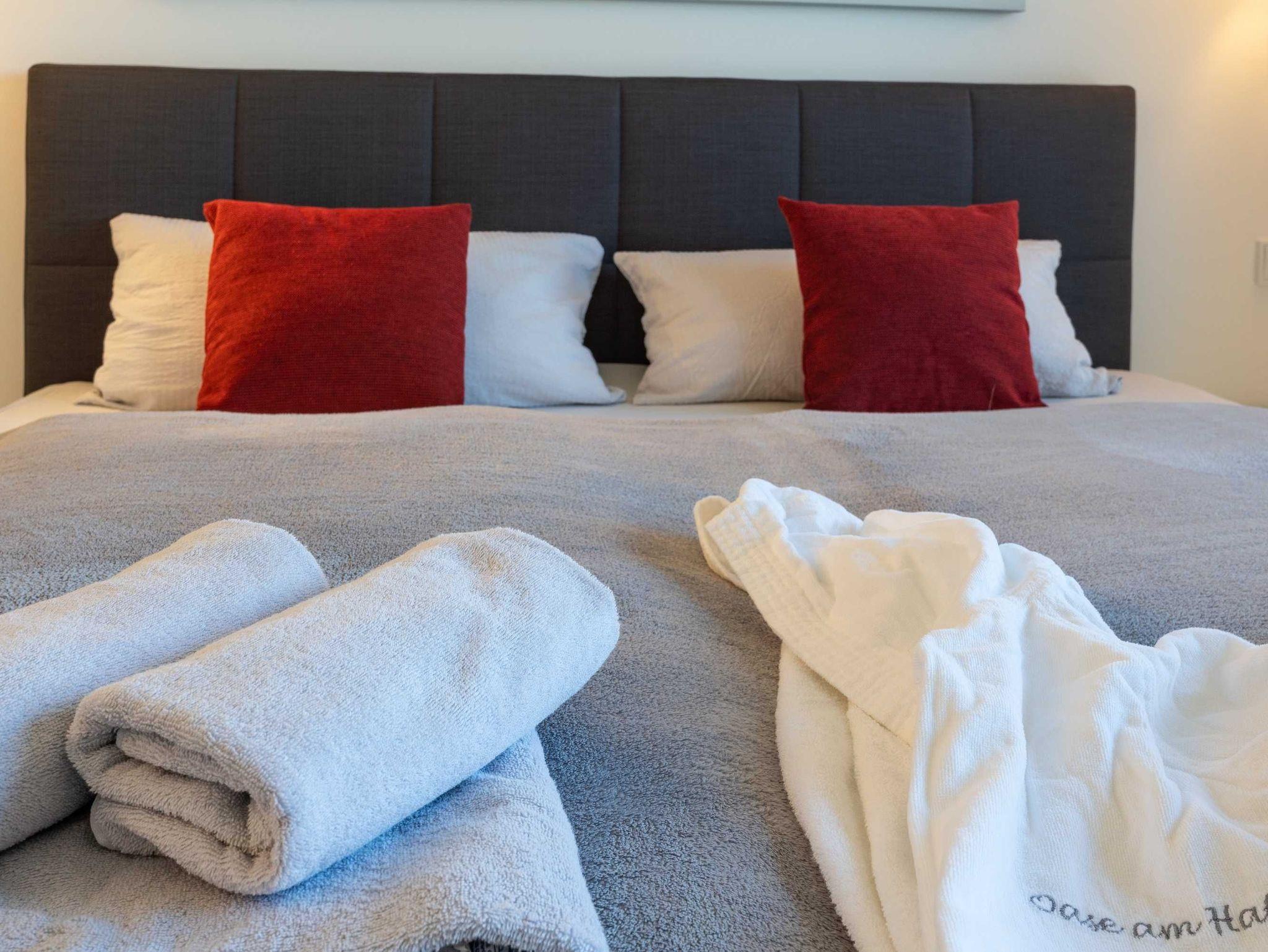 Für Ihren Aufenthalt stellen wir Ihnen Bettwäsche und Handtücher zur Verfügung. Ansprechpartnerinnen und Ansprechpartner sind vor Ort stets erreichbar.