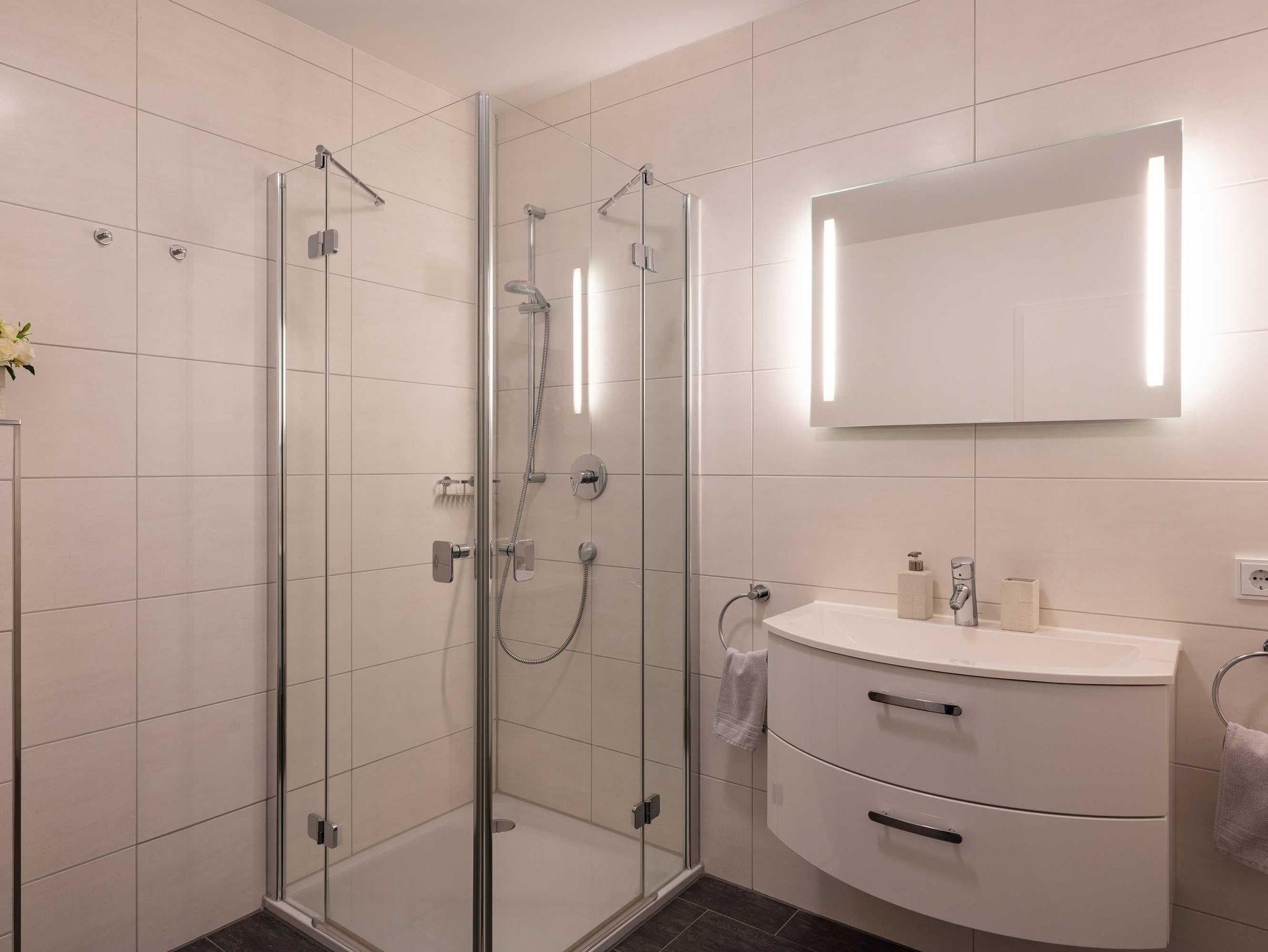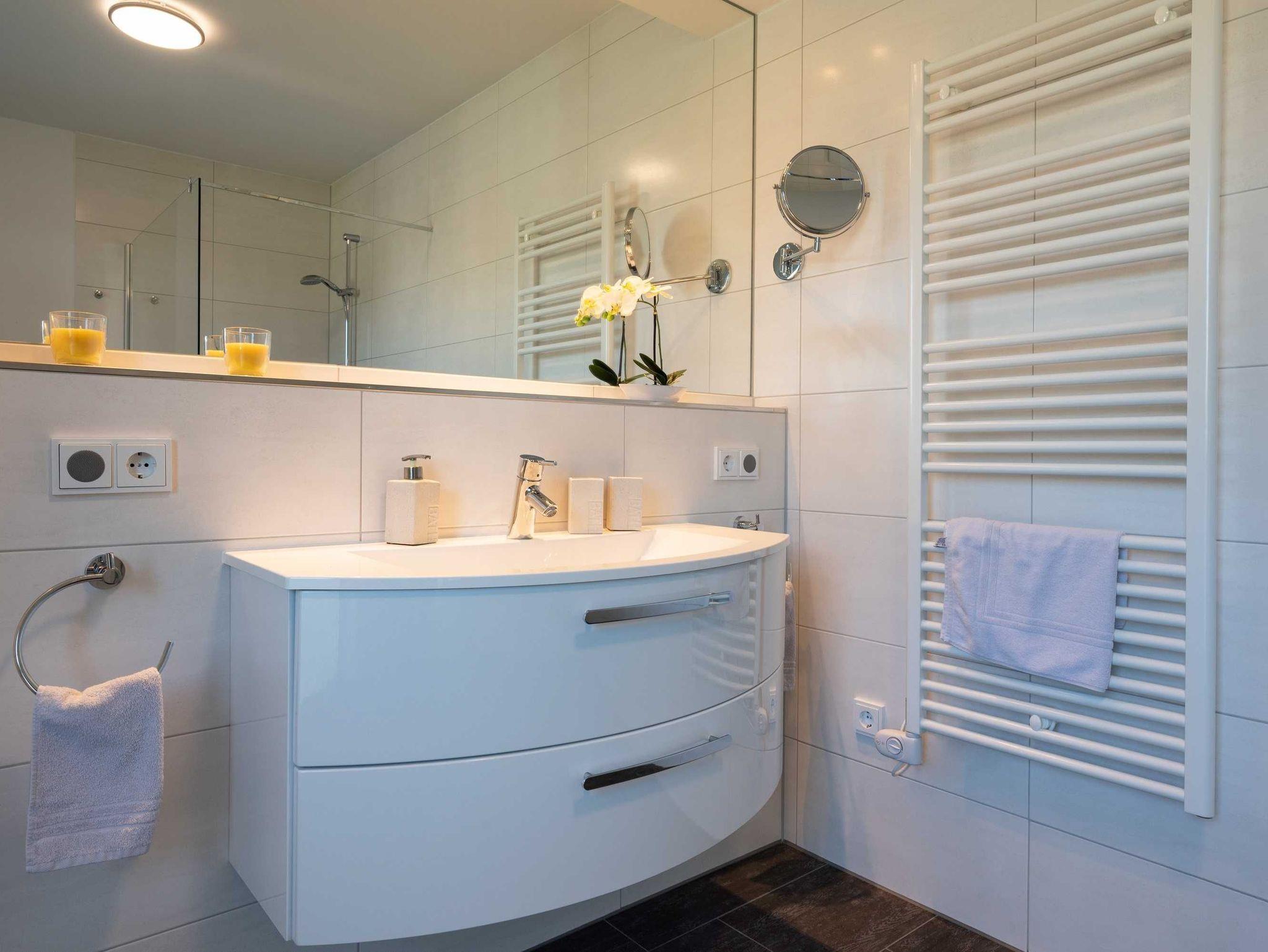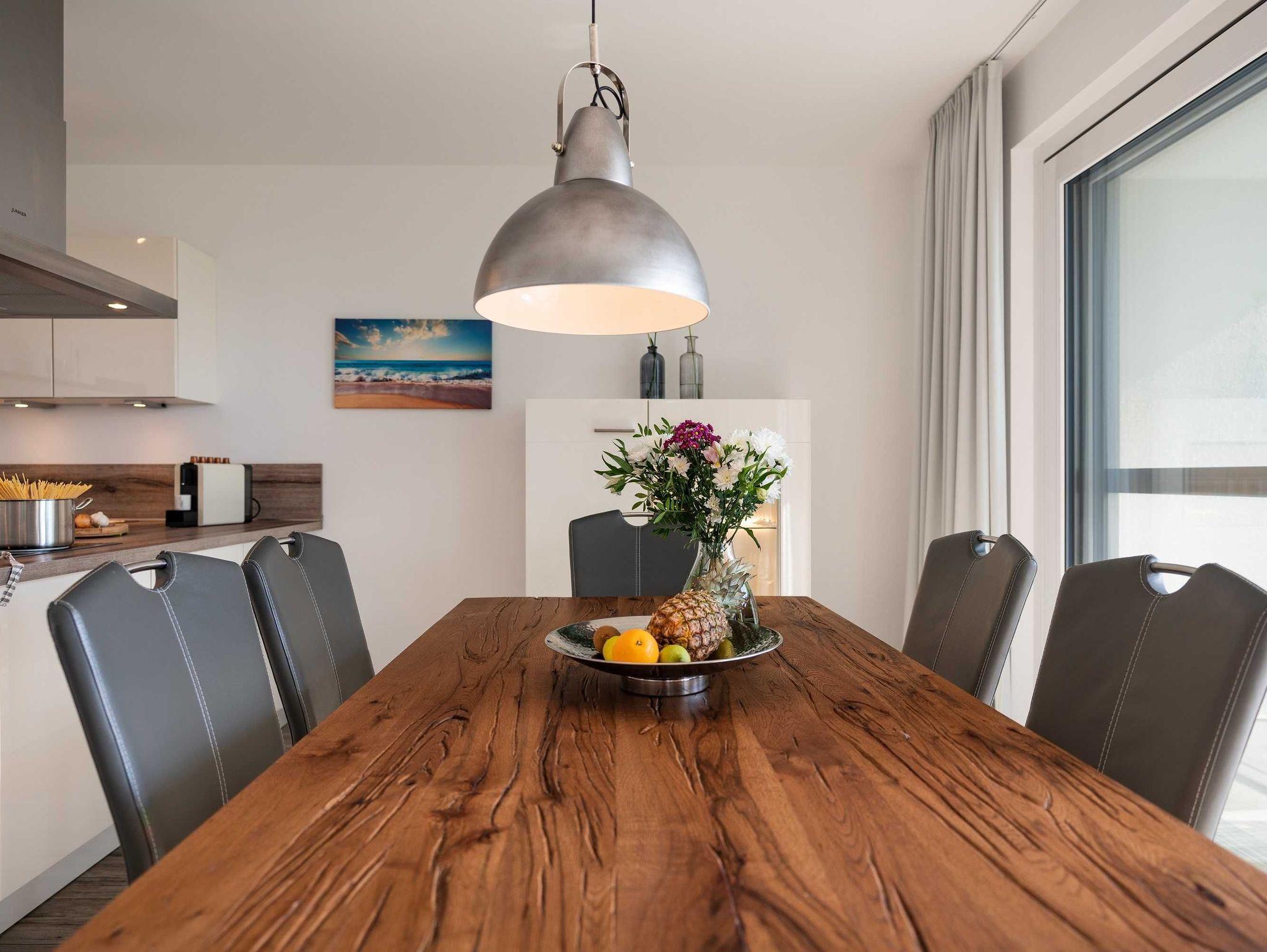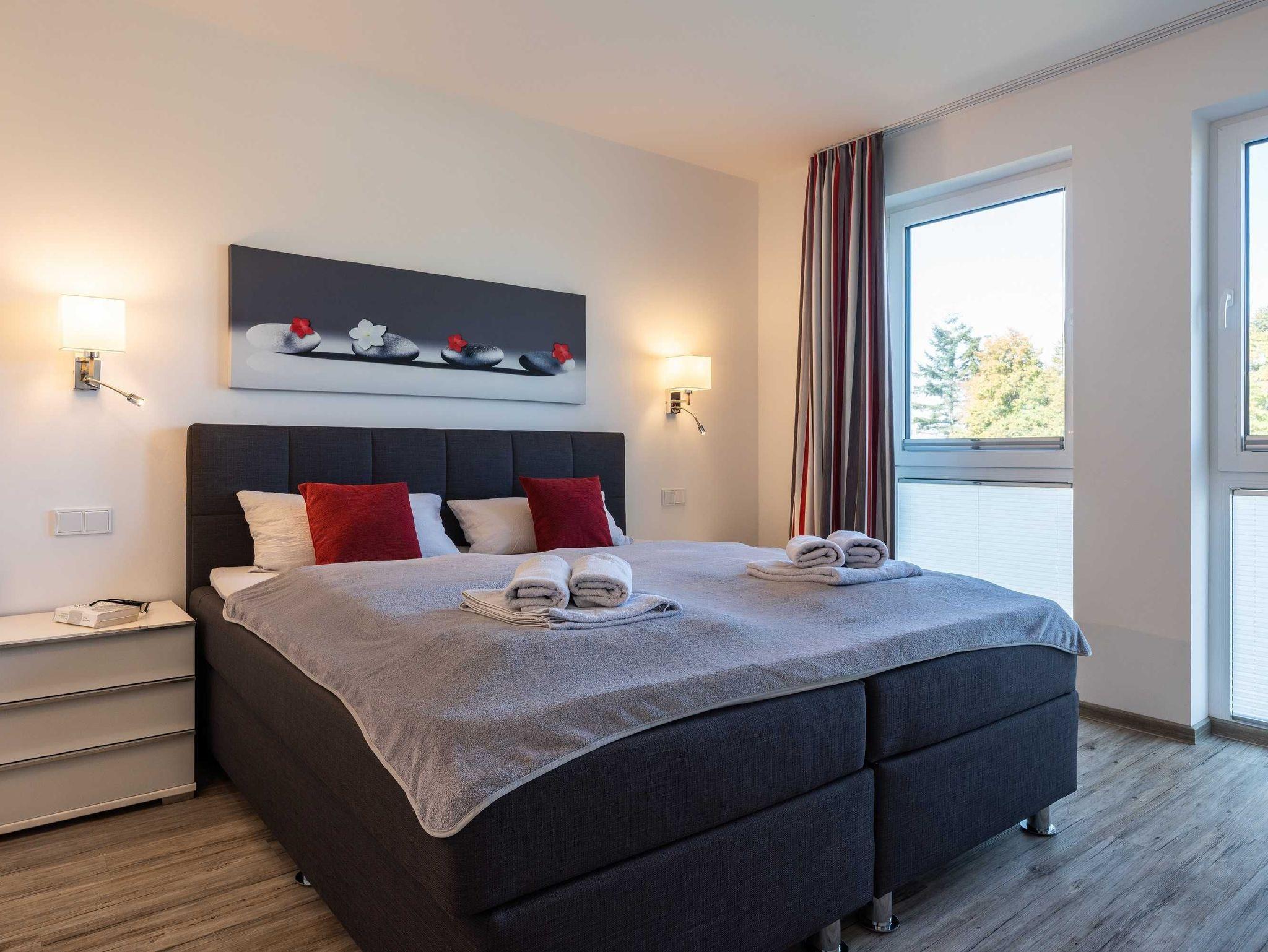 Diese luxuriöse 4-Zimmer-Wohnung im ersten Obergeschoss von Haus 1 (Aufzug vorhanden) mit Platz für maximal 6 Personen sowie einem Kleinkind bis 2 Jahre im Babybett verfügt über eine Wohnfläche von 119 m² und hat 3 Schlafzimmer sowie 2 voll ausgestattete Duschbäder. Die große Sonnenterrasse mit 17 m² liegt in idealer Süd-Ausrichtung. Die Wohnung ist modern eingerichtet mit offenem Wohn-Essbereich, großem Esstisch, Ledersofa sowie Flat-TV (inkl. Sky-Abo). Die hochwertig ausgestattete Küche, offen zum Wohnbereich, lässt keine Wünsche offen. Erholsamer Schlaf in den beiden Schlafzimmern mit Boxspringbetten und Flat-TV ist garantiert. Im dritten Schlafzimmer befindet sich ein bequemes Schlafsofa (Liegefläche: 1,80 x 2,00 m) und ein Flat-TV. Das Badezimmer en Suite ist mit einer begehbaren Dusche ausgestattet. Auf der großen, überdachten Sonnenterrasse mit Essgruppe und jeweils zwei Relax-Sesseln mit Fußhockern sowie einem Sonnenschirm können Sie die Seele baumeln lassen.