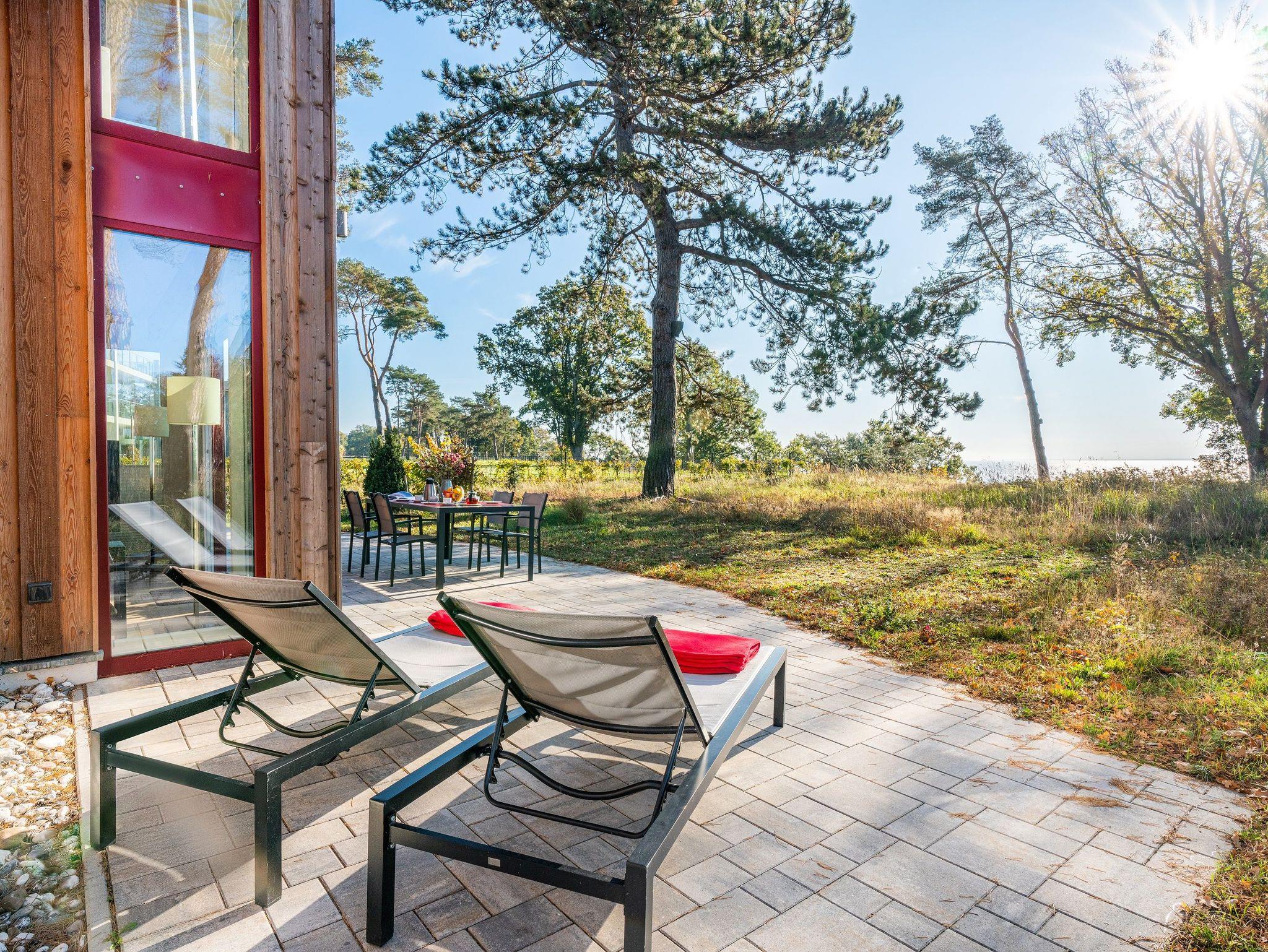 Im Sommer laden Sitzplätze und Sonnenliegen auf der ca. 50 m² großen Südterrasse zum Entspannen ein. Ein Elektrogrill steht für genussvolles Essen zur Verfügung. Traumhafte Sonnenuntergänge genießen Sie am besten bei einem Glas Wein direkt an der Kliffkante. Vom Esszimmer aus betreten Sie die ca. 20 m² große Westterrasse. Somit können Sie je nach Sonnenstand Ihren Aufenthalt im Freien genießen. Das 8.000 m² große und zum Haff nicht gezäunte Grundstück ist weitestgehend naturbelassen (keine Zierrasenfläche) und wird gern von Wild und Vögeln aller Art besucht. Hier darf wachsen, was der Boden hergibt.