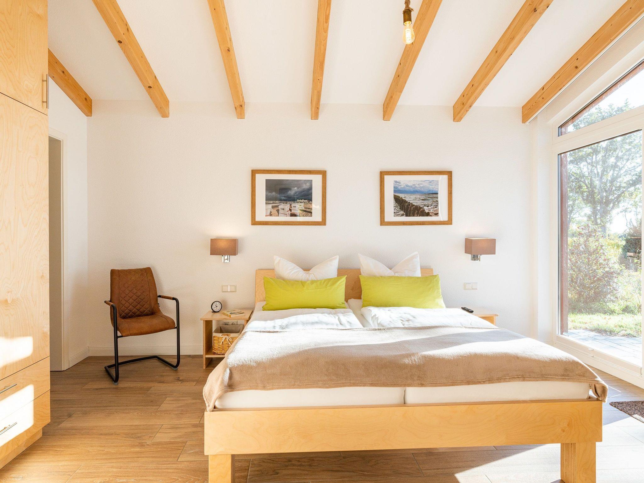 Über die schöne Holztreppe erreichen Sie das Obergeschoss. Hier steht Ihnen ein weiteres Wohnzimmer zur Verfügung. Der großartige Blick auf das Haff durch die bodentiefen Fenster wird Sie jeden Tag verzaubern. Im Obergeschoss befindet sich das zweite Schlafzimmer mit Doppelbett (1,80 x 2,00 m) sowie ein WC.