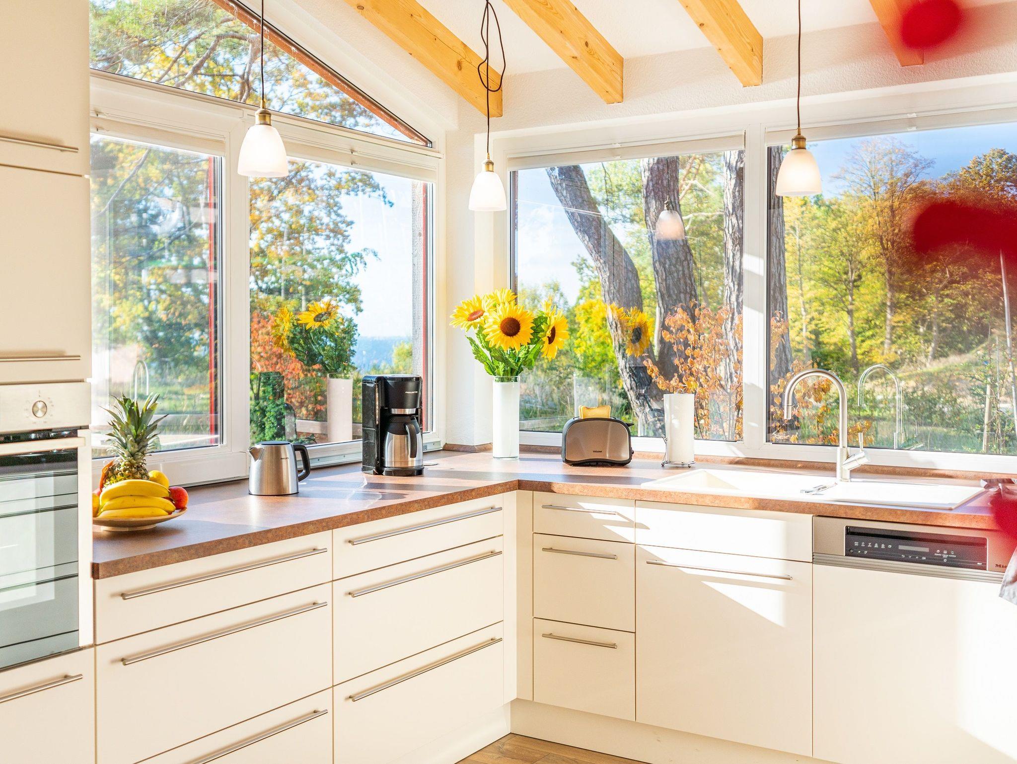 Der große Koch- und Essbereich ist vom Wohnzimmer aus zu betreten und nach Südwesten ausgerichtet. Er verfügt über Geschirrspüler, Induktionskochfeld, Mikrowelle und Kühl-/Gefrierkombination.