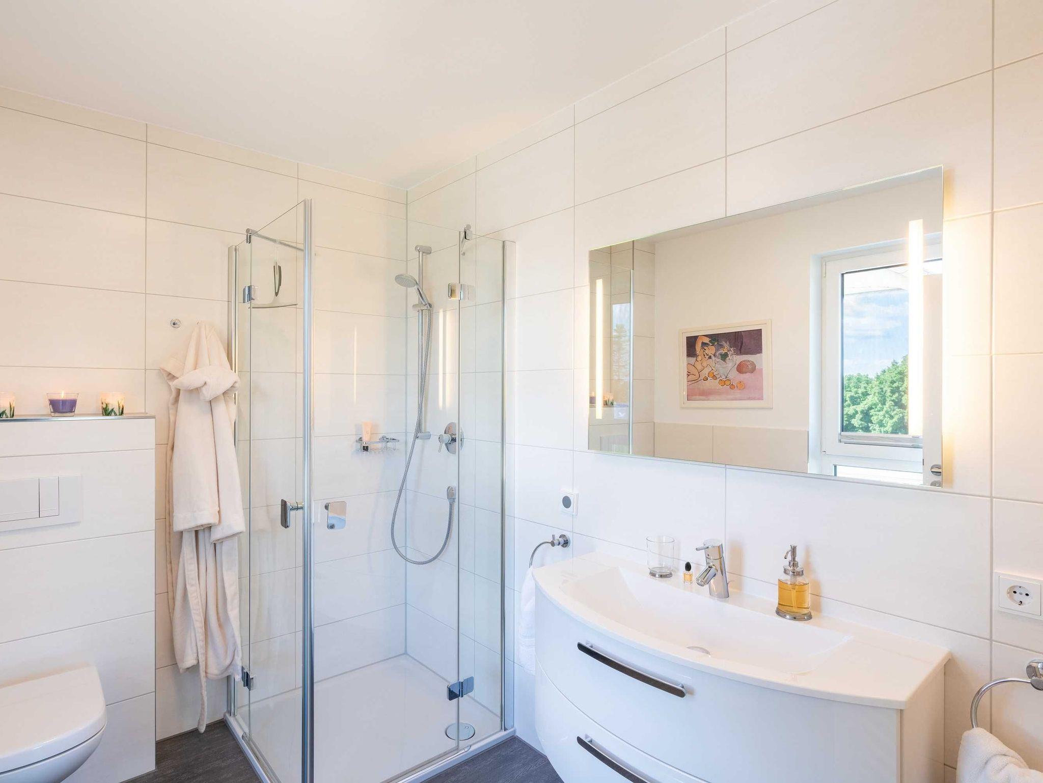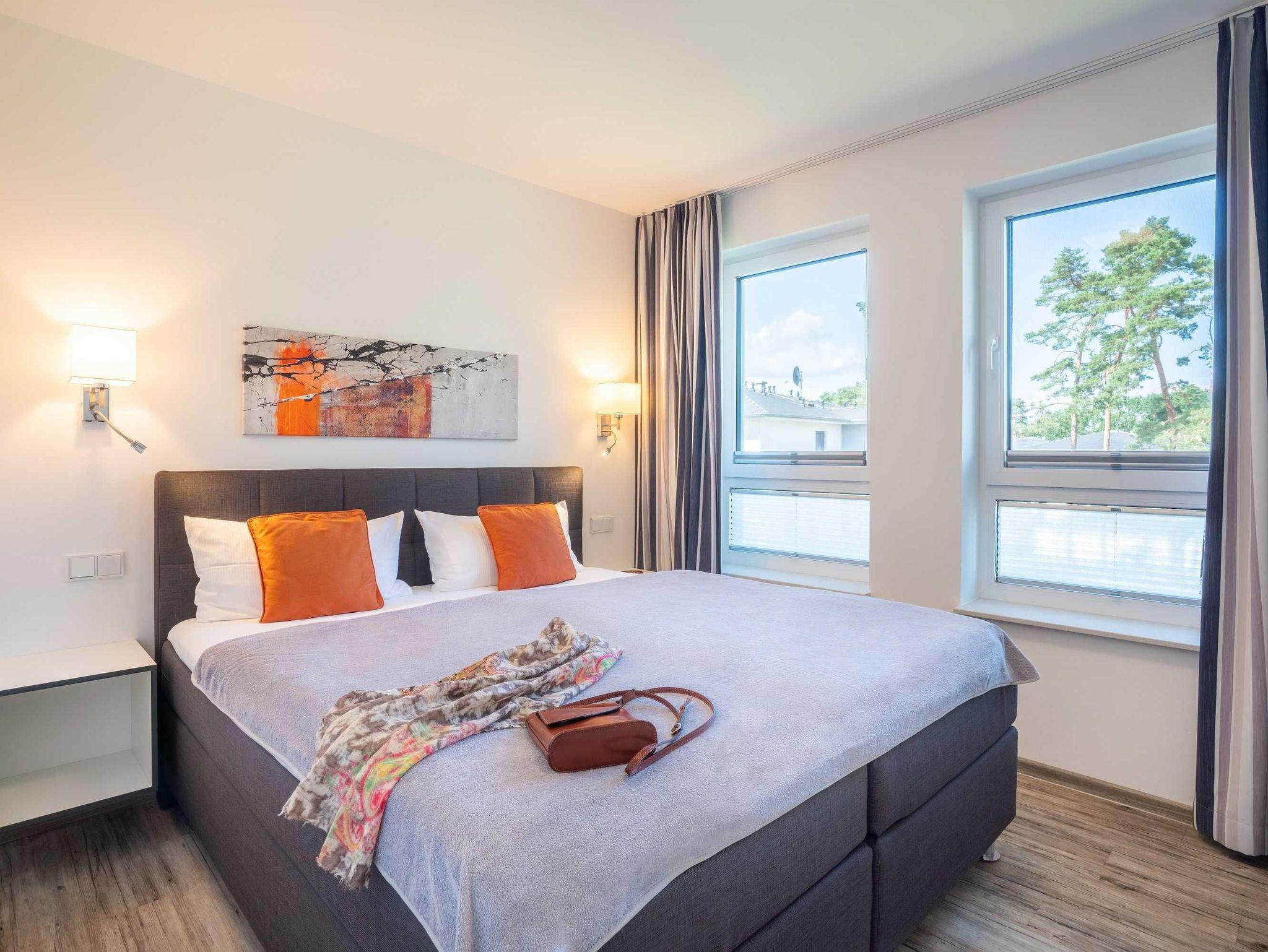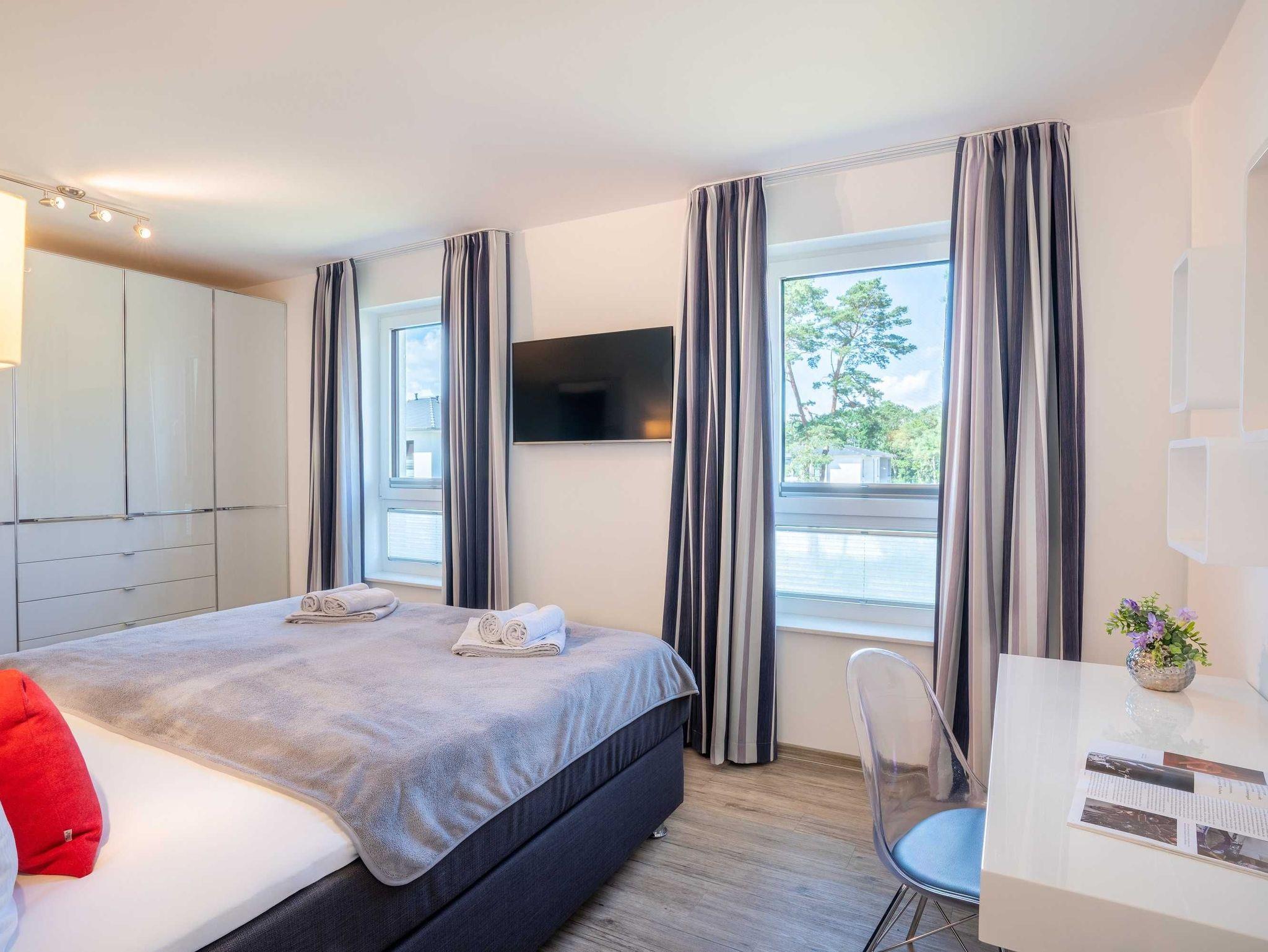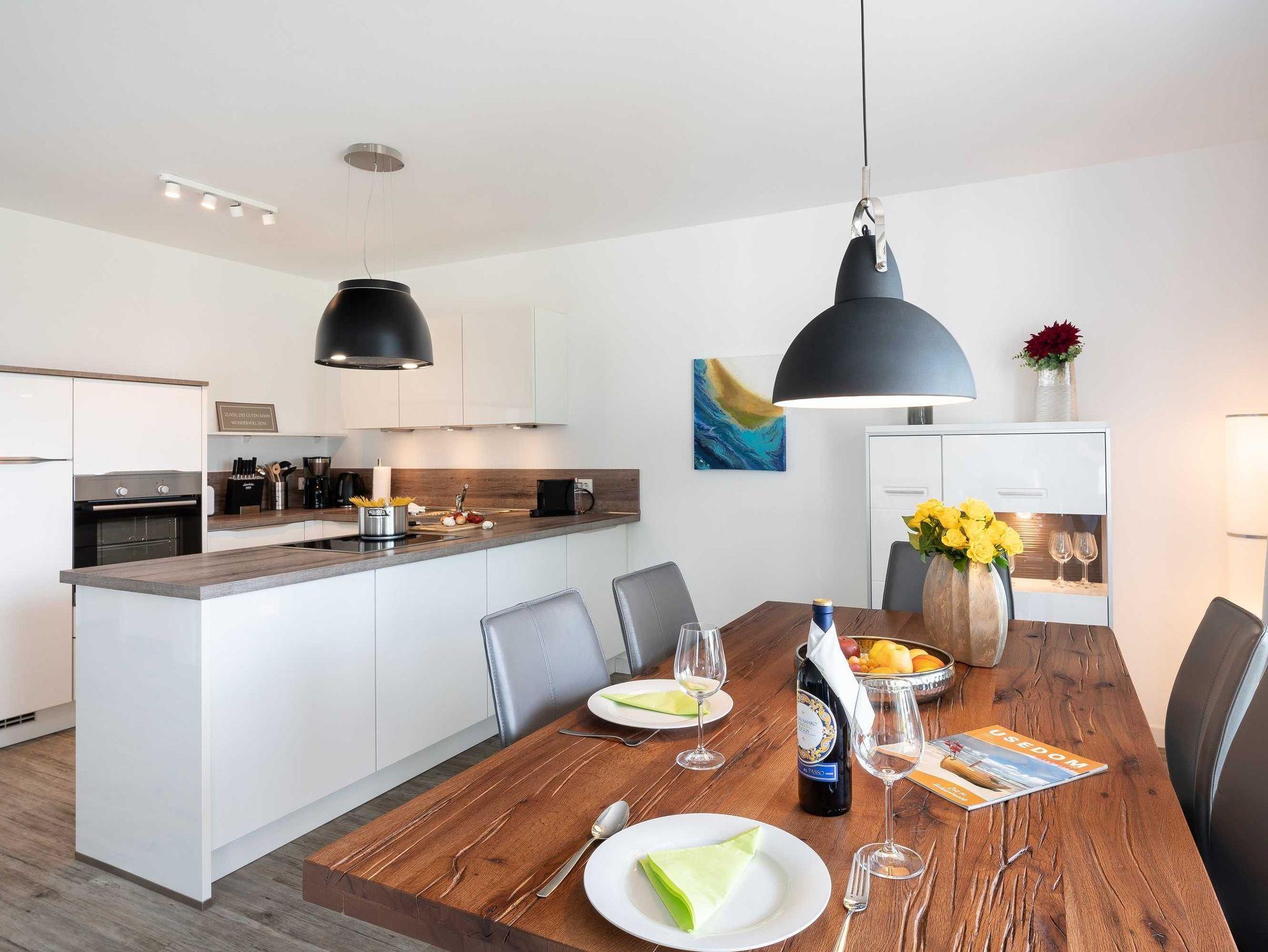 Diese lichtdurchflutete, helle 3-Zimmer-Wohnung im obersten Geschoss von Haus 1 (Aufzug vorhanden) mit Platz für maximal 4 Personen sowie einem Kleinkind bis 2 Jahre im Babybett verfügt über eine Wohnfläche von 94 m² und hat 2 Schlafzimmer sowie 2 voll ausgestattete Duschbäder. Die große Sonnenterrasse mit 17 m² liegt in idealer Süd-Ausrichtung. Die Wohnung ist modern eingerichtet mit offenem Wohn-Essbereich, großem Esstisch, Ledersofa sowie Flat-TV (inkl. Sky-Abo). Die hochwertig ausgestattete Küche, offen zum Wohnbereich, lässt keine Wünsche offen. Erholsamer Schlaf in den beiden Schlafzimmern mit Boxspringbetten und Flat-TV ist garantiert. Das Badezimmer en Suite ist mit einer Duschtasse ausgestattet. Auf der großen, überdachten Sonnenterrasse mit Essgruppe und jeweils zwei Relax-Sesseln mit Fußhockern sowie einem Sonnenschirm können Sie die Seele baumeln lassen.