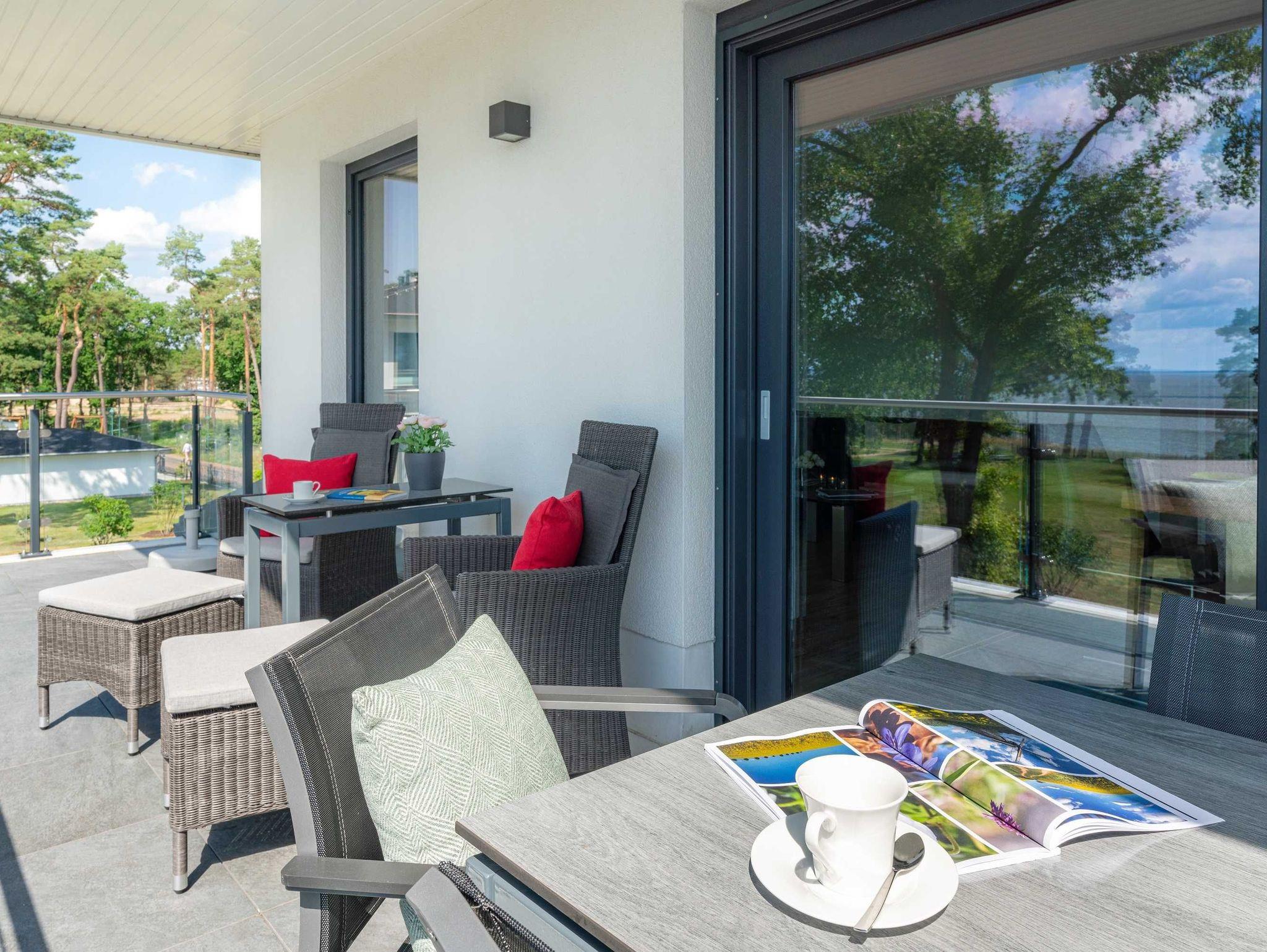Alle Terrassenwohnungen und Appartements sind mit viel Liebe zum Detail in hochwertiger Ausstattung eingerichtet. Von großen Rasenflächen und ebenen Gehwegen umgeben, stehen unsere Ferienhäuser auf die Haffküste ausgerichtet und auf einer weitflächigen Außenanlage zueinander. Unsere Haffterrassen laden mit Sitzgelegenheiten an der Steilküste zum Entspannen bei einem Glas Wein ein.