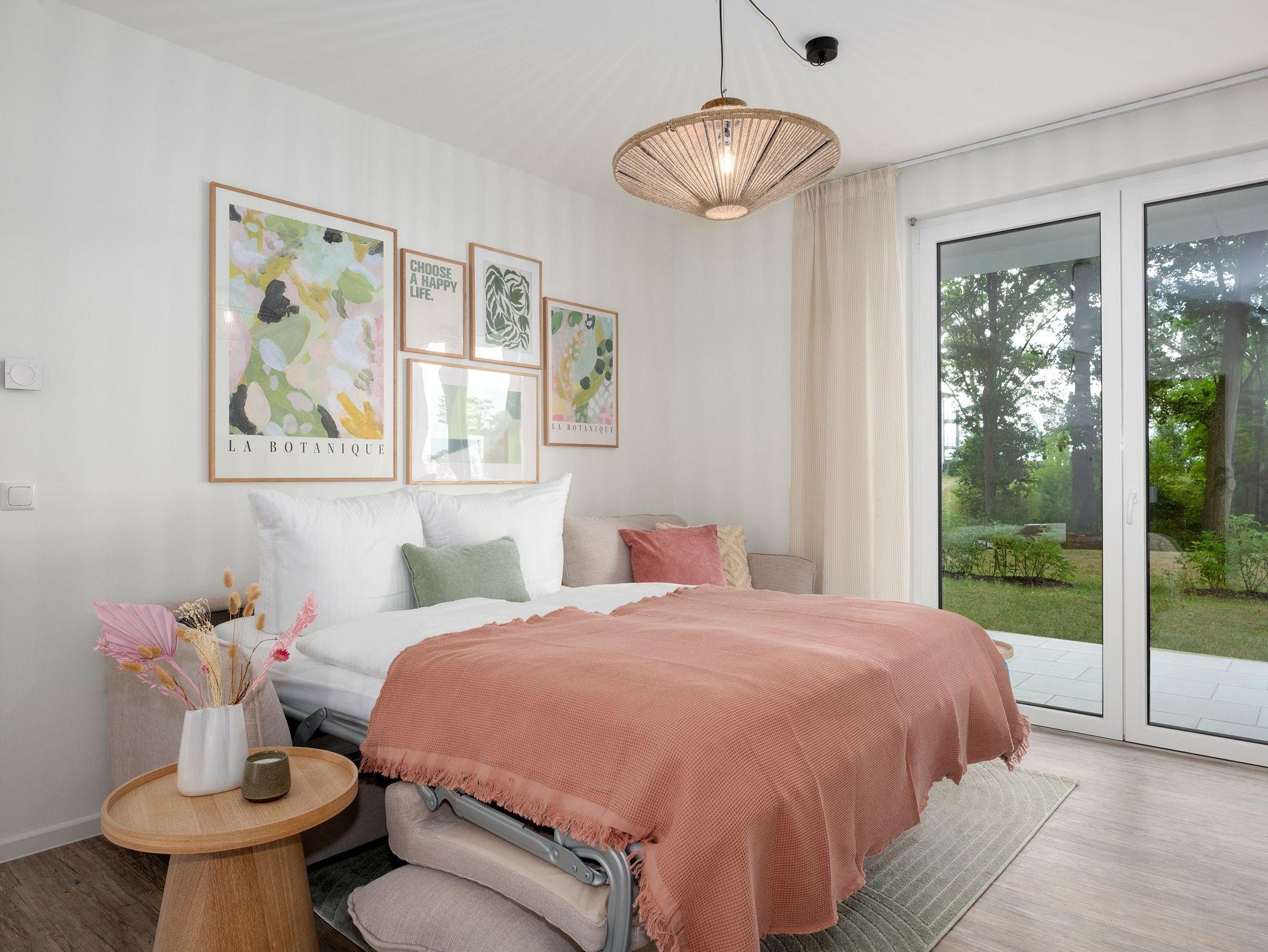 Im separaten Schlafzimmer mit komfortablem Doppelbett in Überlänge (2,10?m) finden Sie erholsamen Schlaf. Das moderne Duschbad bietet praktischen Komfort im Alltag. Der offene Wohnbereich mit Schlafcouch und direktem Zugang zur möblierten Sonnenterrasse lädt zu entspannten Stunden im Freien ein ? ob beim Frühstück oder einem ruhigen Abend mit Blick ins Grüne.