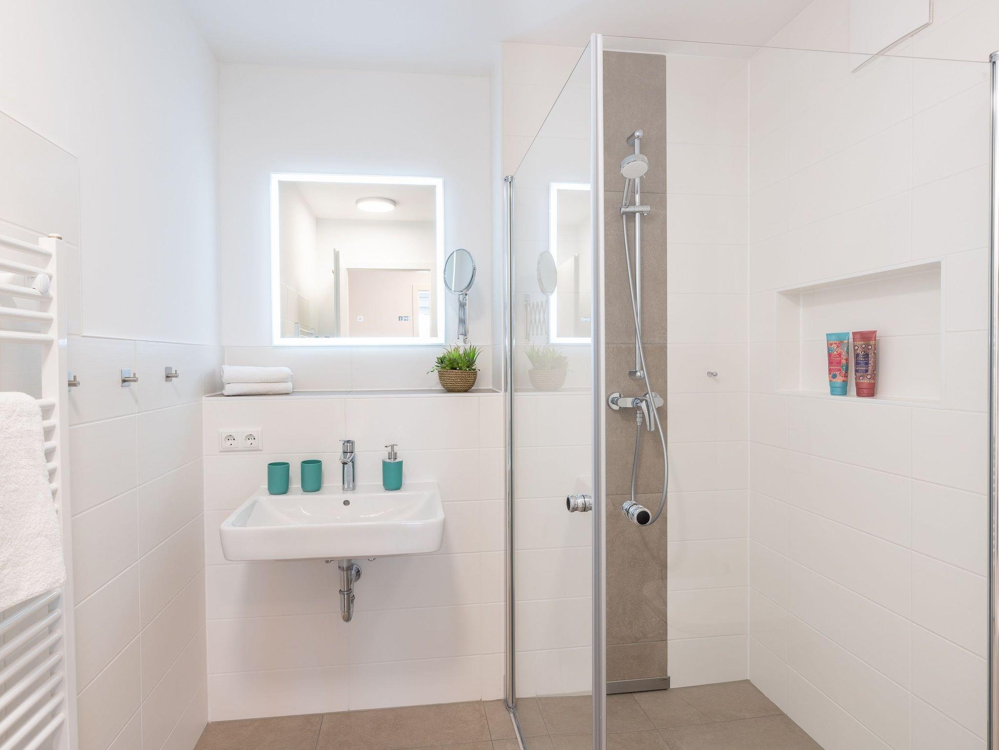 Das vollausgestattete Badezimmer verfügt über eine ebenerdige Dusche, WC, Waschtischanlage sowie Fön.