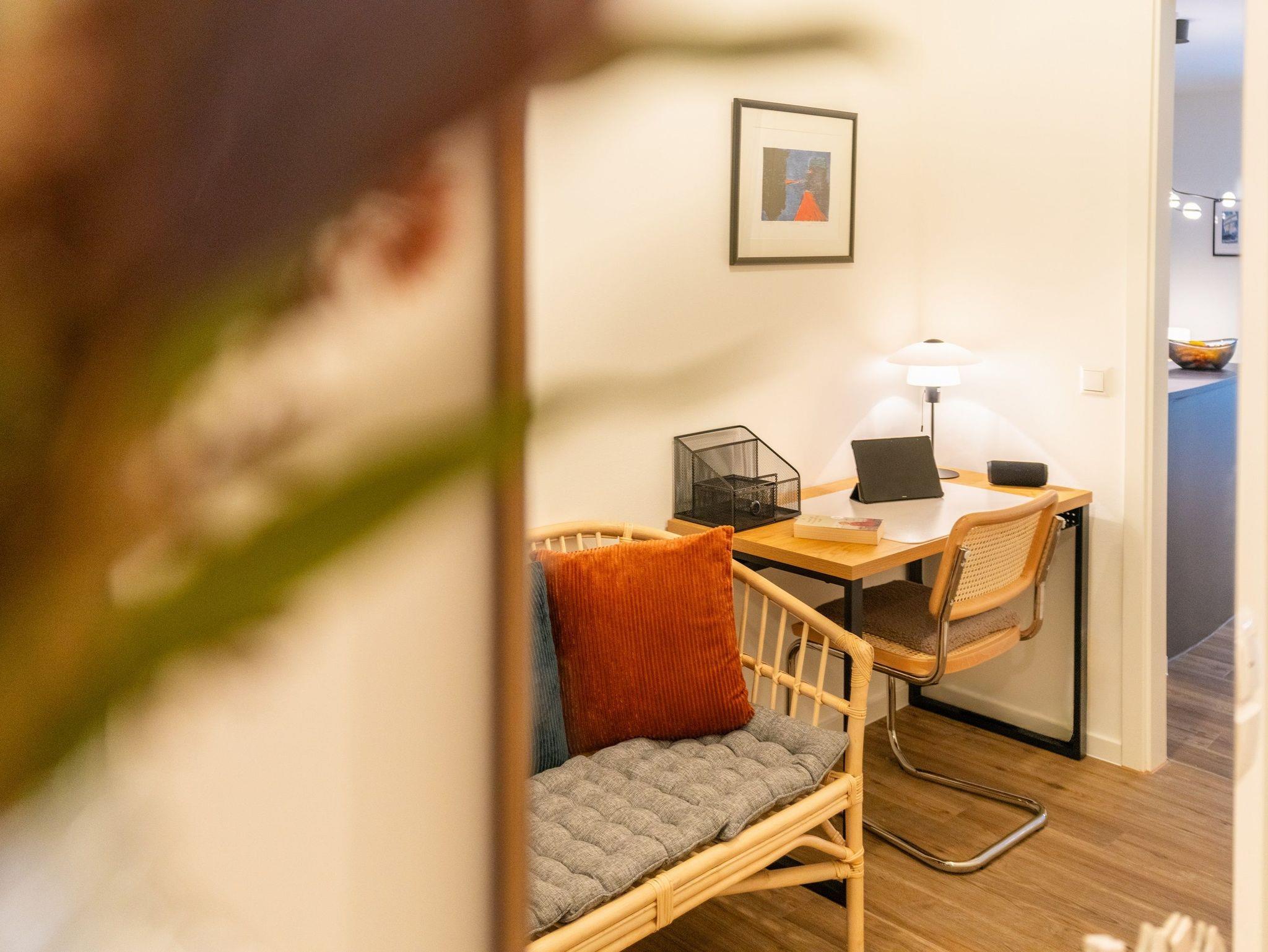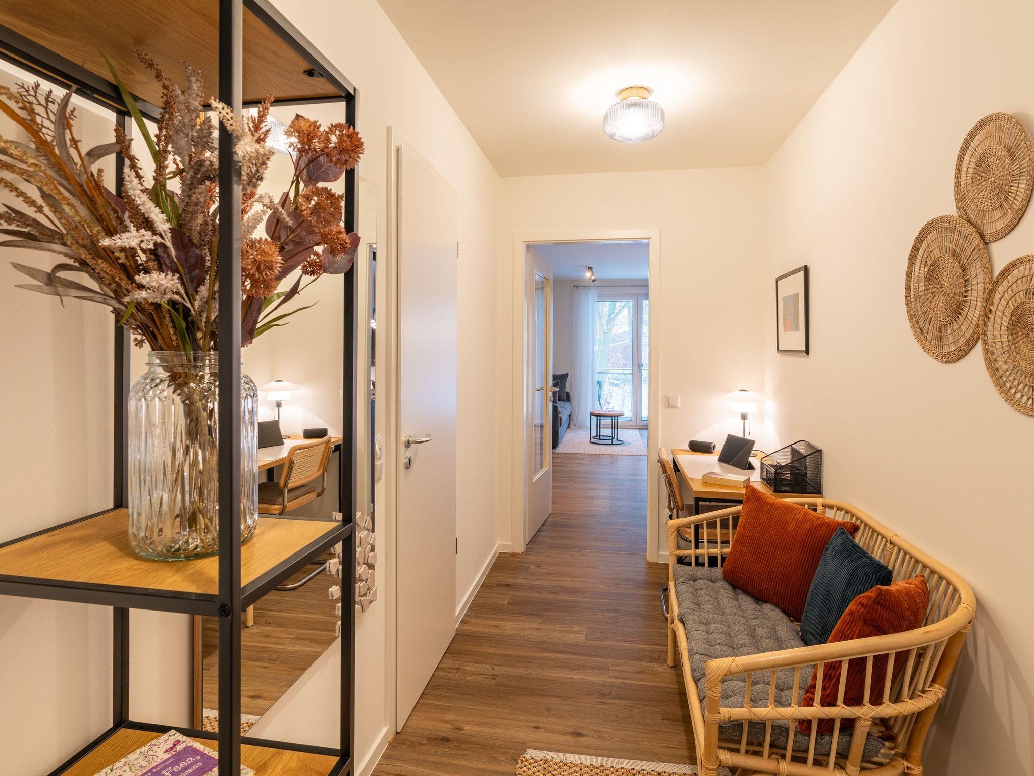 In einer einladenden Ecke im geräumigen Eingangsbereich des Apartments findet sich ein stilvoller Schreibtisch, der als Arbeitsbereich fungiert.