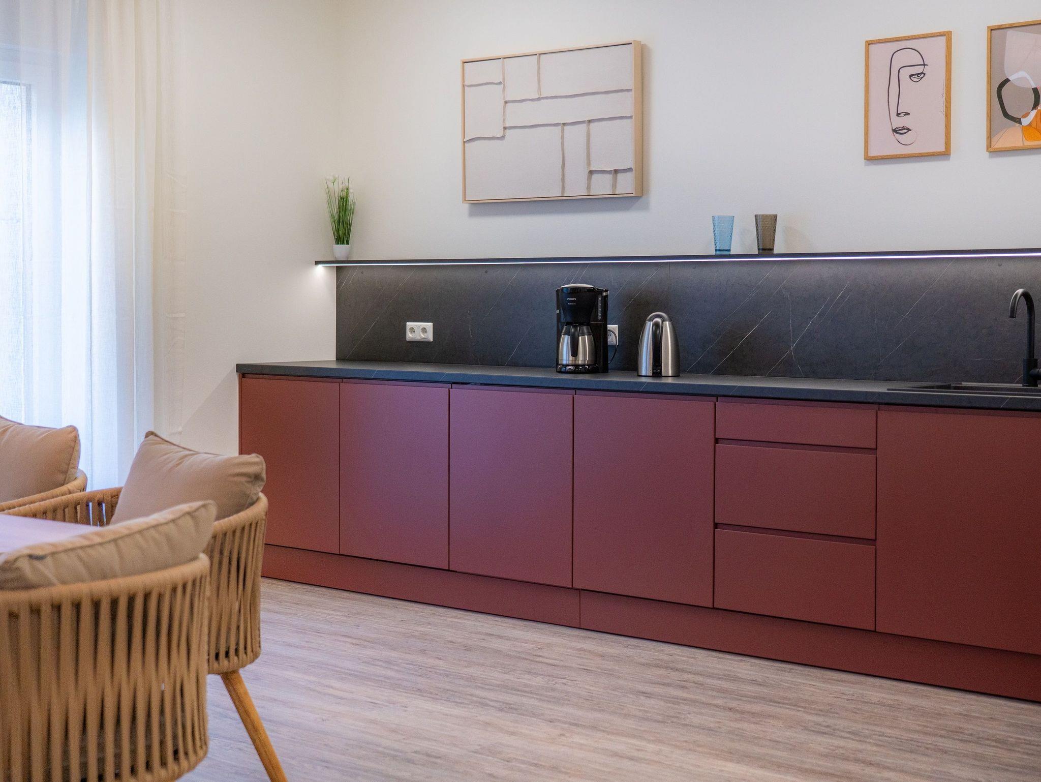 Die Küchenzeile verfügt über hochwertige Geräte wie Herd, Backofen mit integrierter Mikrowelle, 2-Platten-Induktionskochfeld, Kaffeefiltermaschine, Kühlschrank mit Gefrierfach, Nespressomaschine mit Milchaufschäumer sowie Spülmaschine. Ausreichend Geschirr, Besteck sowie Töpfe und Pfannen befinden sich in den Schränken. Am Esstisch finden Sie vor einem erholsamen Urlaubstag zu einem gemeinsamen Frühstück zusammen.
