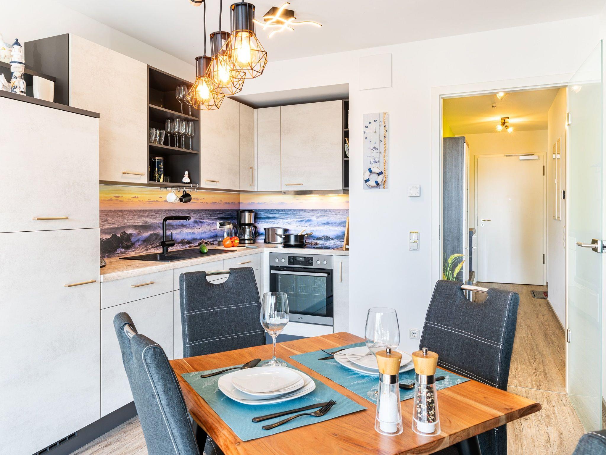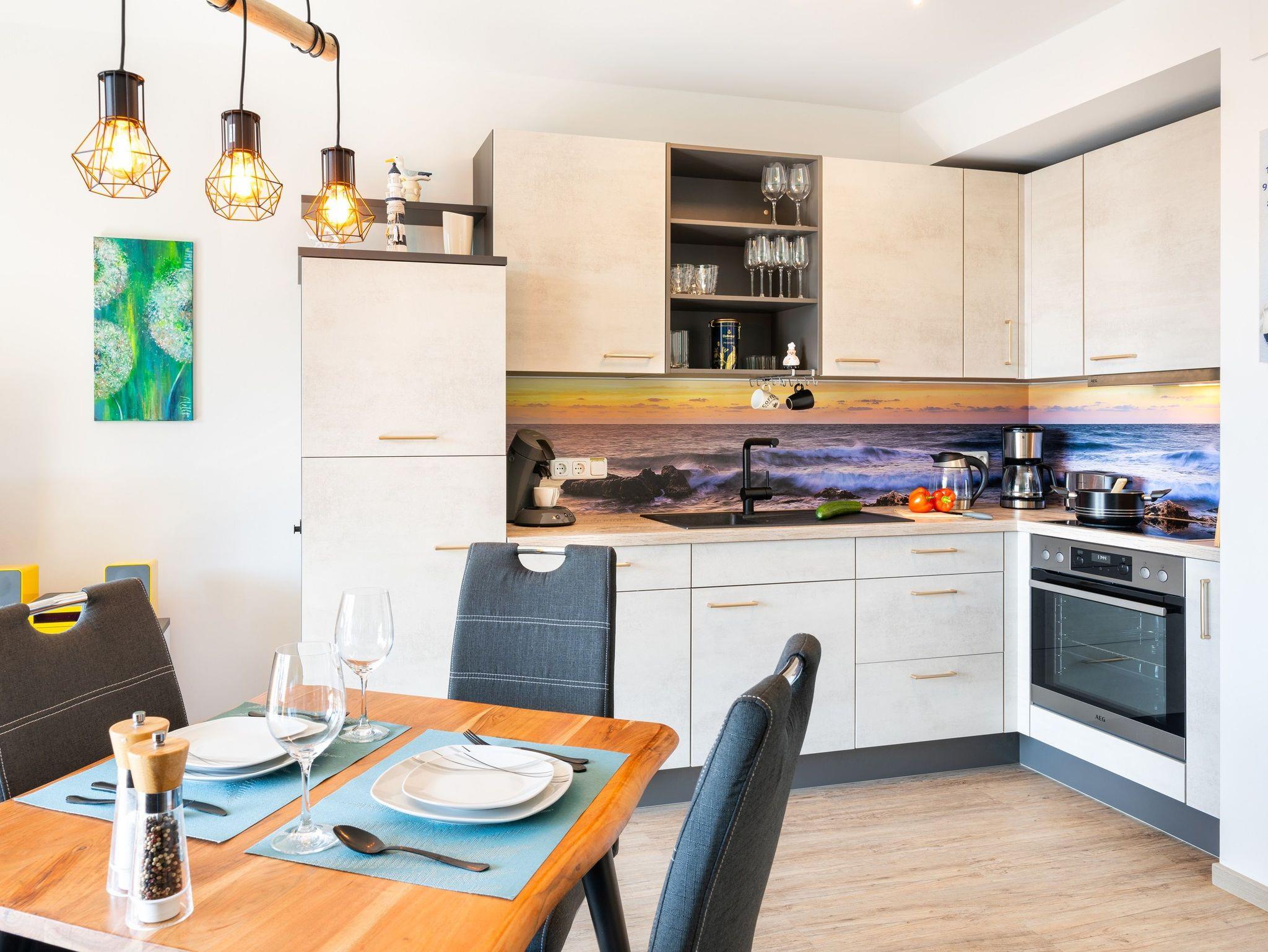 Die Küchenzeile verfügt über hochwertige Geräte wie Herd, Kaffeepadmaschine, Mikrowelle, Backofen, Kaffeefiltermaschine, Kühlschrank mit Gefrierfach sowie Spülmaschine. Ausreichend Geschirr, Besteck sowie Töpfe und Pfannen befinden sich in den Schränken. Am Esstisch finden Sie vor einem erholsamen Urlaubstag zu einem gemeinsamen Frühstück zusammen.