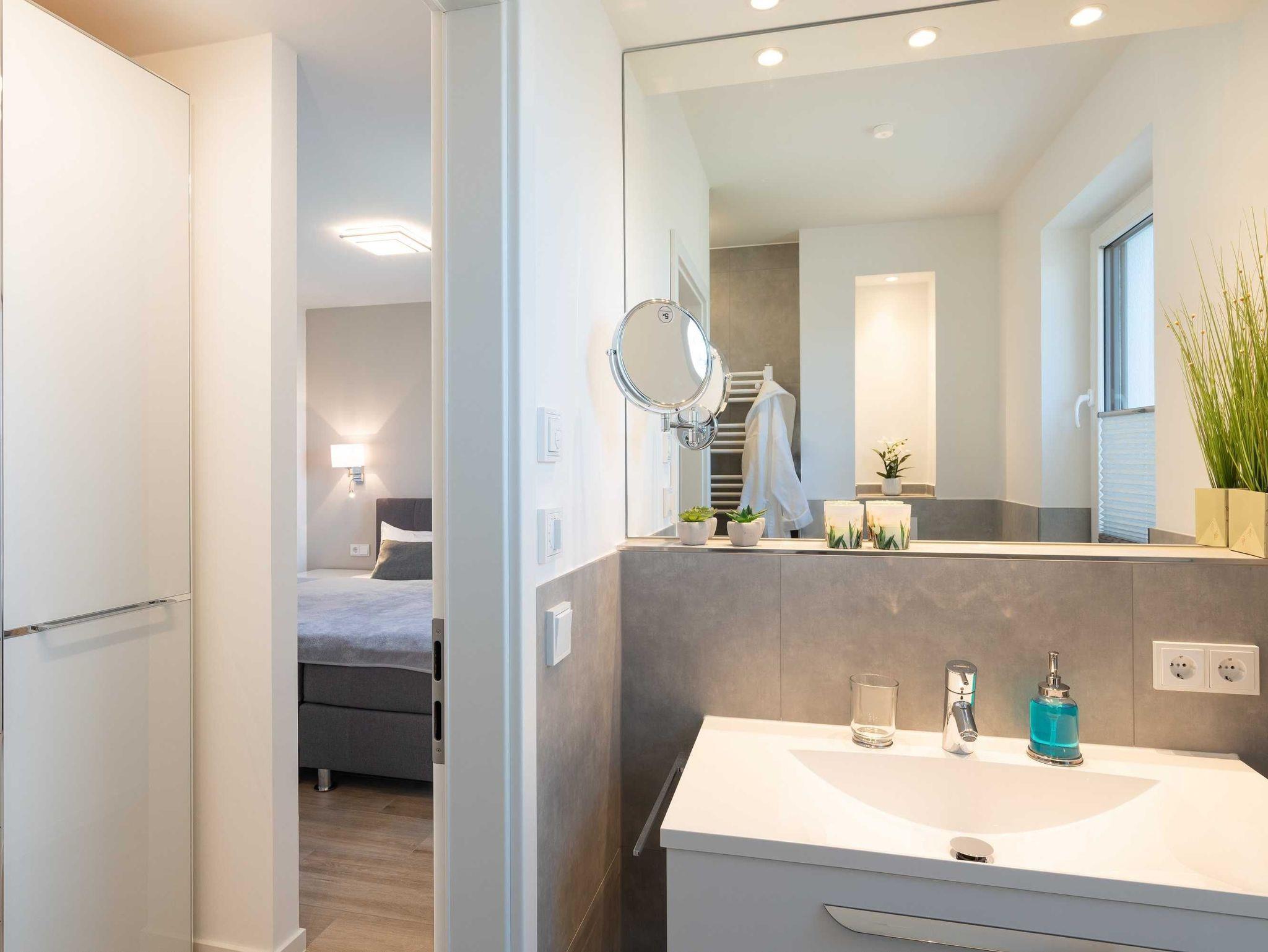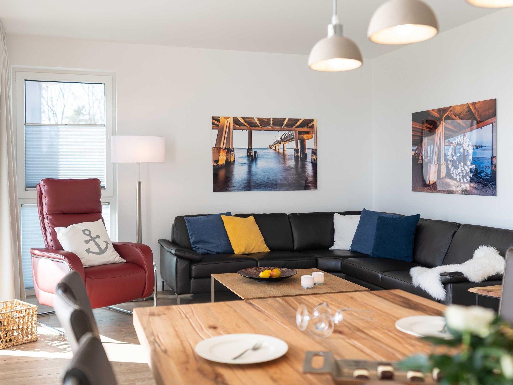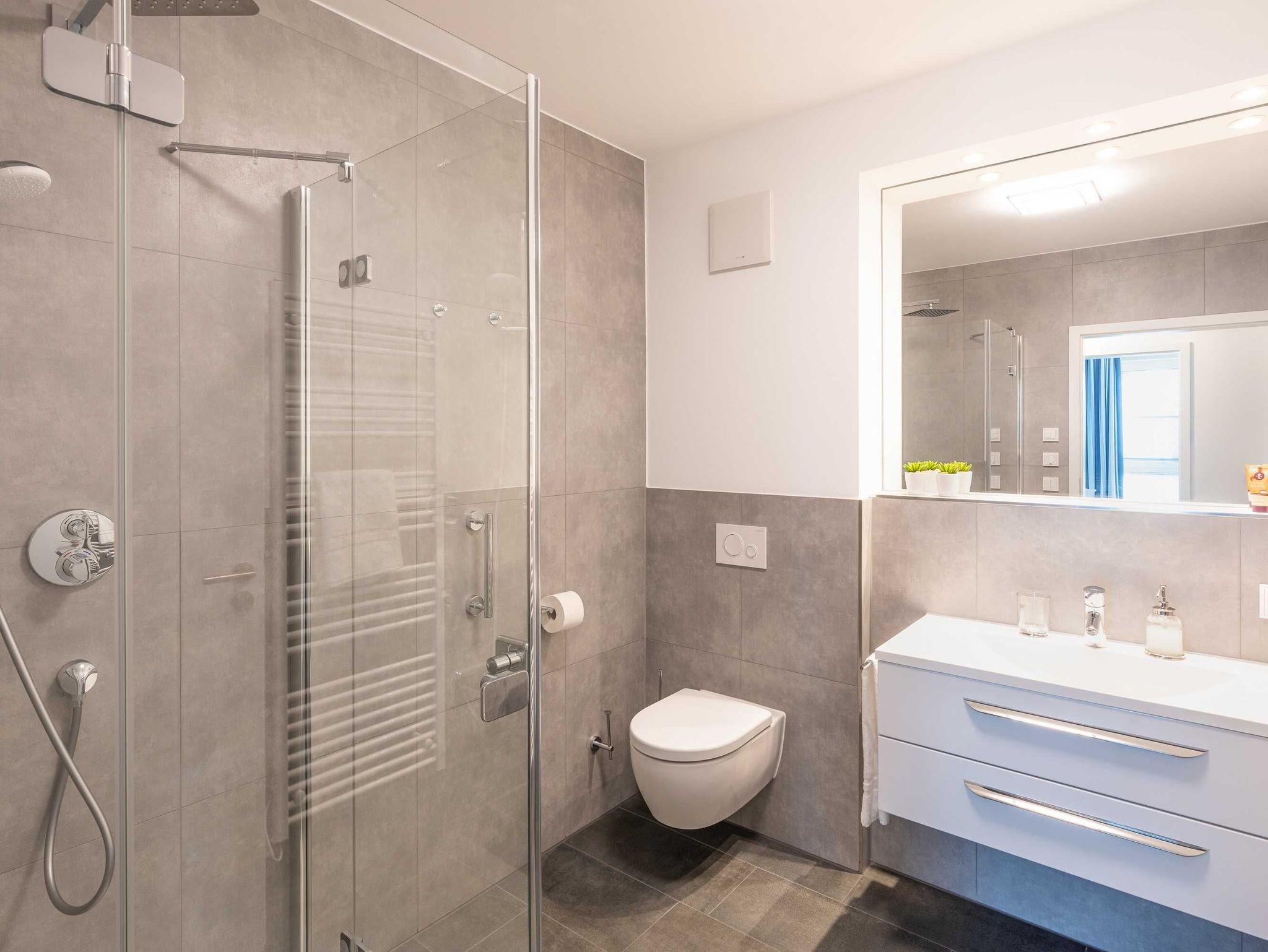 Diese luxuriöse 4-Zimmer-Wohnung im ersten Obergeschoss von Haus 6 (Aufzug vorhanden) mit Platz für maximal 6 Personen verfügt über eine Wohnfläche von 100 m² und hat 3 Schlafzimmer sowie 2 voll ausgestattete Duschbäder. Die große Sonnenterrasse mit 17 m² liegt in idealer Süd-Ausrichtung. Die Wohnung ist modern eingerichtet mit offenem Wohn-Essbereich, großem Esstisch, Ledersofa sowie Smart-TV (inkl. Sky-Abo). Die hochwertig ausgestattete Küche, offen zum Wohnbereich, lässt keine Wünsche offen. Erholsamer Schlaf in den beiden Schlafzimmern mit Boxspringbetten und Smart-TV ist garantiert. Im dritten Schlafzimmer befindet sich ein bequemes Schlafsofa (Liegefläche: 1,60 x 2,00 m) und ein Smart-TV. Das Badezimmer en Suite ist mit einer begehbaren Dusche ausgestattet. Auf dem großen, überdachten Sonnenbalkon mit Essgruppe und zwei Relax-Sesseln, Fußhockern sowie einem Sonnenschirm können Sie die Seele baumeln lassen.