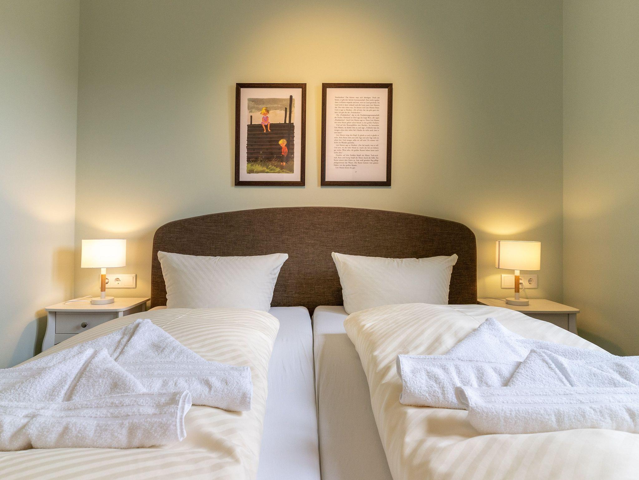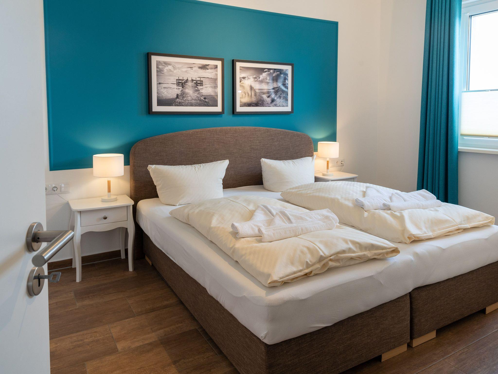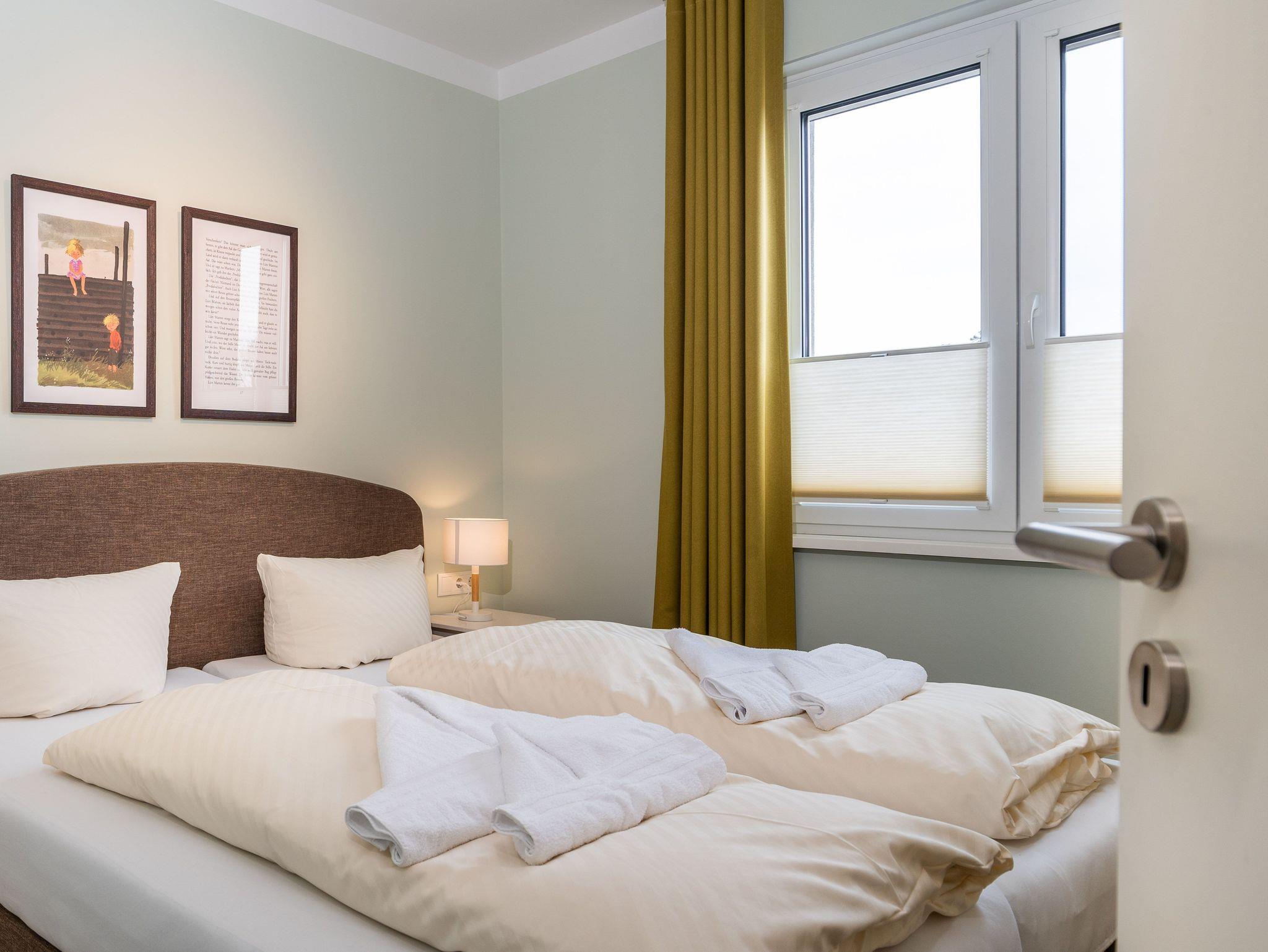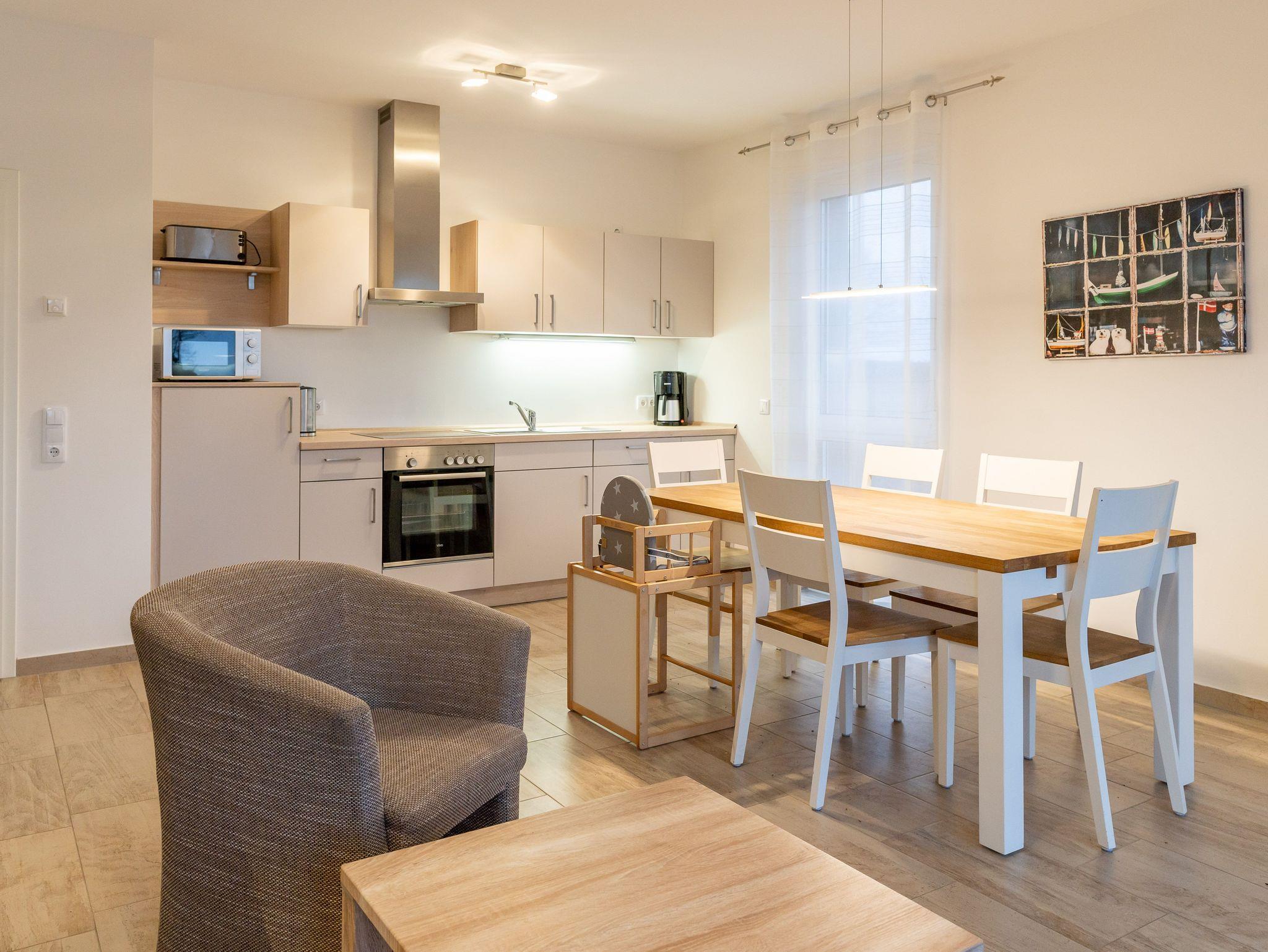 Unsere Ferienwohnung ist großzügig geschnitten und für bis zu 6 Personen geeignet, Erdgeschoß, 87 qm, 2 Schlafzimmer zzgl. Schlafcoach im Wohnzimmer, 1 Terrasse, 2 Bäder, Küche