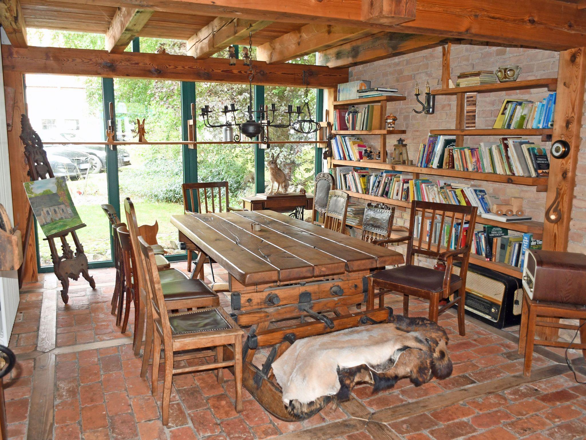 Gemeinschaftsbereich mit Kaminofen, einem großen Tisch und einer kleinen Bücherauswahl.