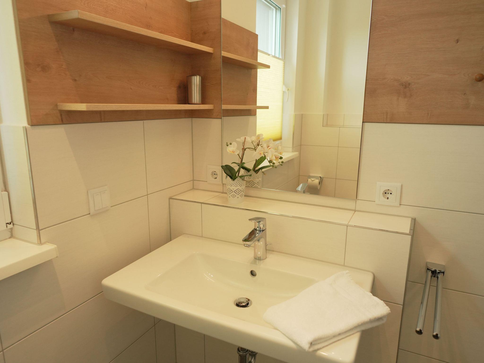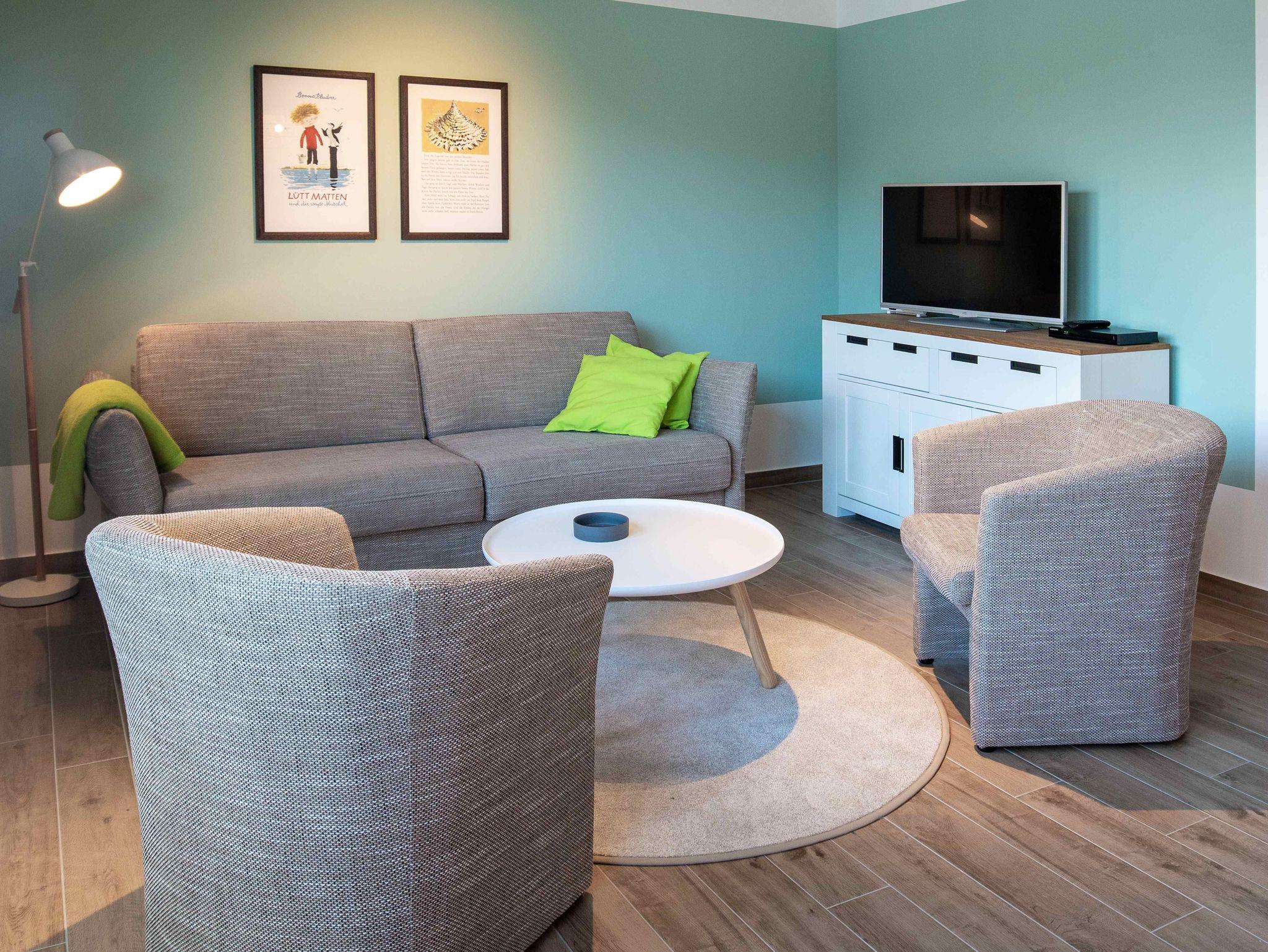 Unsere Ferienwohnung ist großzügig geschnitten und für bis zu 6 Personen geeignet, Erdgeschoß, 86 qm, 2 Schlafzimmer zzgl. Schlafcoach im Wohnzimmer, 1 Terrasse, 2 Bäder, Küche