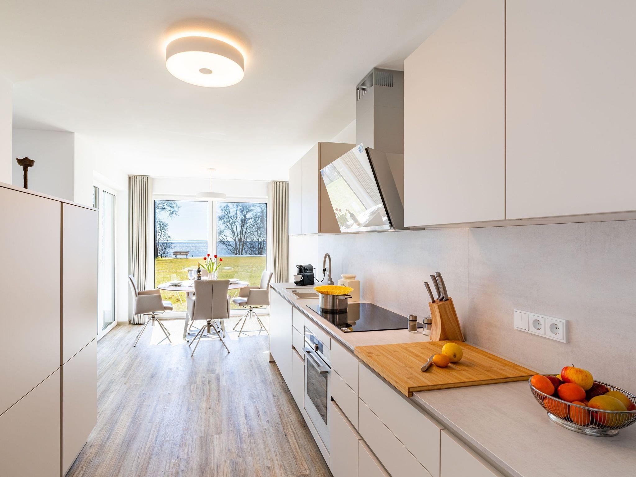 Die moderne Küchenzeile ist mit hochwertigen Markengeräten ausgestattet, darunter ein Herd, eine Kaffeefiltermaschine, eine Nespresso-Maschine, eine Mikrowelle, ein Backofen, ein Kühlschrank mit Gefrierfach sowie eine Spülmaschine. In den Schränken finden Sie ausreichend Geschirr, Besteck sowie Töpfe und Pfannen. Der Esstisch lädt ein, gemeinsam ein Frühstück zu genießen, während Sie vielleicht einen Fischer beim Auswerfen seiner Netze beobachten können.