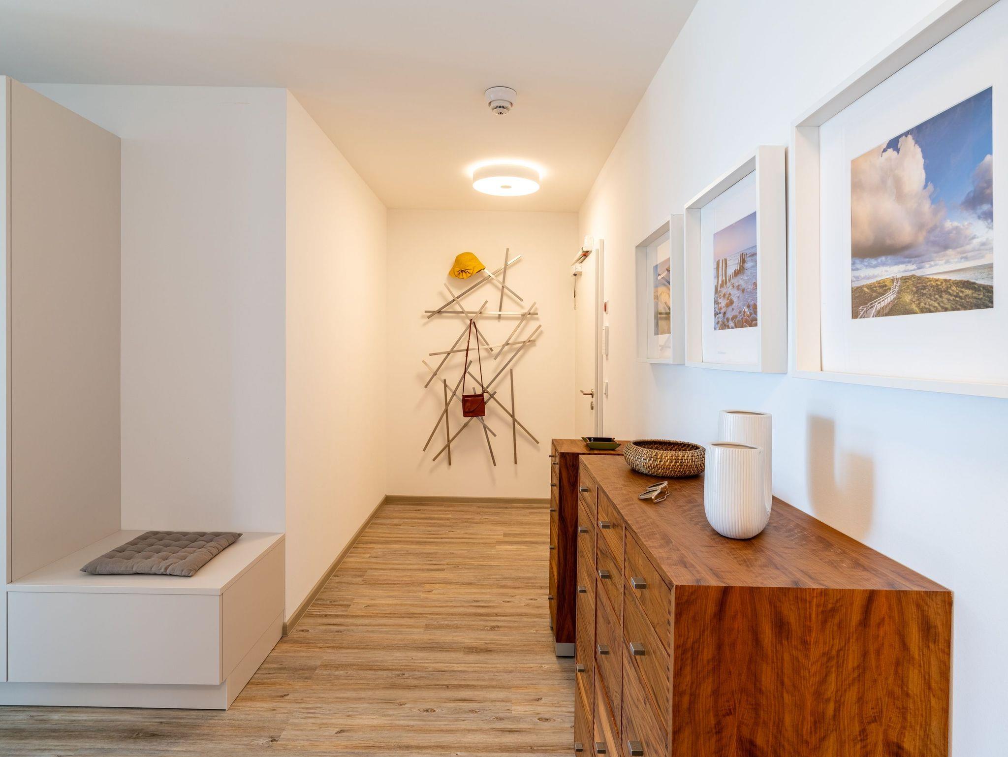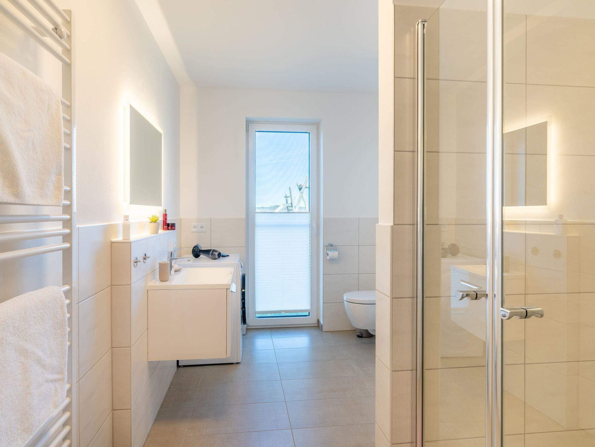 Das geschmackvoll eingerichtete Badezimmer bietet Ihnen alles, was Sie für Ihr Wohlbefinden brauchen: eine großzügige, ebenerdige Dusche sorgt für erfrischende Momente, während Waschtisch, WC, Waschmaschine und ein Fön den Komfort perfekt abrunden. Ein Ort, an dem Sie entspannt in den Tag starten oder ihn sanft ausklingen lassen können.
