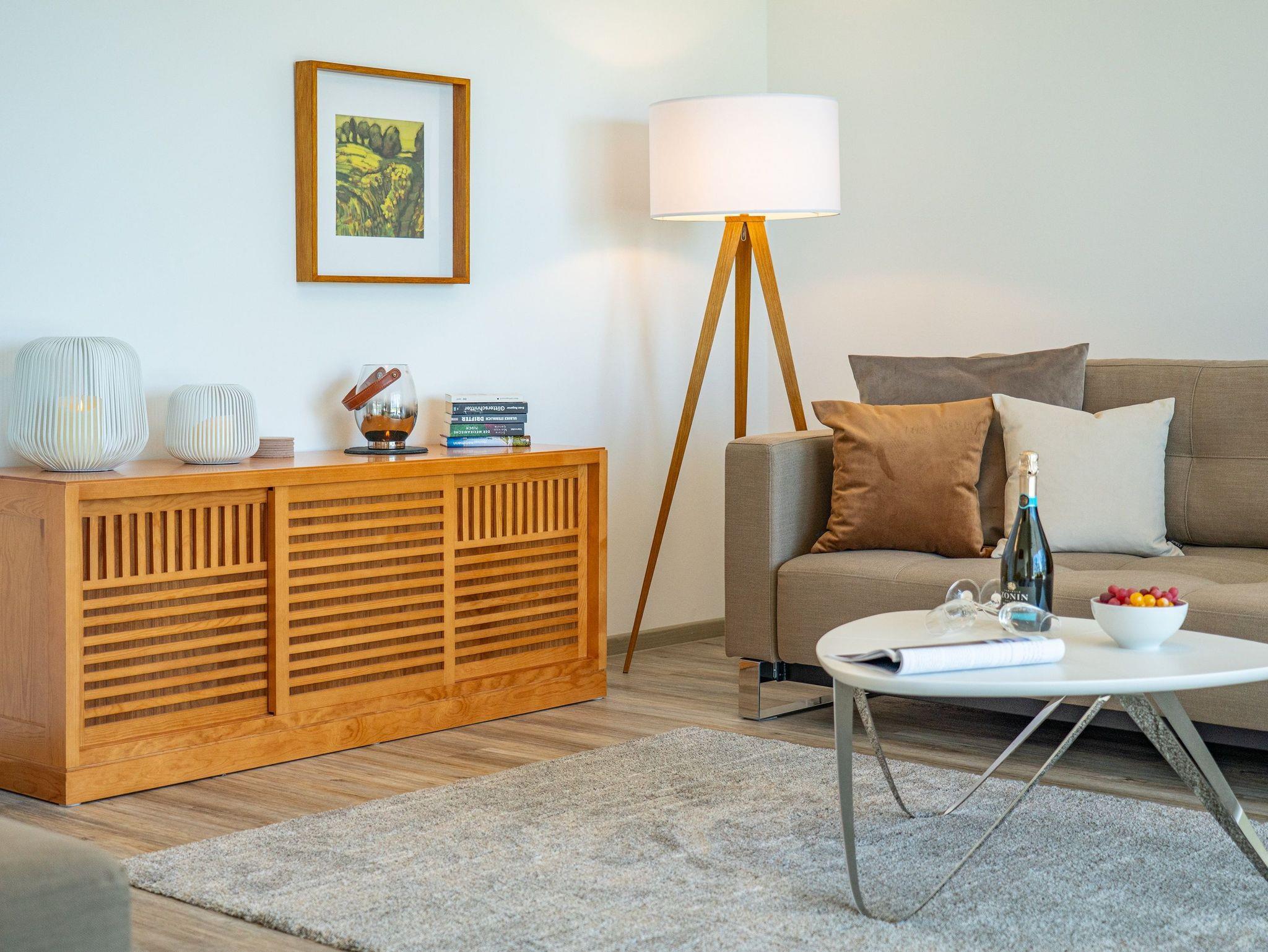 Der lichtdurchflutete Wohnbereich empfängt Sie mit einem gemütlichen Sofa und einem modernen Smart-TV. Von hier aus gelangen Sie direkt auf die großzügige Südost-Terrasse, um Ihre Mahlzeiten im Freien zu genießen und dabei den Blick in die liebevoll gestaltete Gartenanlage sowie auf das glitzernde Wasser des Stettiner Haffs schweifen zu lassen.